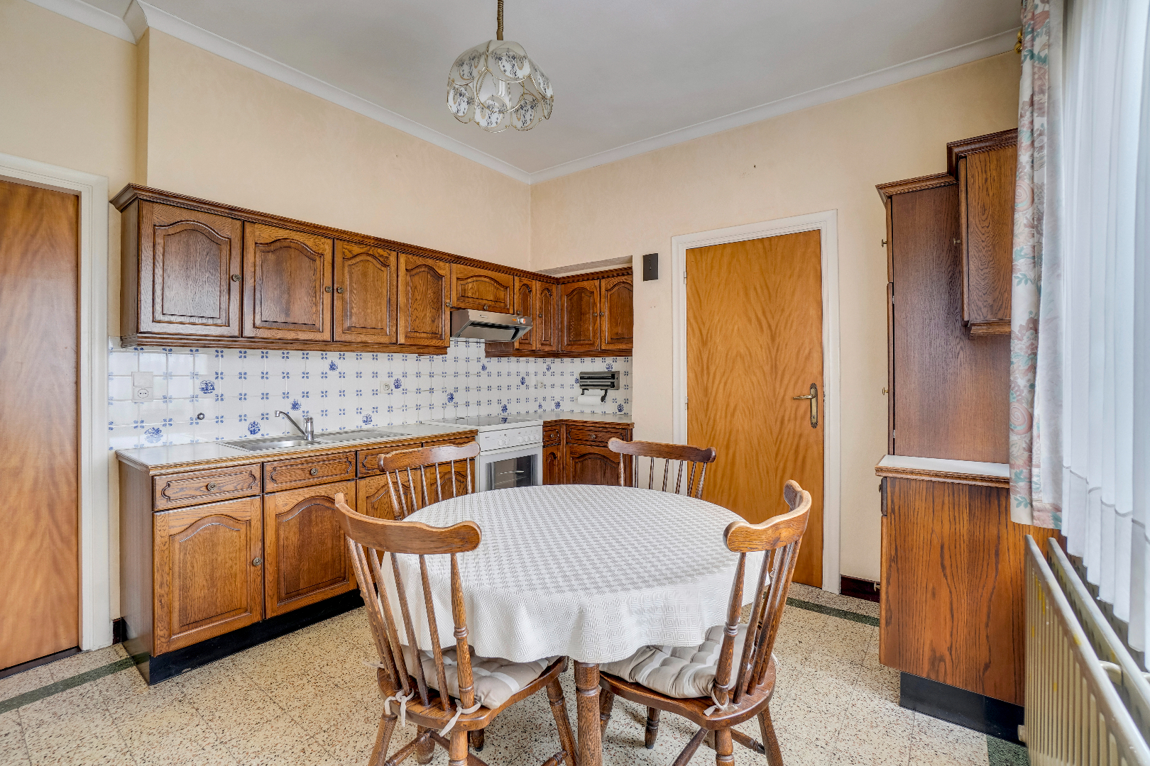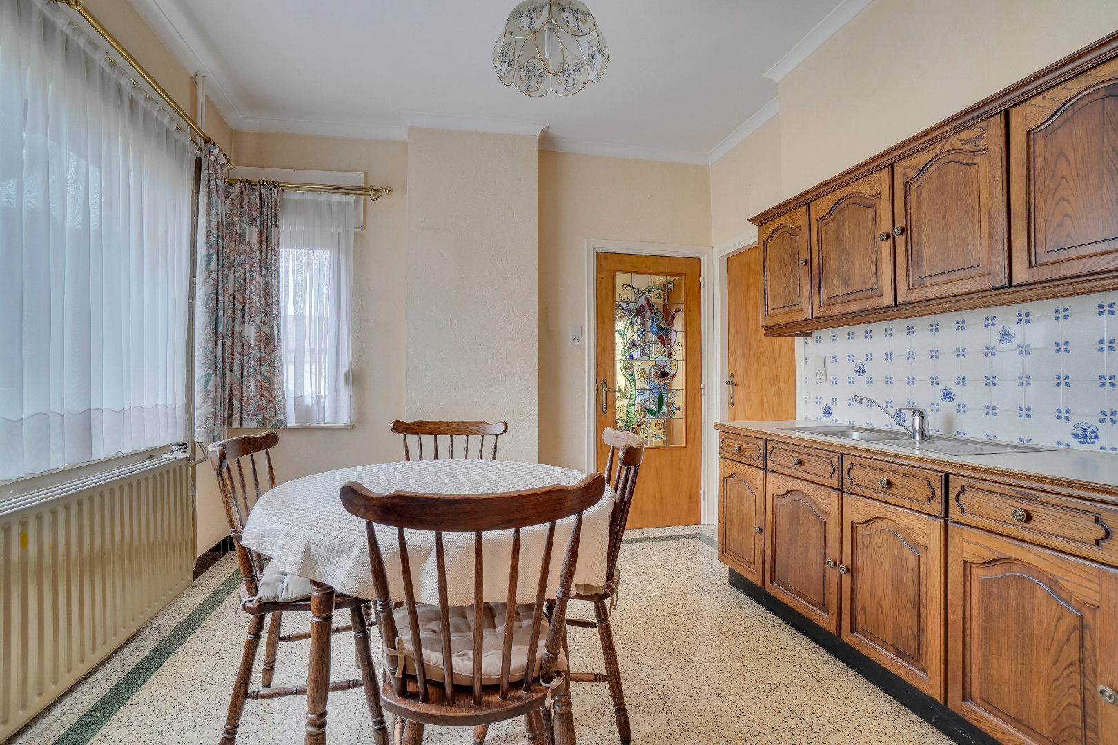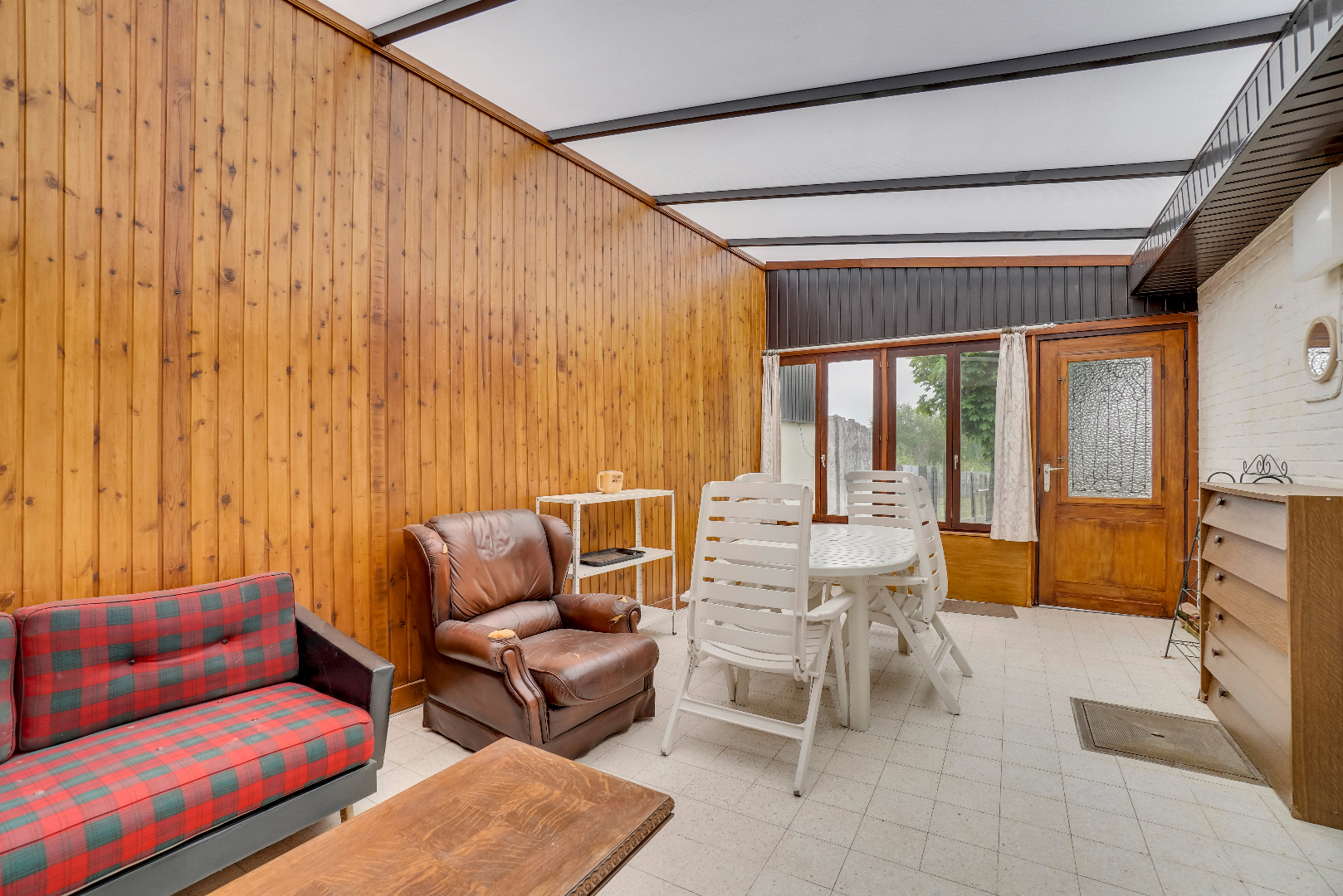 De benedenverdieping is voorzien van een leefruimte met aparte keuken. Vanuit de keuken is er toegang tot de bijkeuken met gastentoilet alsook tot de veranda dat een mooi zicht heeft op de tuin.