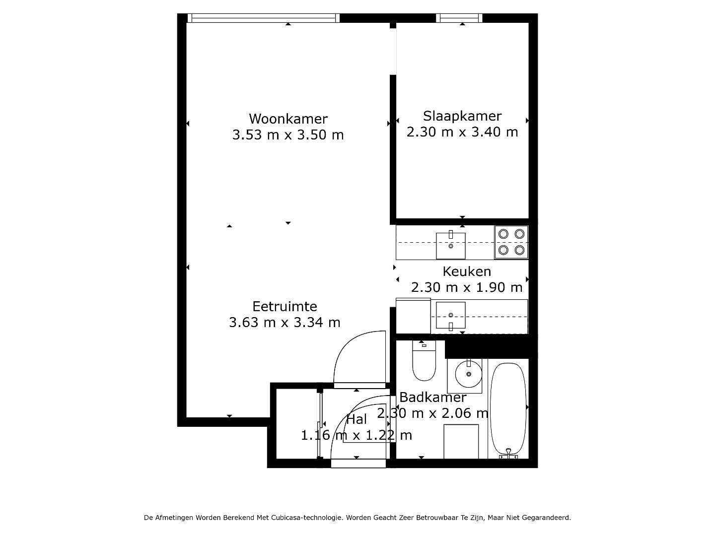 Bij binnenkomst is er toegang naar de leefruimte van circa 25 m². Verder beschikt dit appartement over een comfortabele keuken, een badkamer met wastafel, ligbad en toilet en een slaapkamer. De slaapkamer heeft een oppervlakte van +/- 8 m².