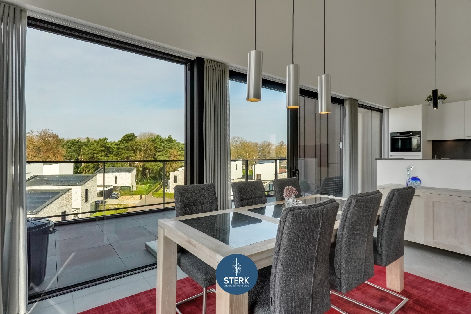 De open keuken sluit naadloos aan op de leefruimte en is uitgerust met kwalitatieve toestellen, waaronder een inductie kookplaat, ingebouwde koelkast en combi-oven. Het kookeiland met zitgelegenheid maakt deze ruimte niet alleen praktisch, maar ook bijzonder gezellig en uitnodigend.