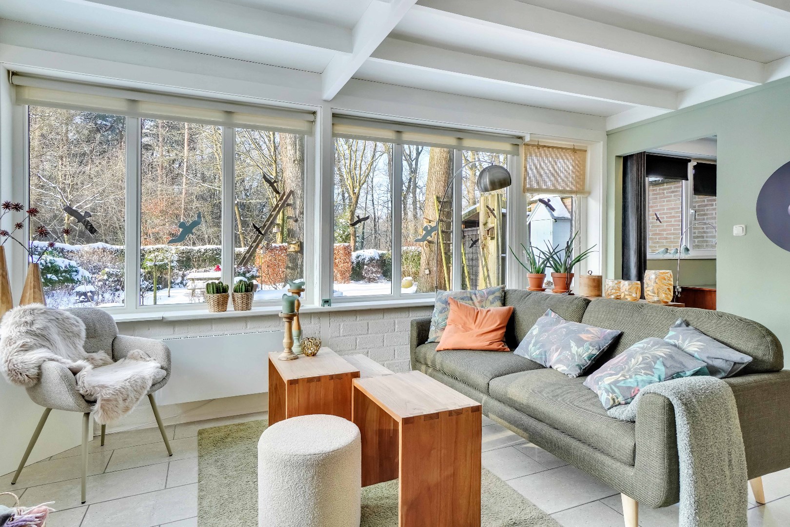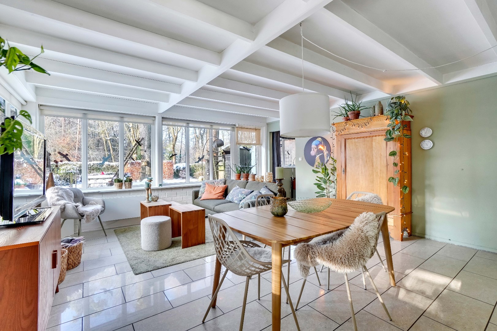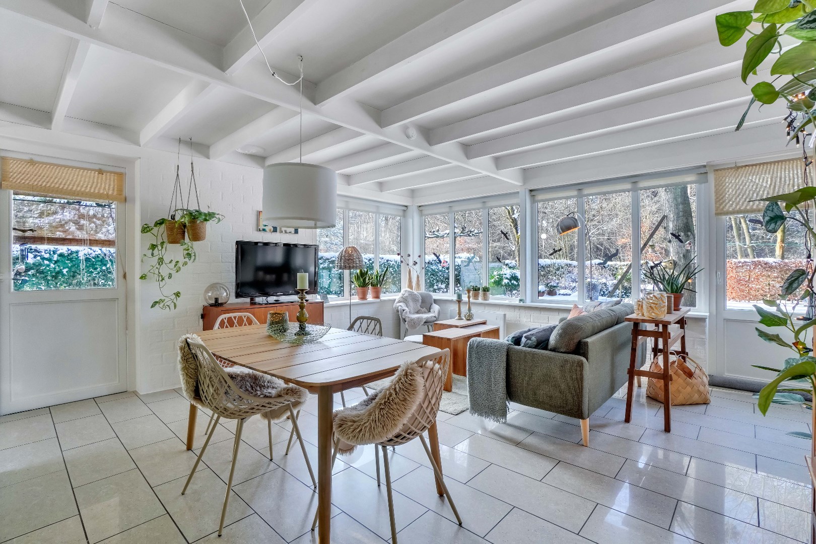 Bij binnenkomst vanuit de inkomhal begeeft men zich in de leefruimte, voorzien van grote raampartijen. Hierdoor komt er veel natuurlijk licht binnen en staat men continue in contact met het buitenleven.