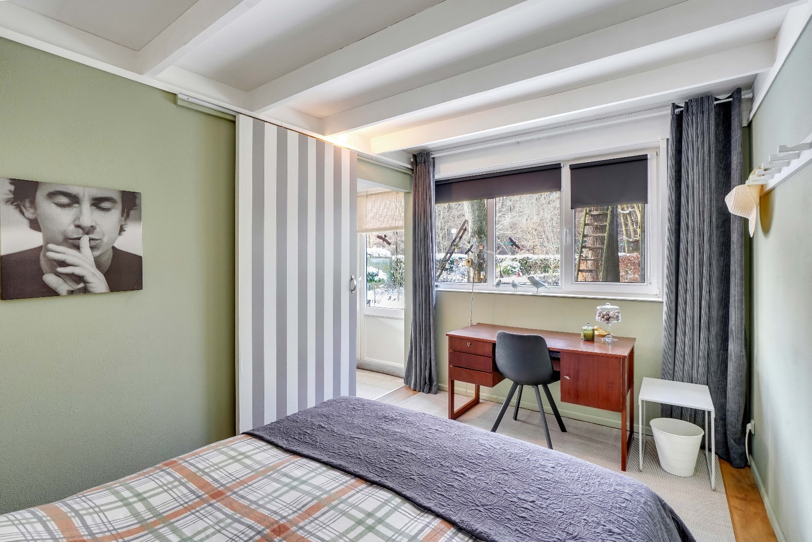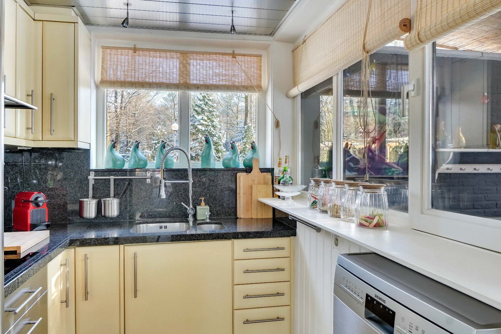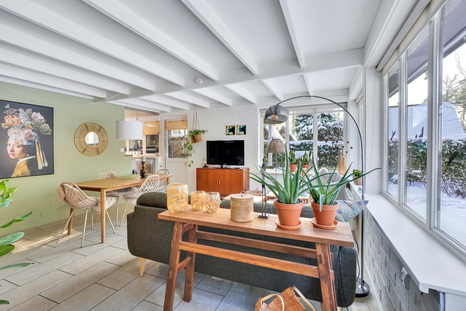Bij binnenkomst vanuit de inkomhal begeeft men zich in de leefruimte, voorzien van grote raampartijen. Hierdoor komt er veel natuurlijk licht binnen en staat men continue in contact met het buitenleven.