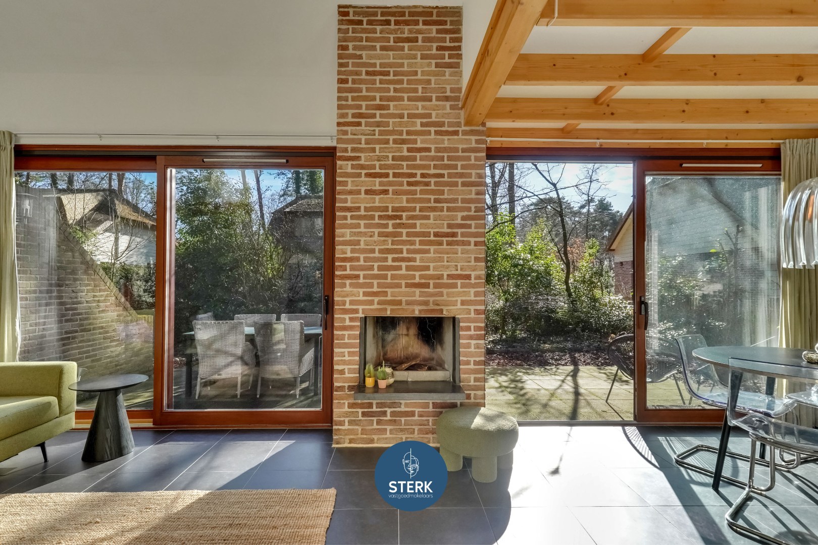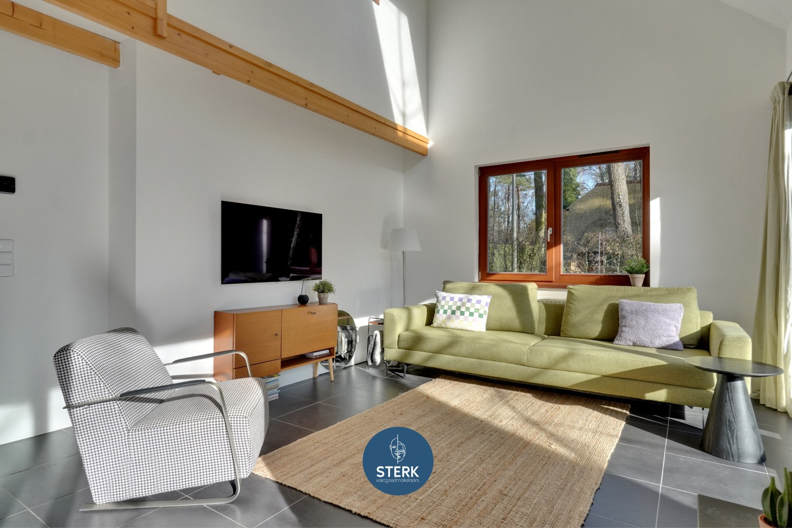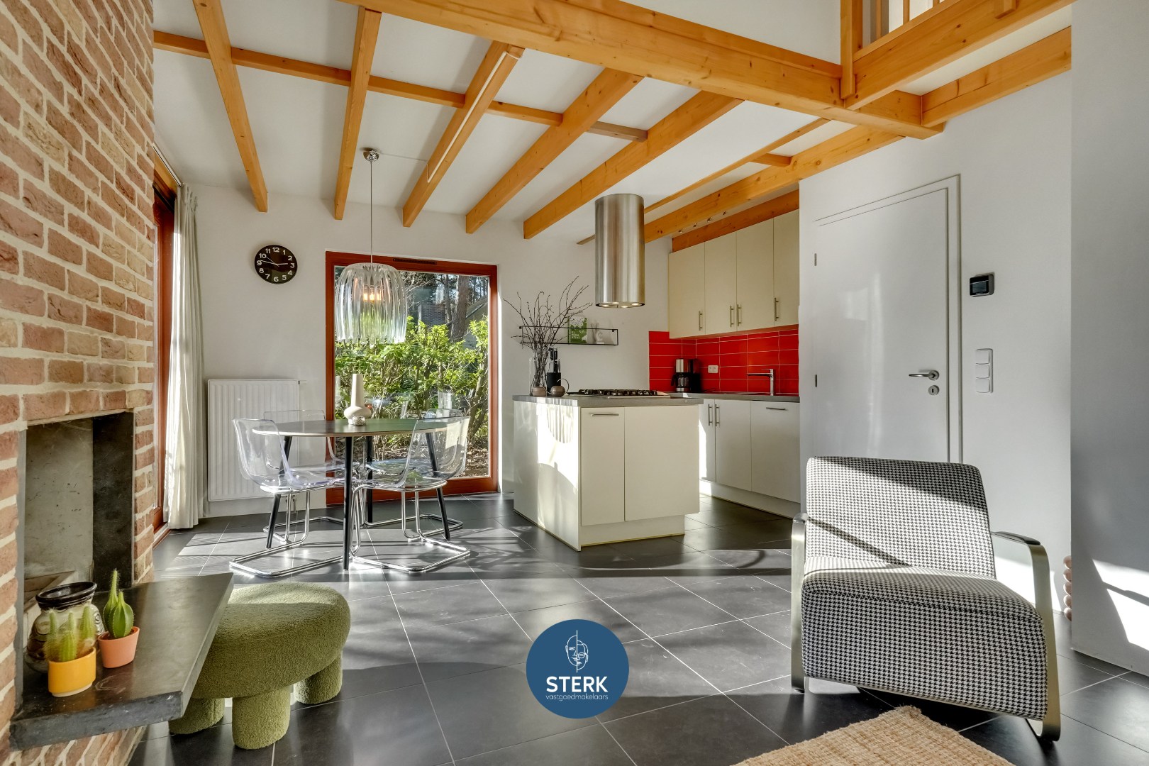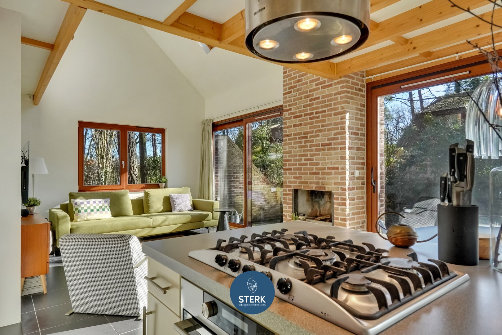 Via de inkomhal betreedt men de leefruimte. Meteen valt het hoge plafond op, dat samen met de zichtbare houten balken zorgt voor een aangenaam ruimtelijk gevoel en een warme, authentieke uitstraling. Grote raampartijen rondom laten overvloedig natuurlijk licht binnen en creëren een connectie met de omliggende tuin.