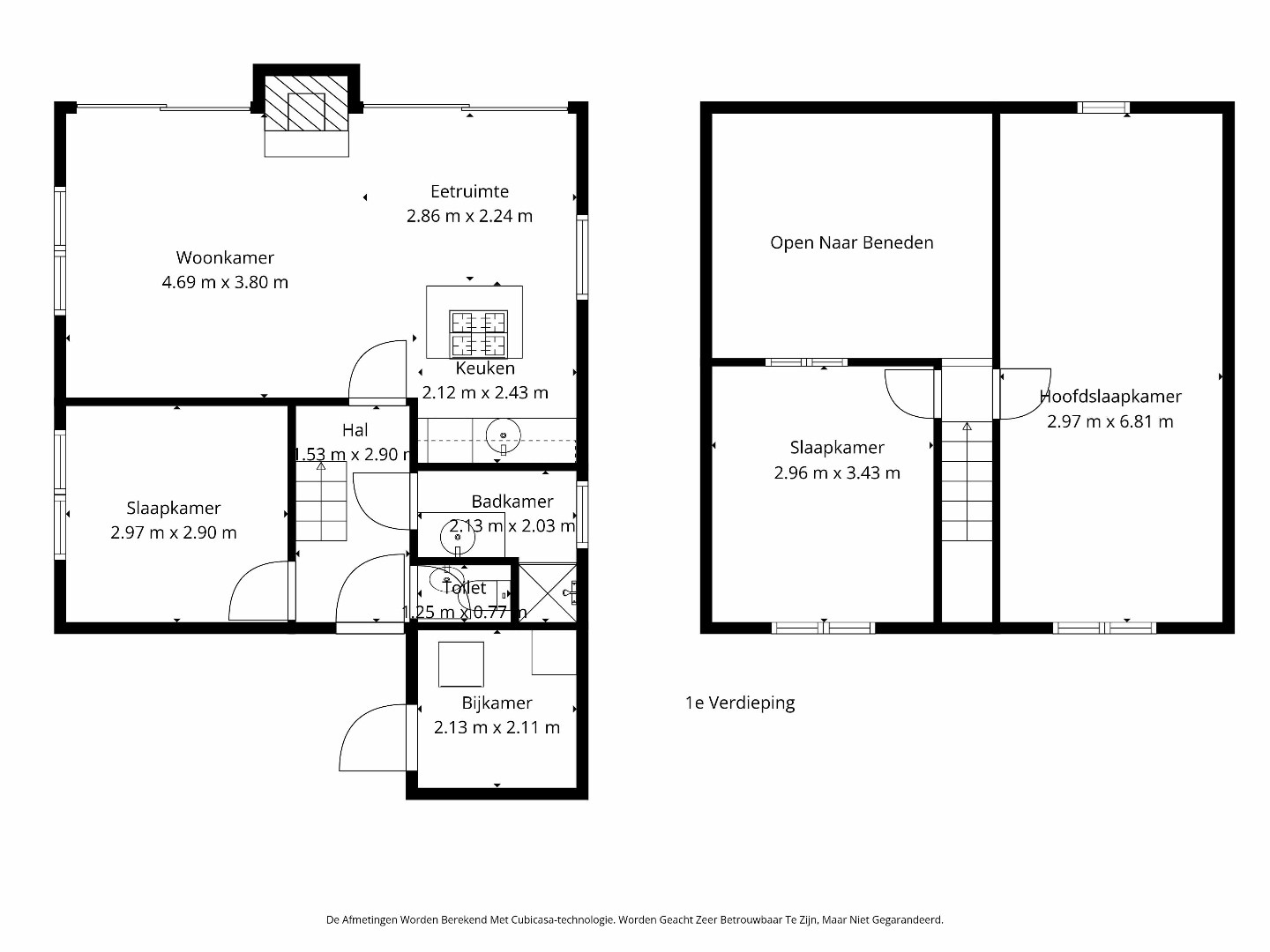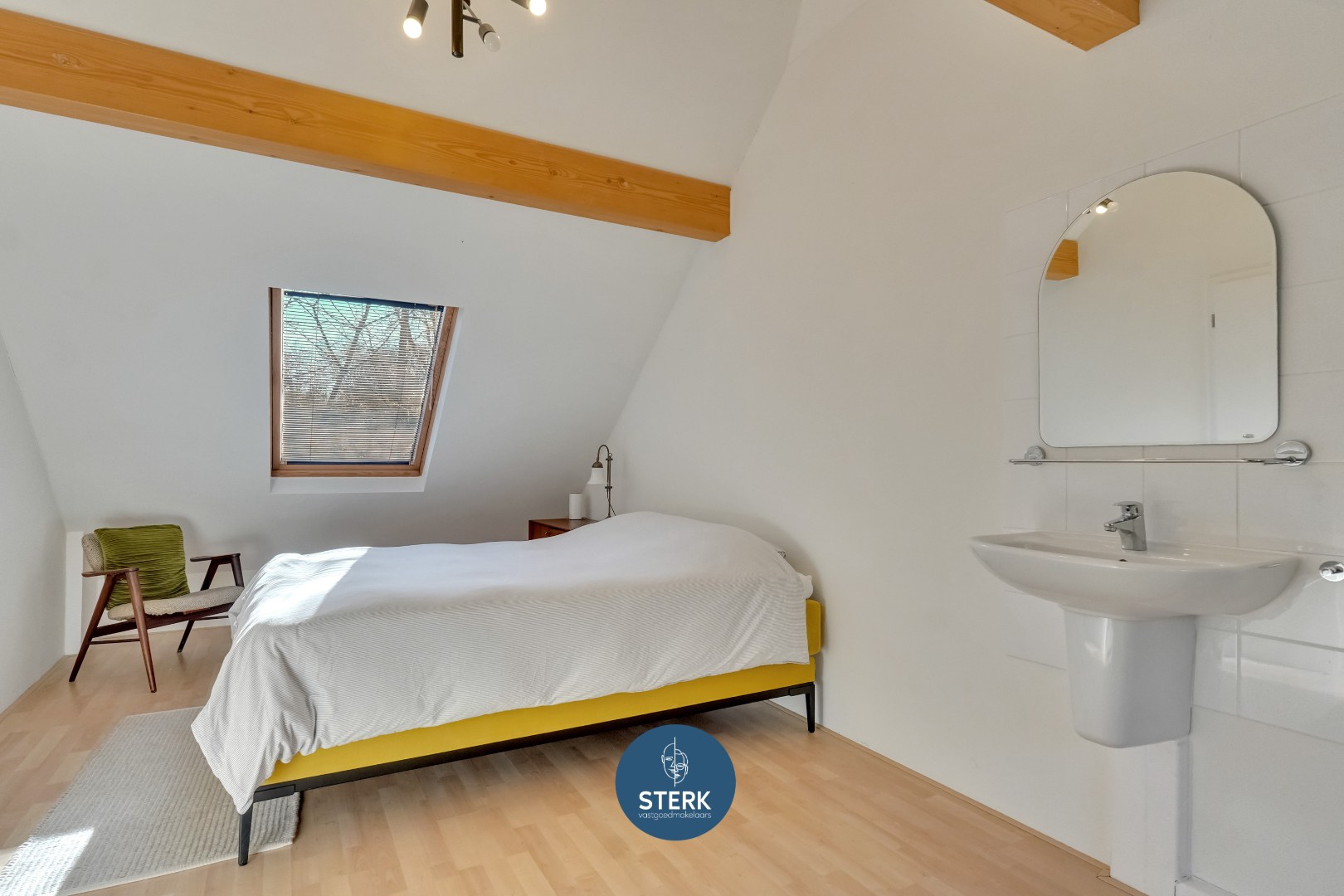 Op de eerste verdieping kijkt de overloop open naar beneden, wat het ruimtelijke karakter van de woning extra benadrukt. Hier bevinden zich 2 slaapkamers. De ruime hoofdslaapkamer is voorzien van een extra lavabo, wat zorgt voor bijkomend comfort. De tweede slaapkamer op deze verdieping is eveneens aangenaam van formaat en ideaal als logeerkamer, bureau of kinderkamer. Dankzij de dakramen en het hoge plafond genieten ook deze ruimtes van voldoende lichtinval en een open gevoel.
