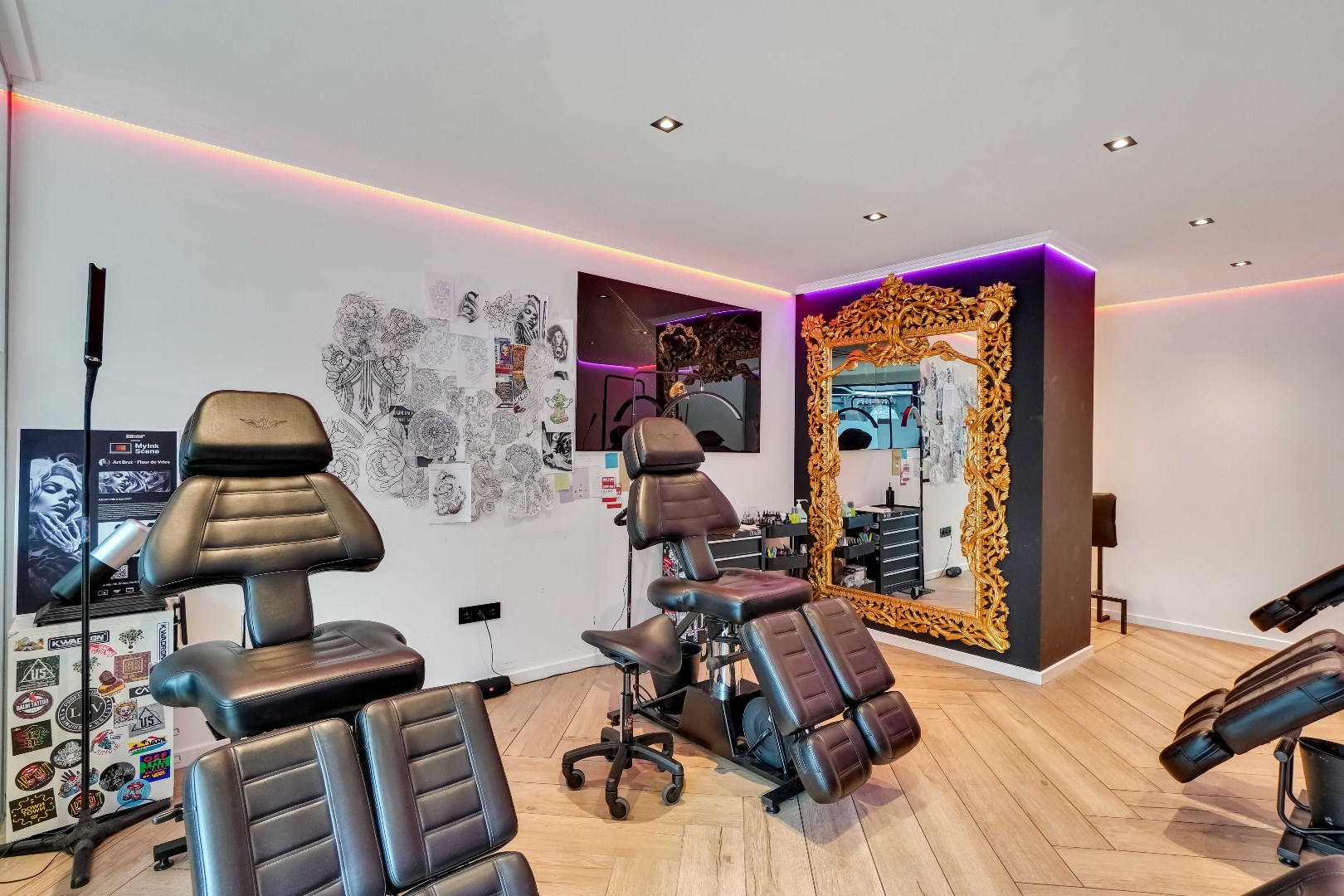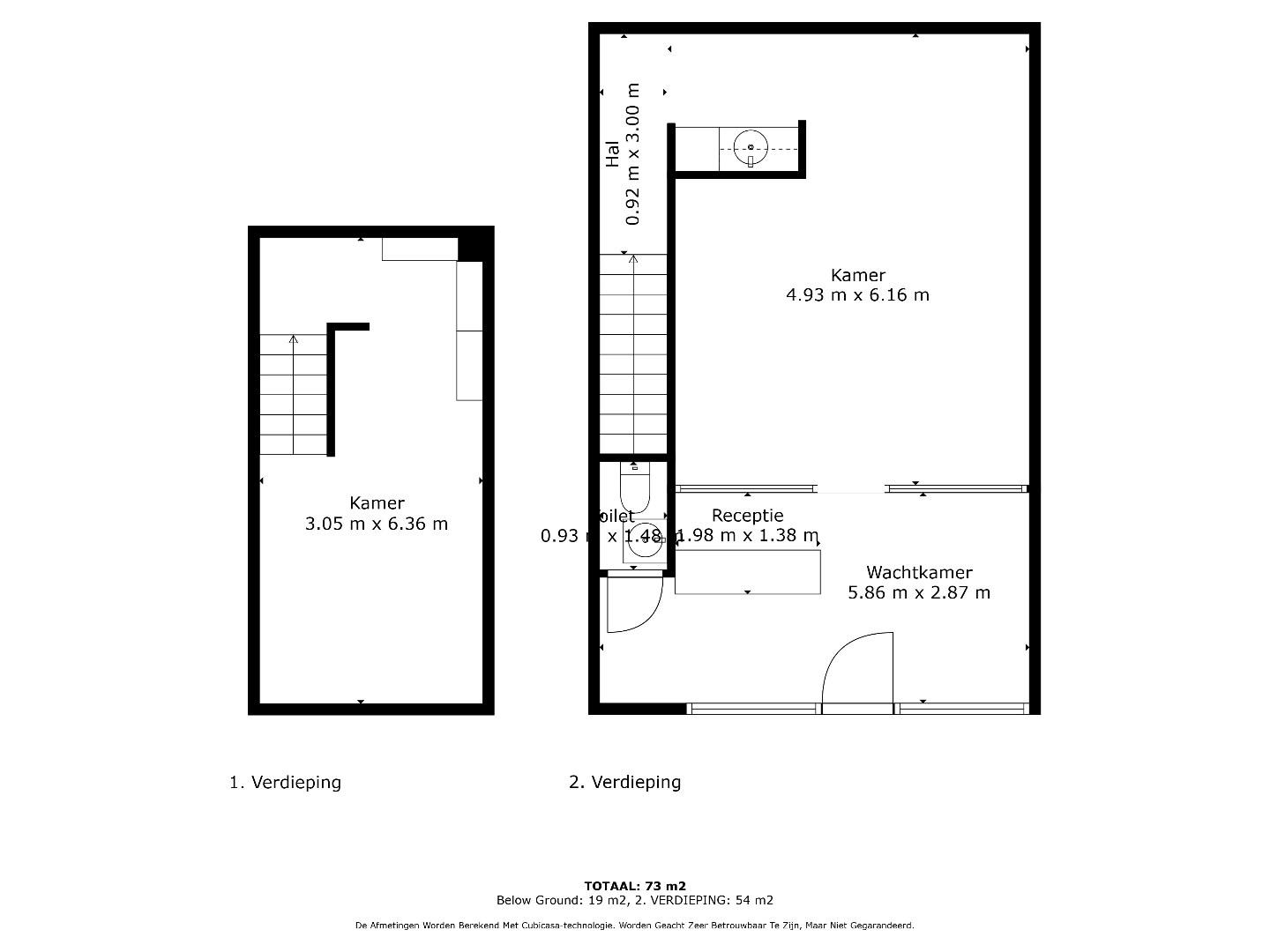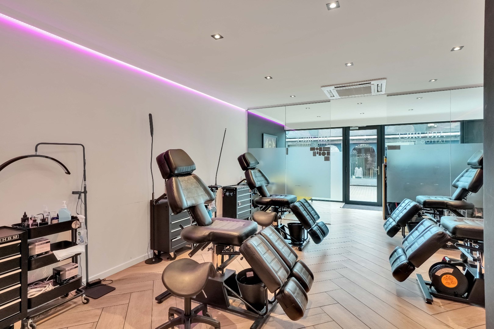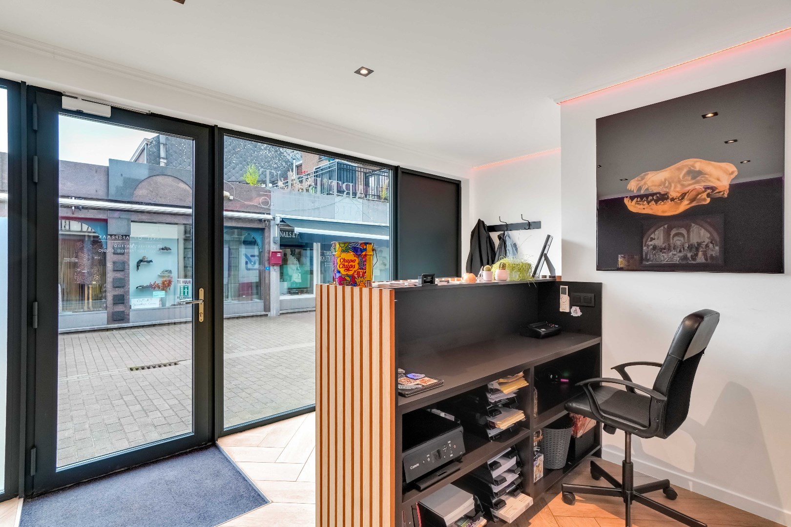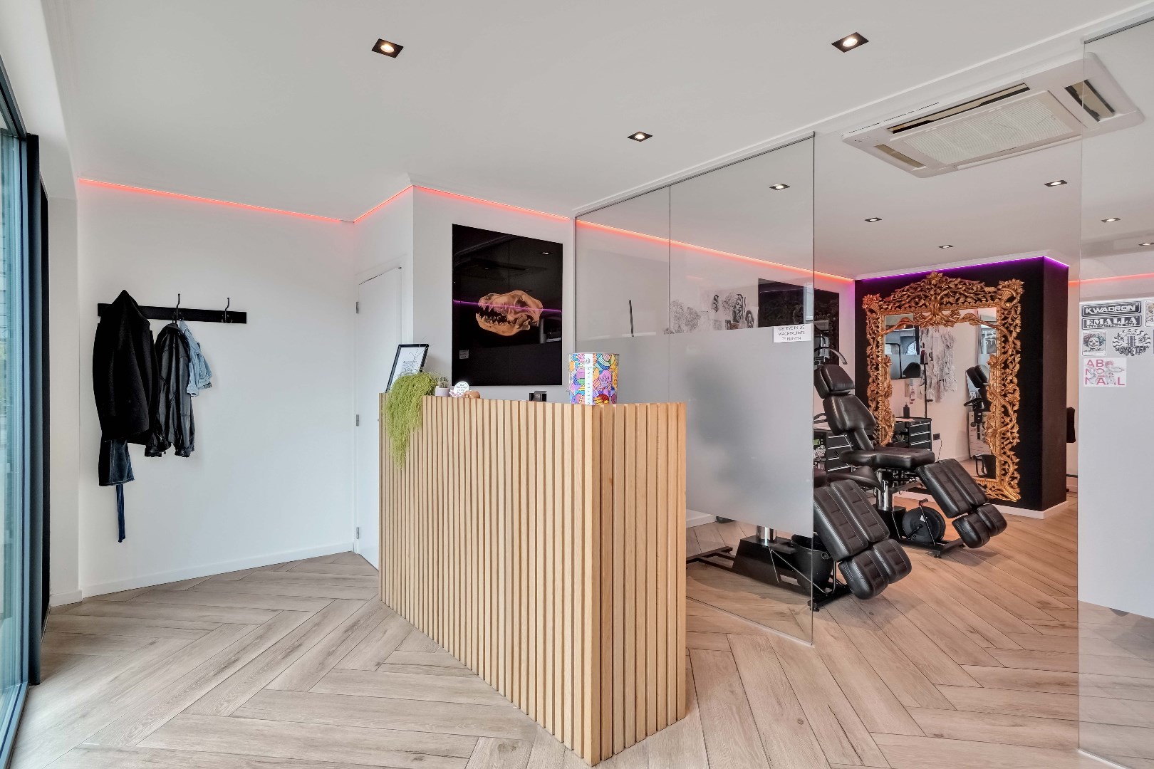 Voor de glazen wand is er momenteel een onthaal voorzien met apart toilet.