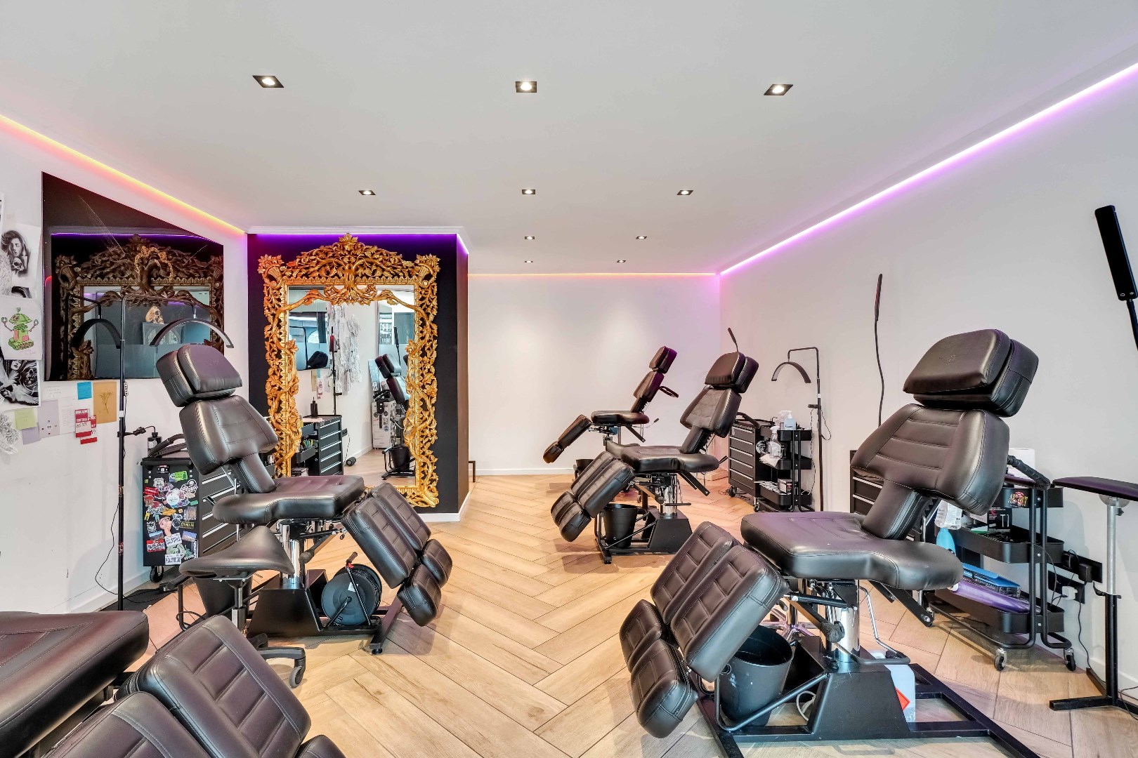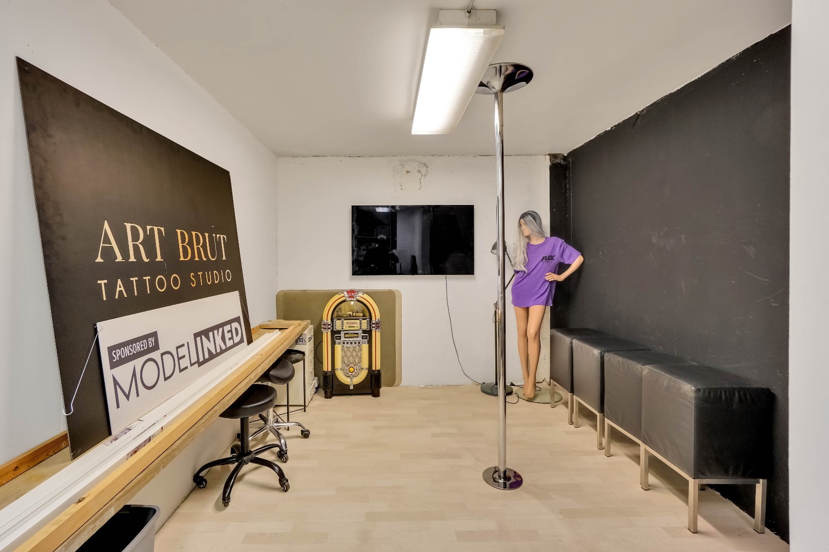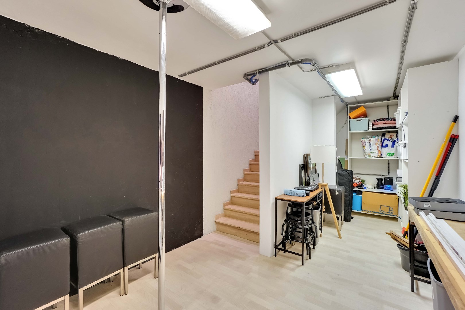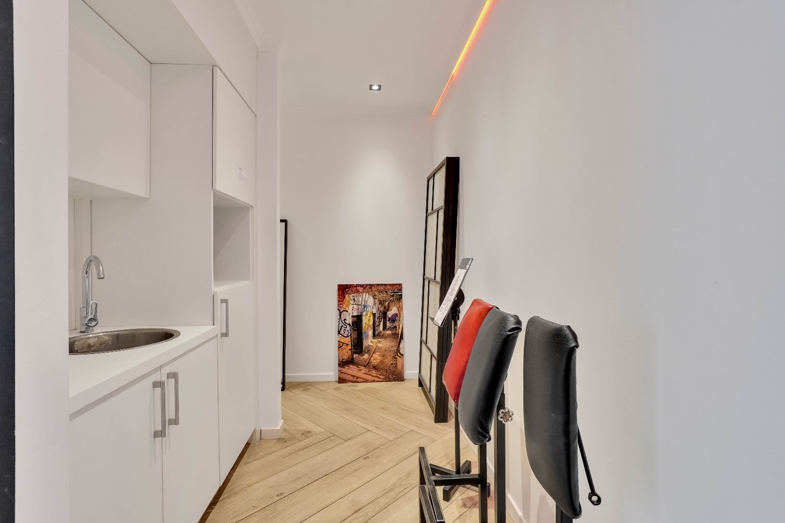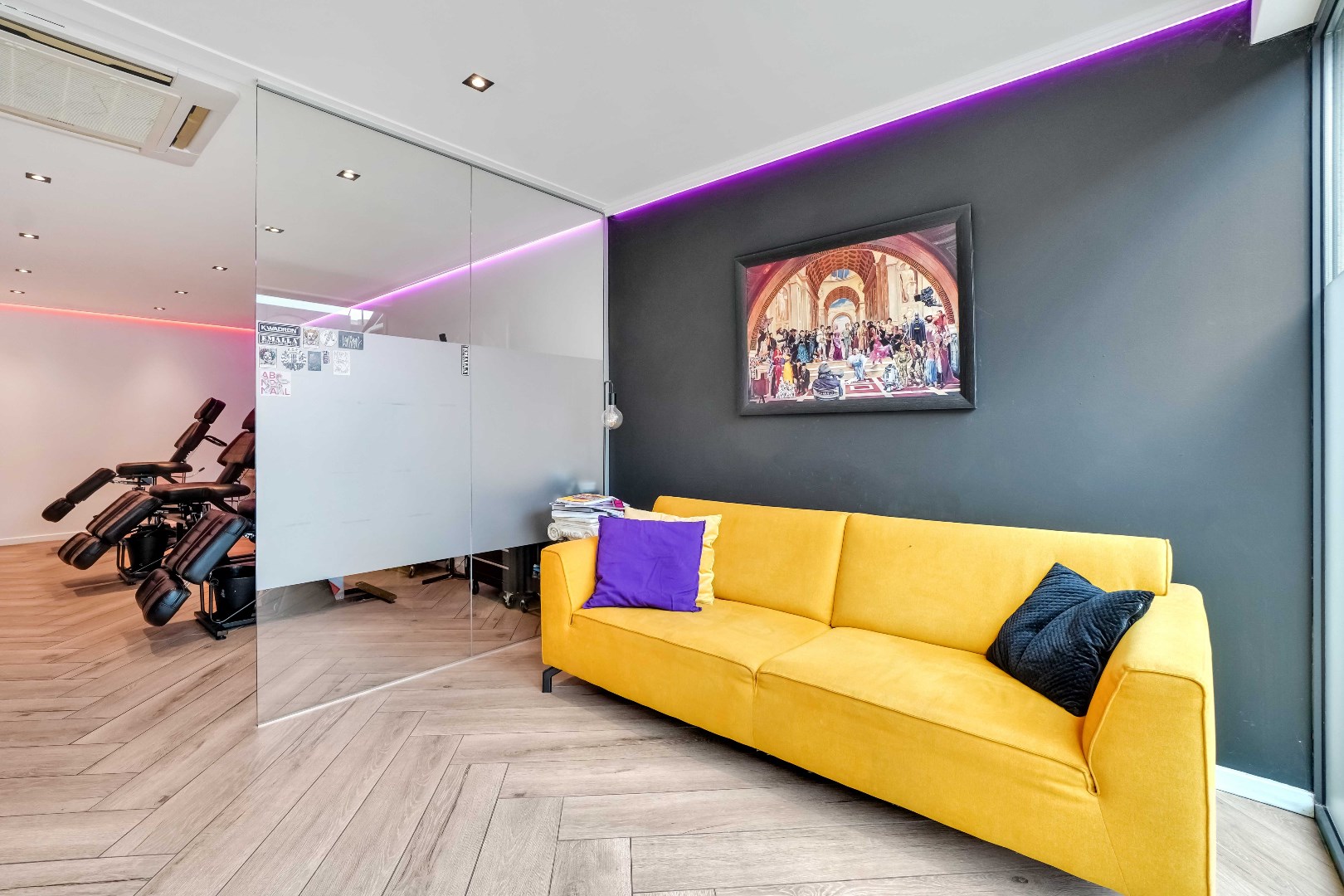Het pand bestaat uit één grote open ruimte, gescheiden door een glazen wand.