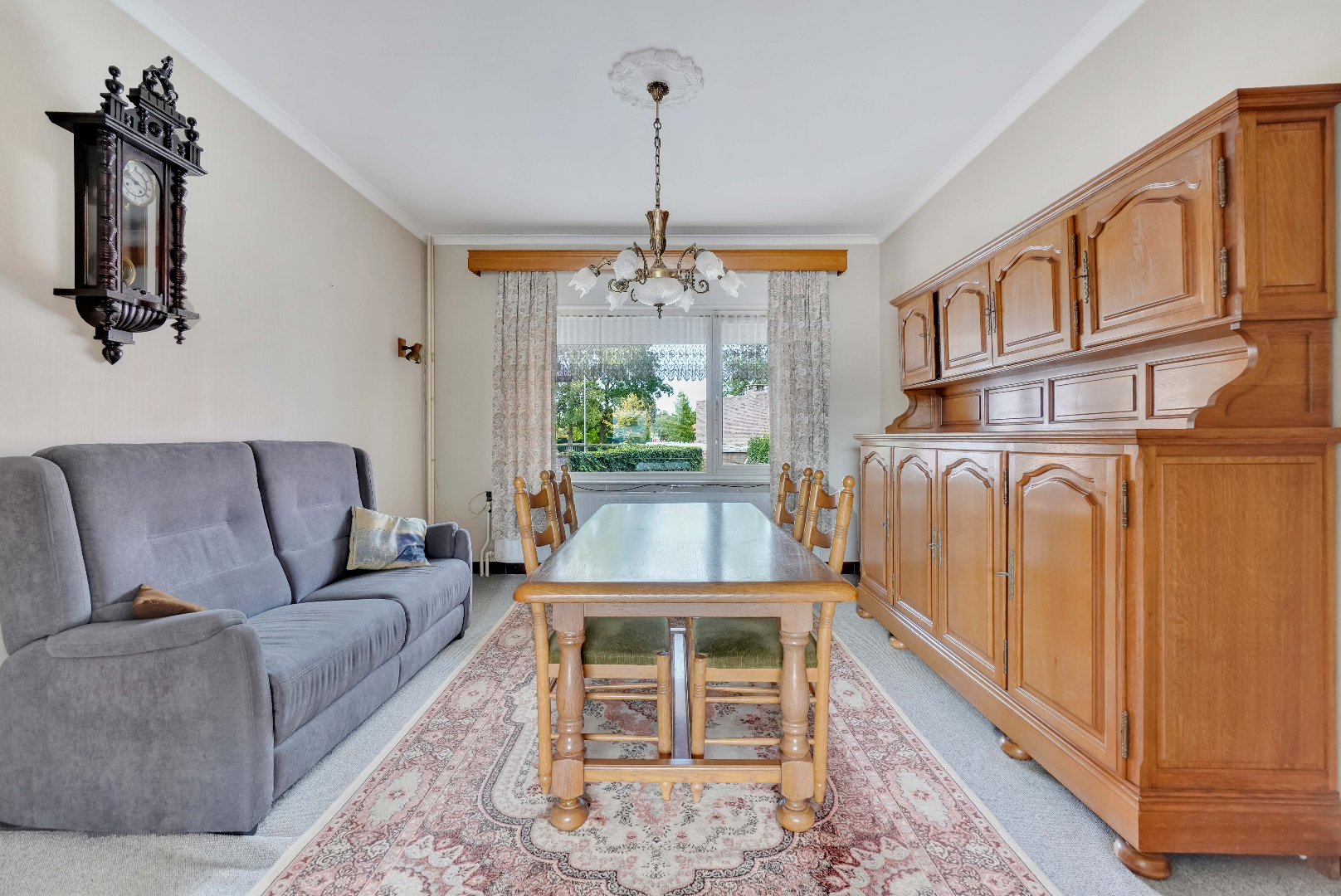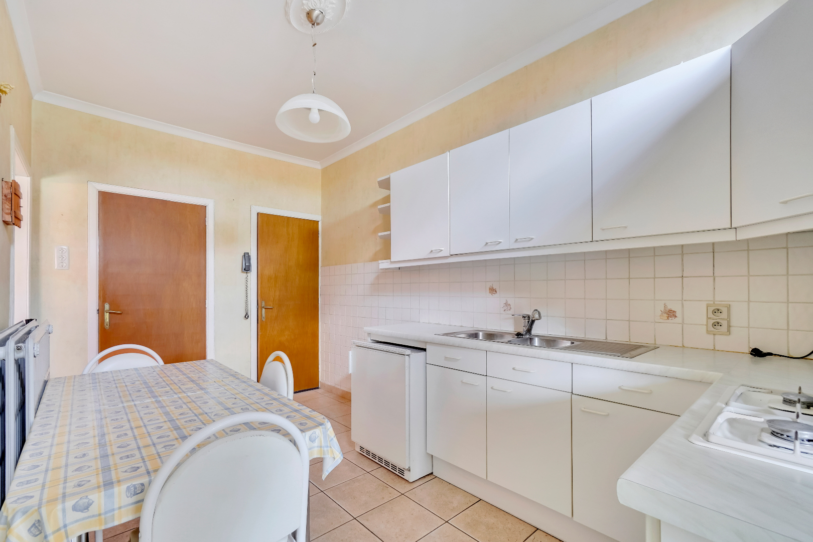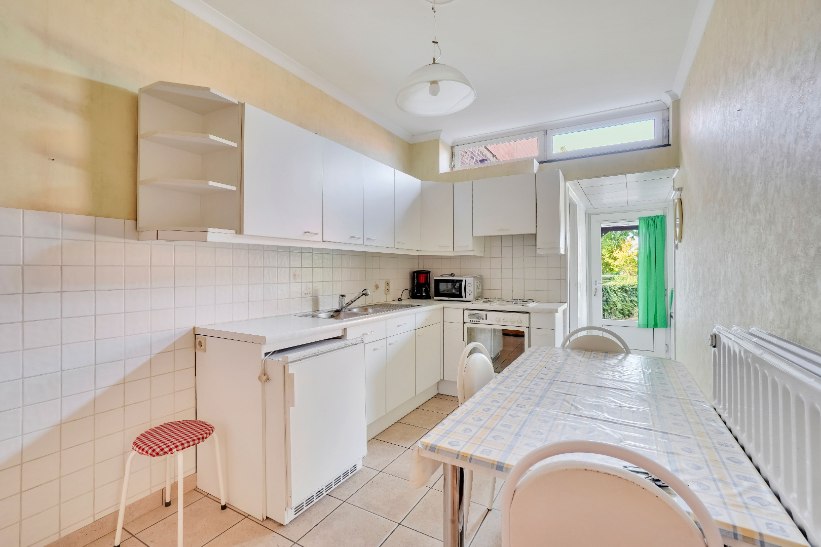 Via de inkomhal bereiken we de ruime woonkamer met zicht op de tuin. Hiernaast is een aparte keuken voorzien met toegang tot de badkamer alsook de tuin.