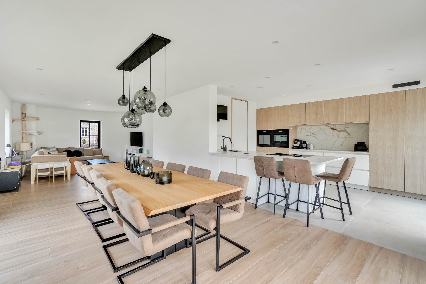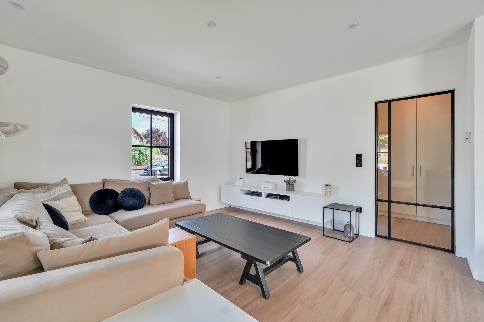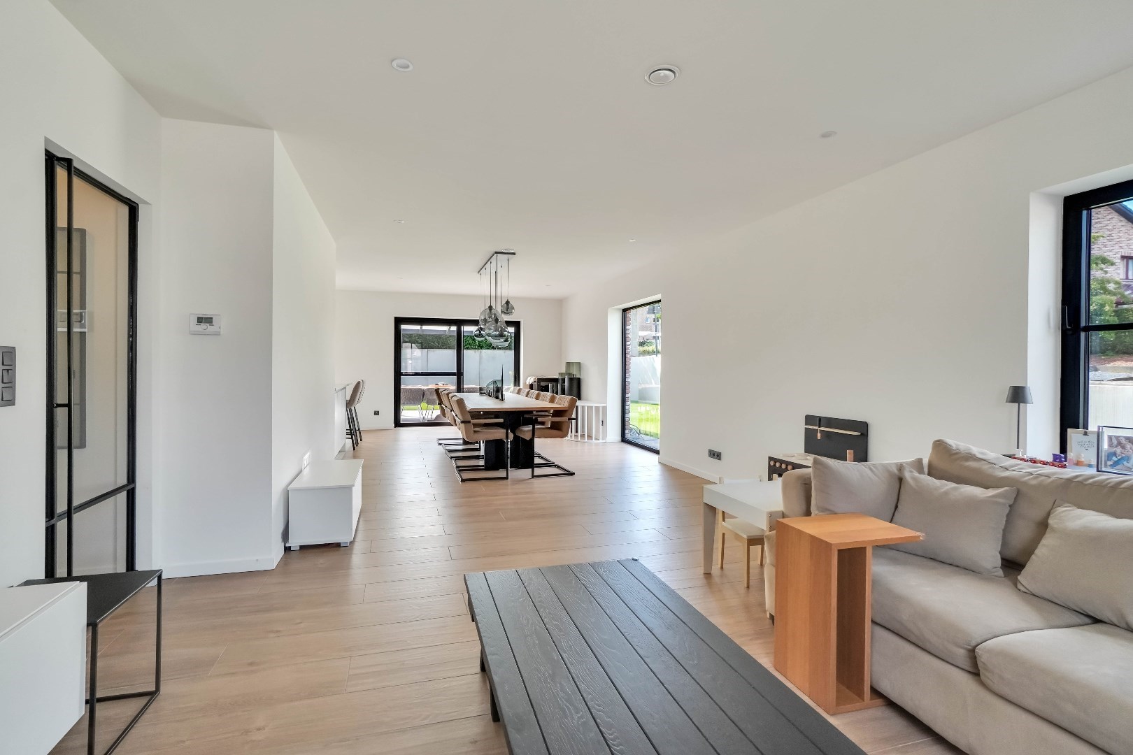 Via de inkomhal met gastentoilet, komen we binnen in het ruime en lichtrijke leefgedeelte.