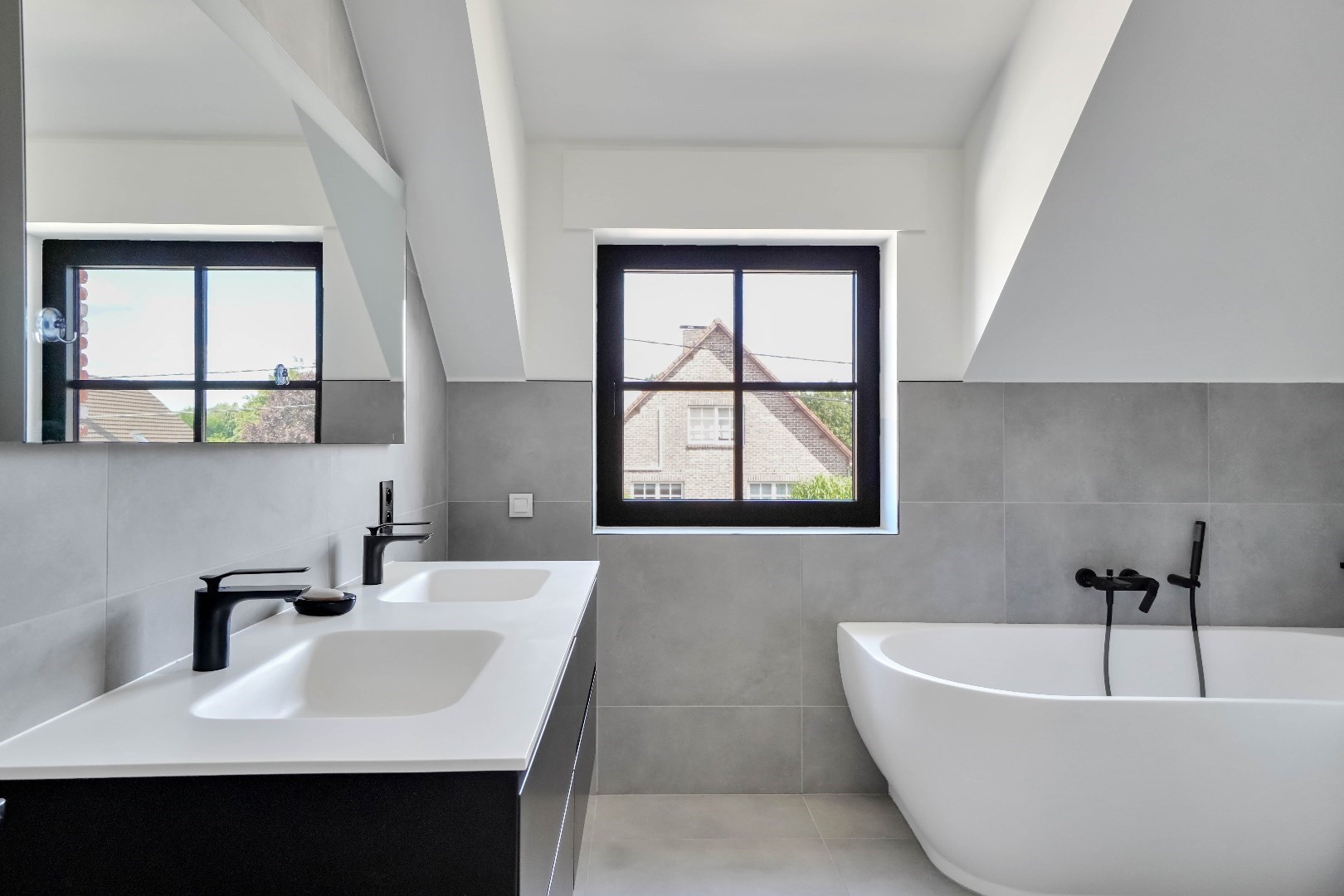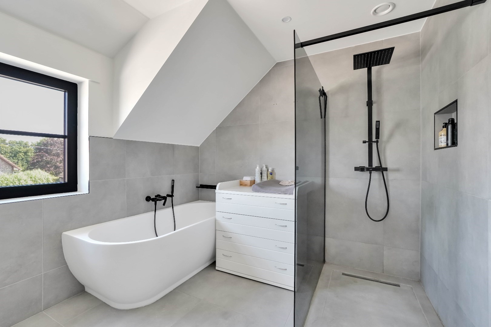 De badkamer beschikt over een dubbele lavabo, ligbad, ruime inloopdouche en vloerverwarming.