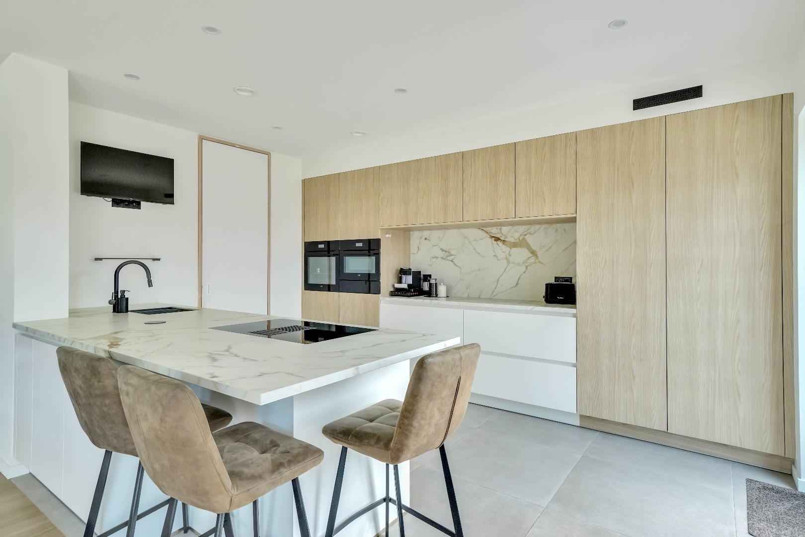 Het leefgedeelte bestaat uit een zit- en eetkamer met open keuken. De keuken is voorzien van hoogwaardige apparatuur waaronder een dubbele spoelbak, kookplaat met geïntegreerde dampkap, ingebouwde koelkast, combi-oven en afwasmachine.