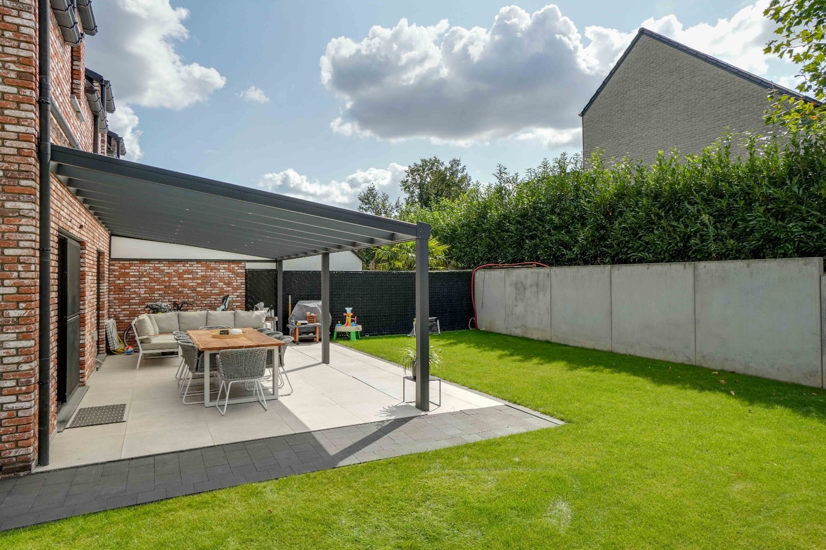 De tuin is gunstig gelegen op het zuid-westen en beschikt over een overdekt terras met gazon.