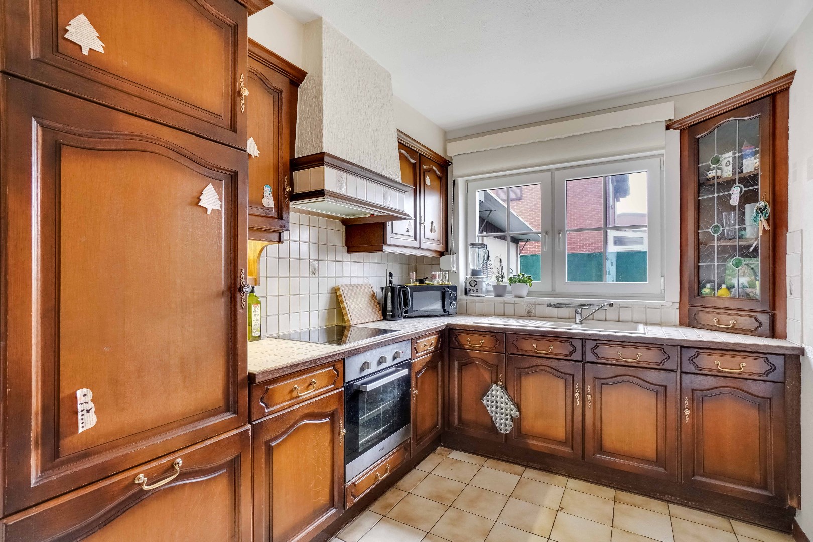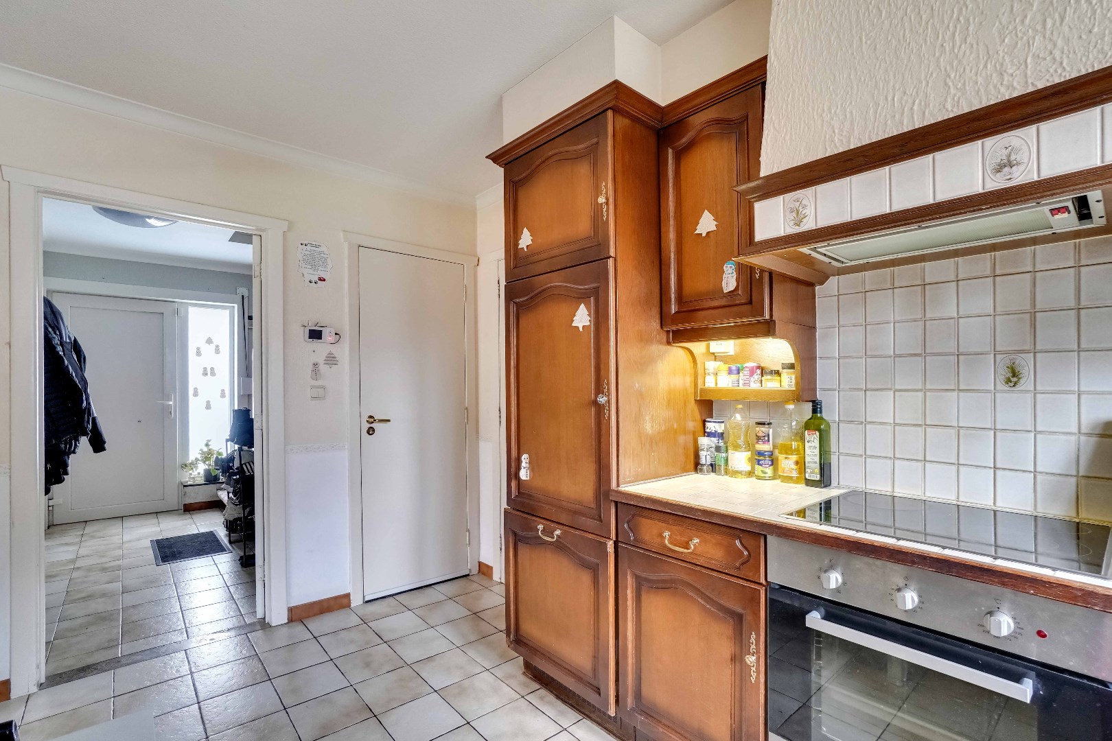 Vanuit de inkomhal is er toegang naar de keuken, met aangrenzend de ruime leefkamer met gezellige pelletkachel. De keuken is uitgerust met een dubbele spoelbak, elektrische kookplaat en oven en verleent toegang tot de kelderberging, ideaal voor extra opbergruimte.