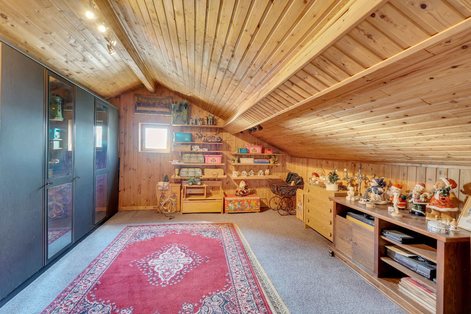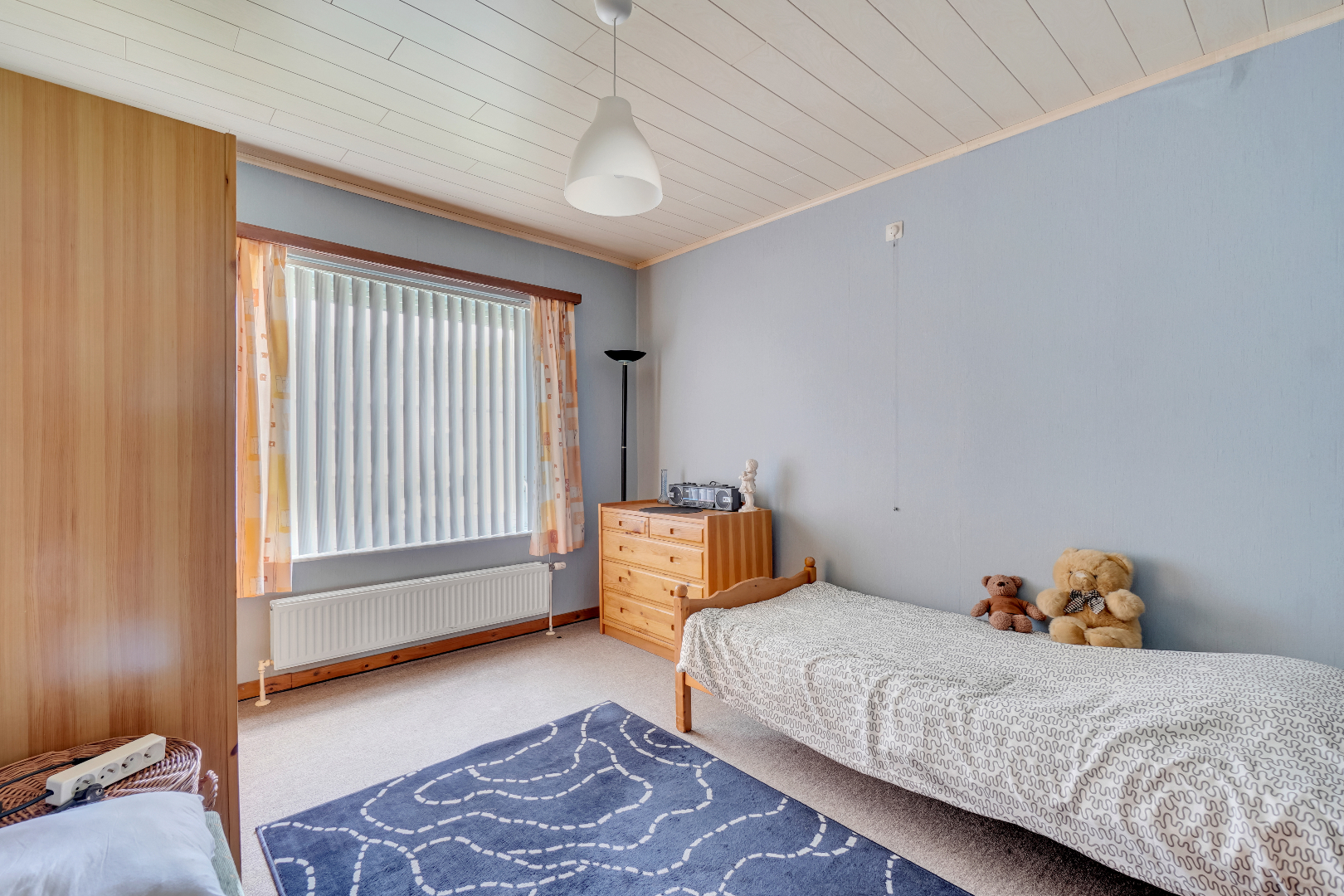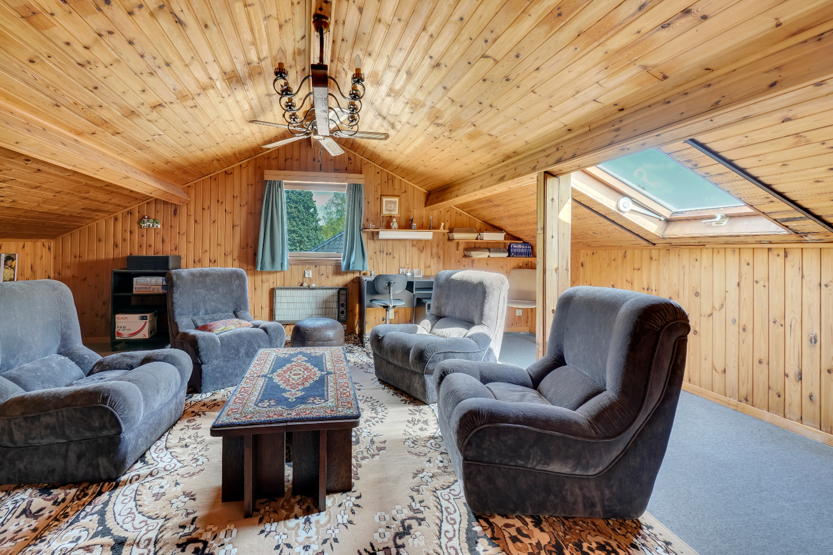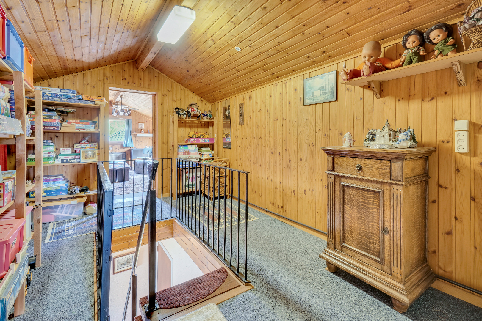 Via een vaste trap bereiken we de verdieping die momenteel is ingericht als extra slaapkamer/hobbyruimte.