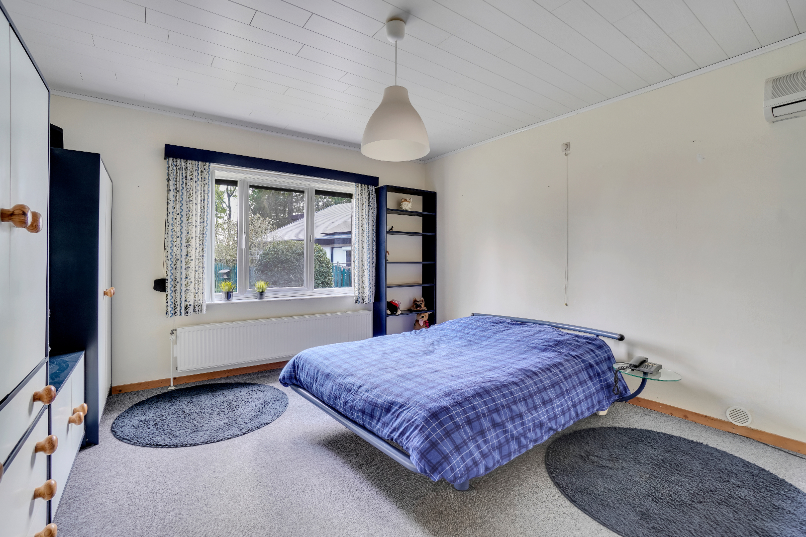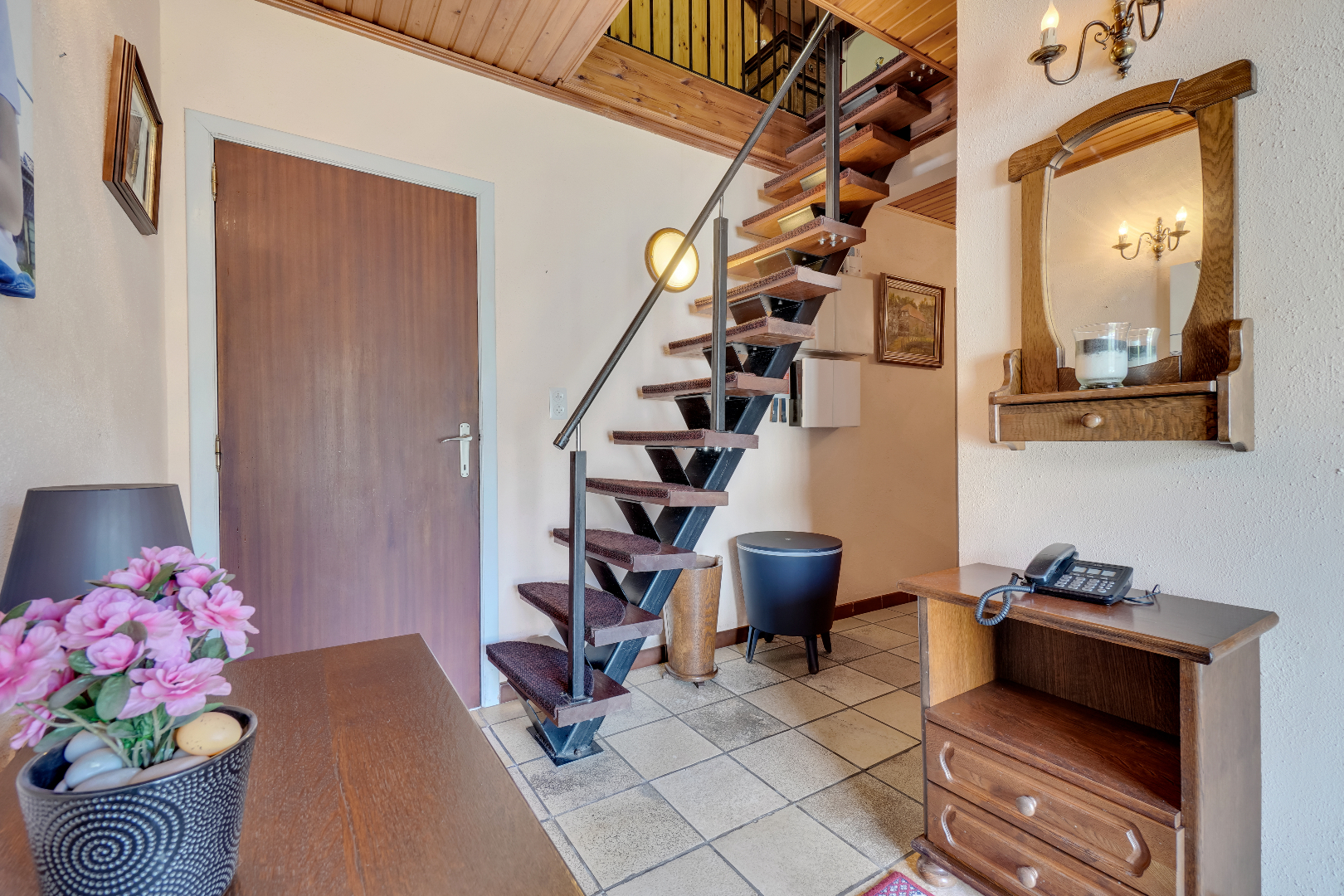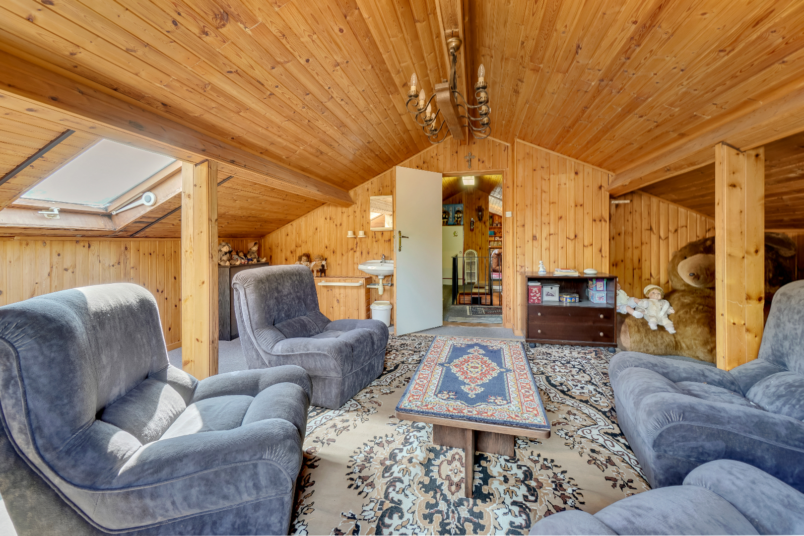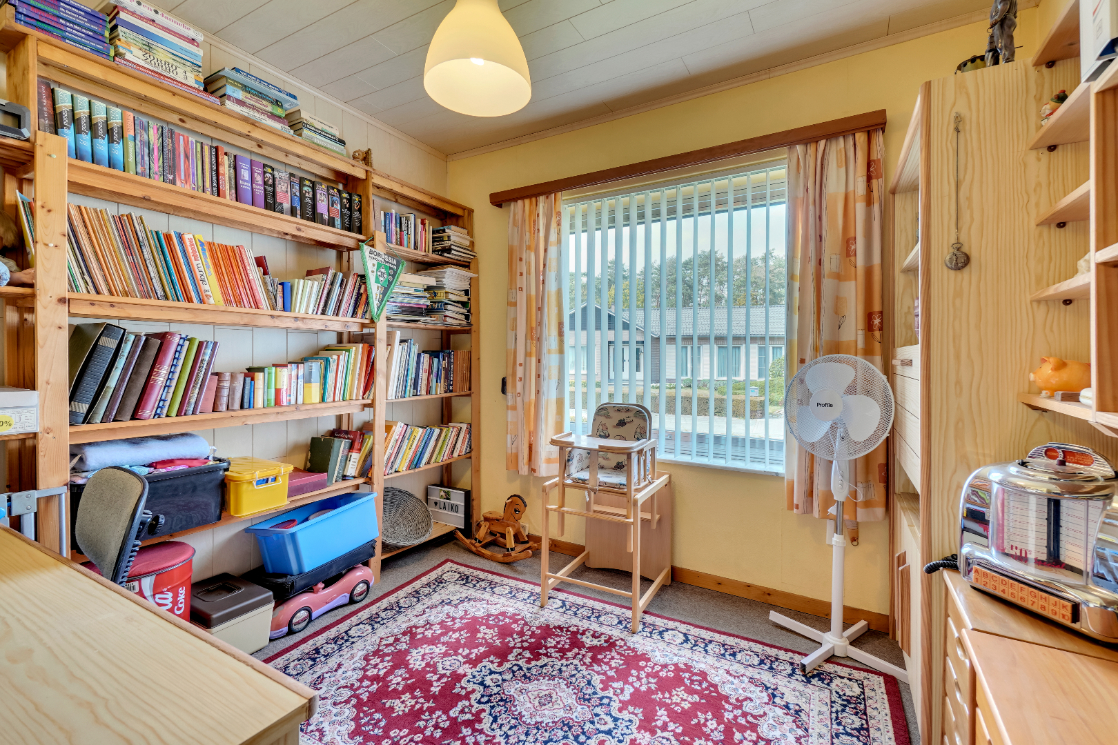 Via een vaste trap bereiken we de verdieping die momenteel is ingericht als extra slaapkamer/hobbyruimte.