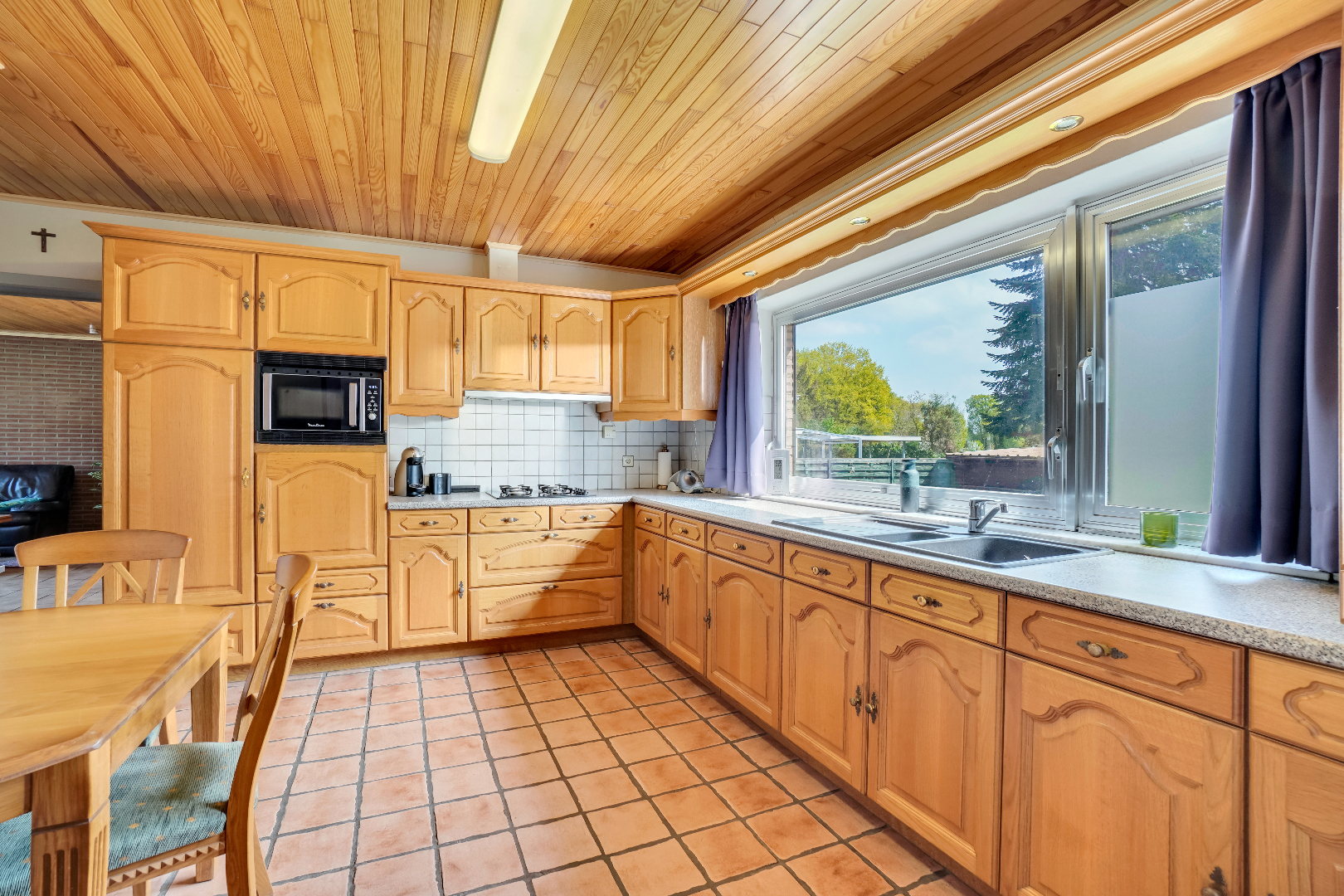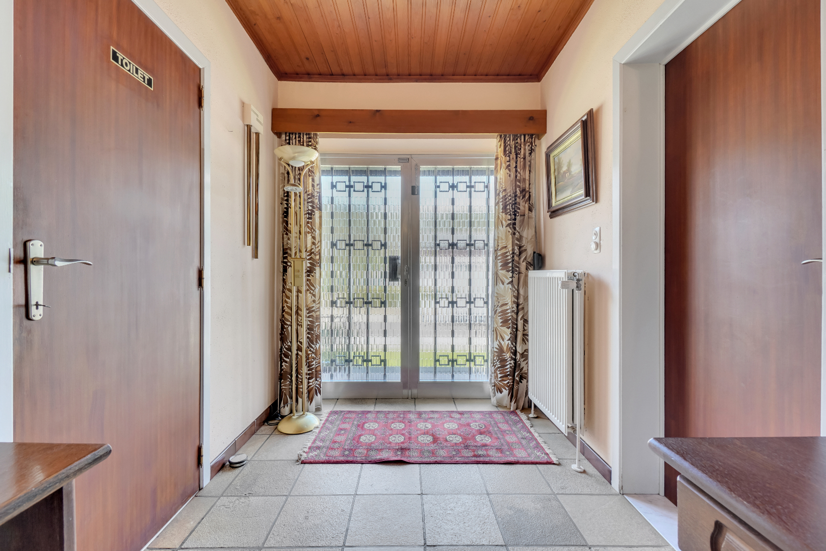Via de inkomhal heb je toegang tot de woonkamer, keuken alsook het nachtgedeelte. De leefruimte heeft zicht op de voortuin alsook de achtertuin en is voorzien van een kleine veranda. Vanuit de aanpalende keuken met zicht op de tuin is er tevens een toegang tot de volledige kelderverdieping.