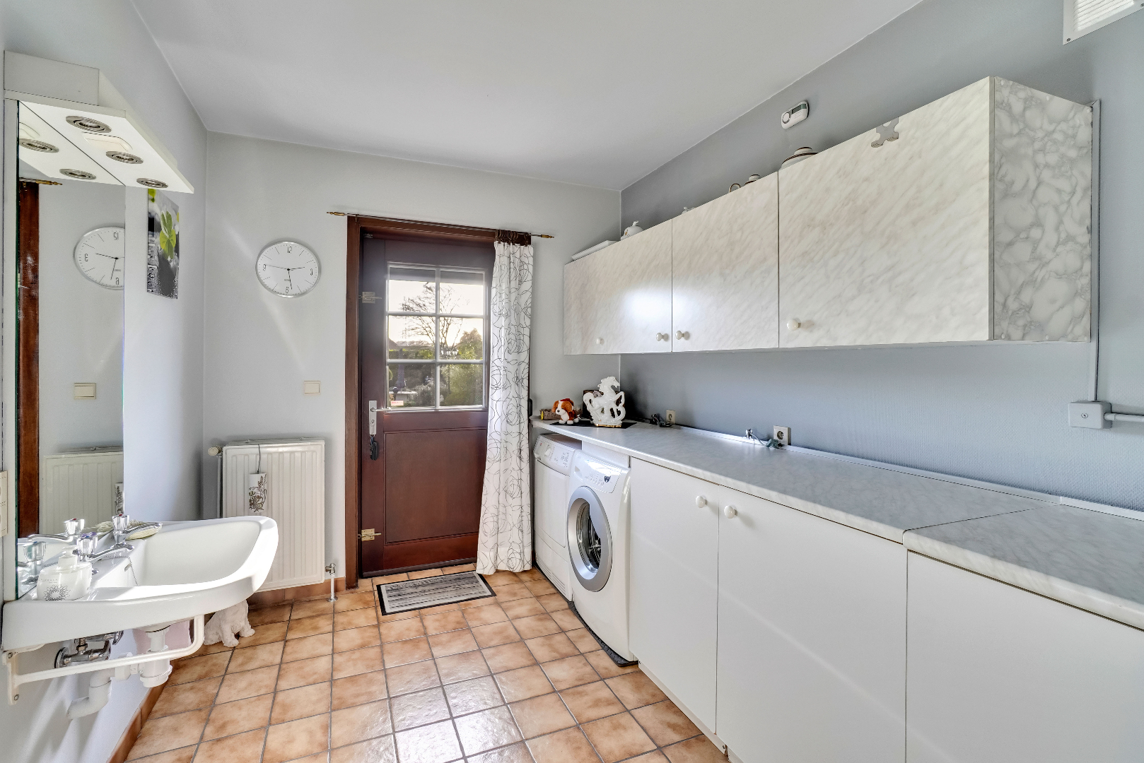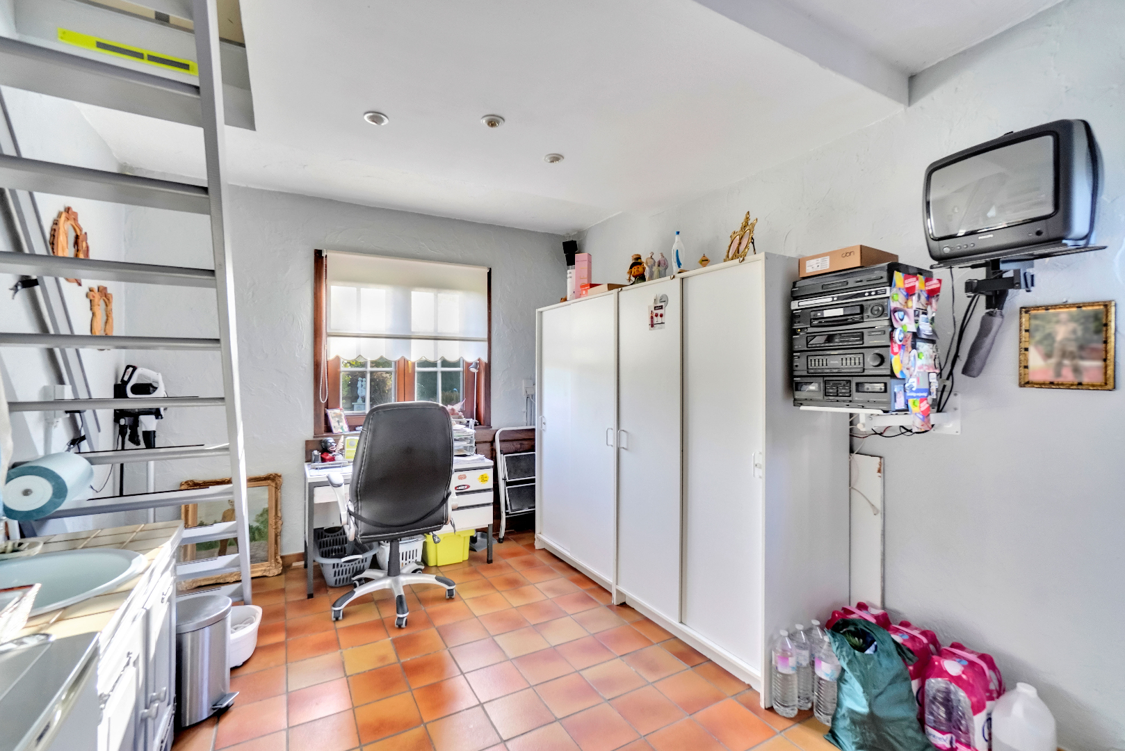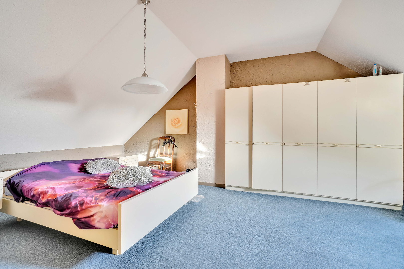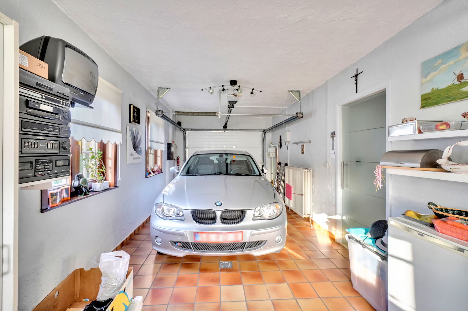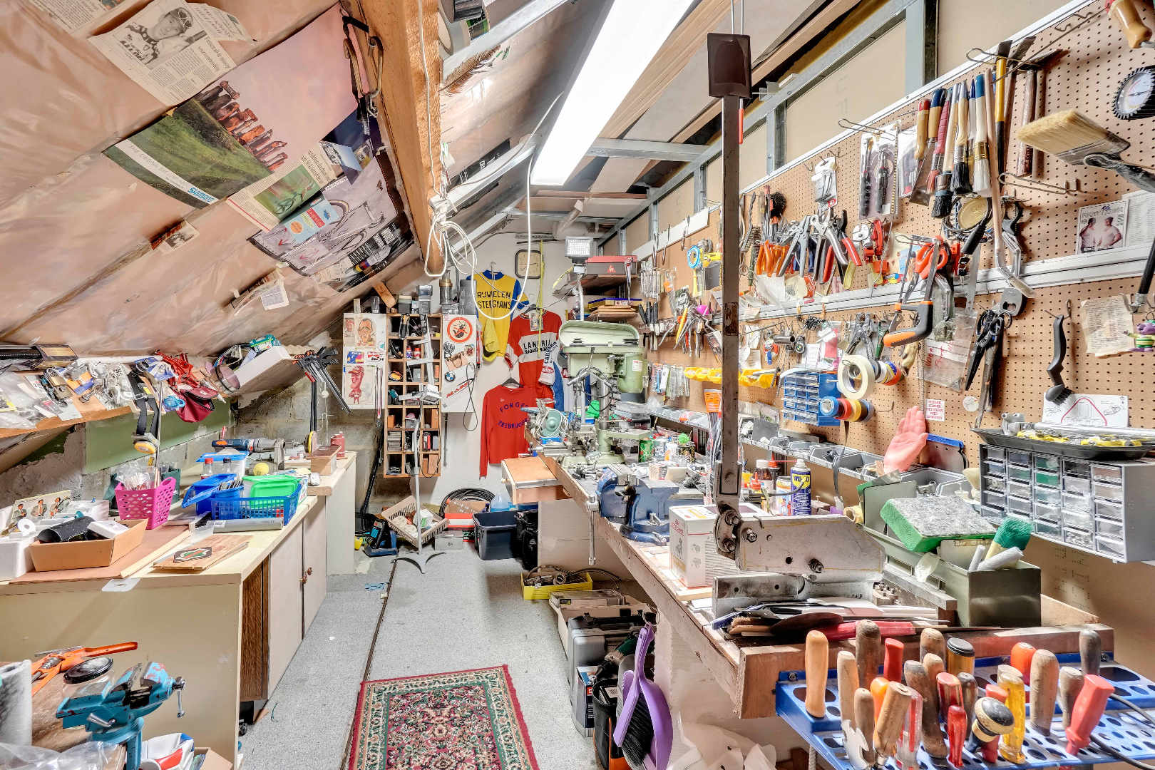 Via de inpandige garage met werkplaats is er een vaste trap voorzien naar de bovenverdieping. Hier zijn een grote overloop/hobbyruimte, 2 slaapkamers, een werkruimte en een kleine badkamer ingericht.