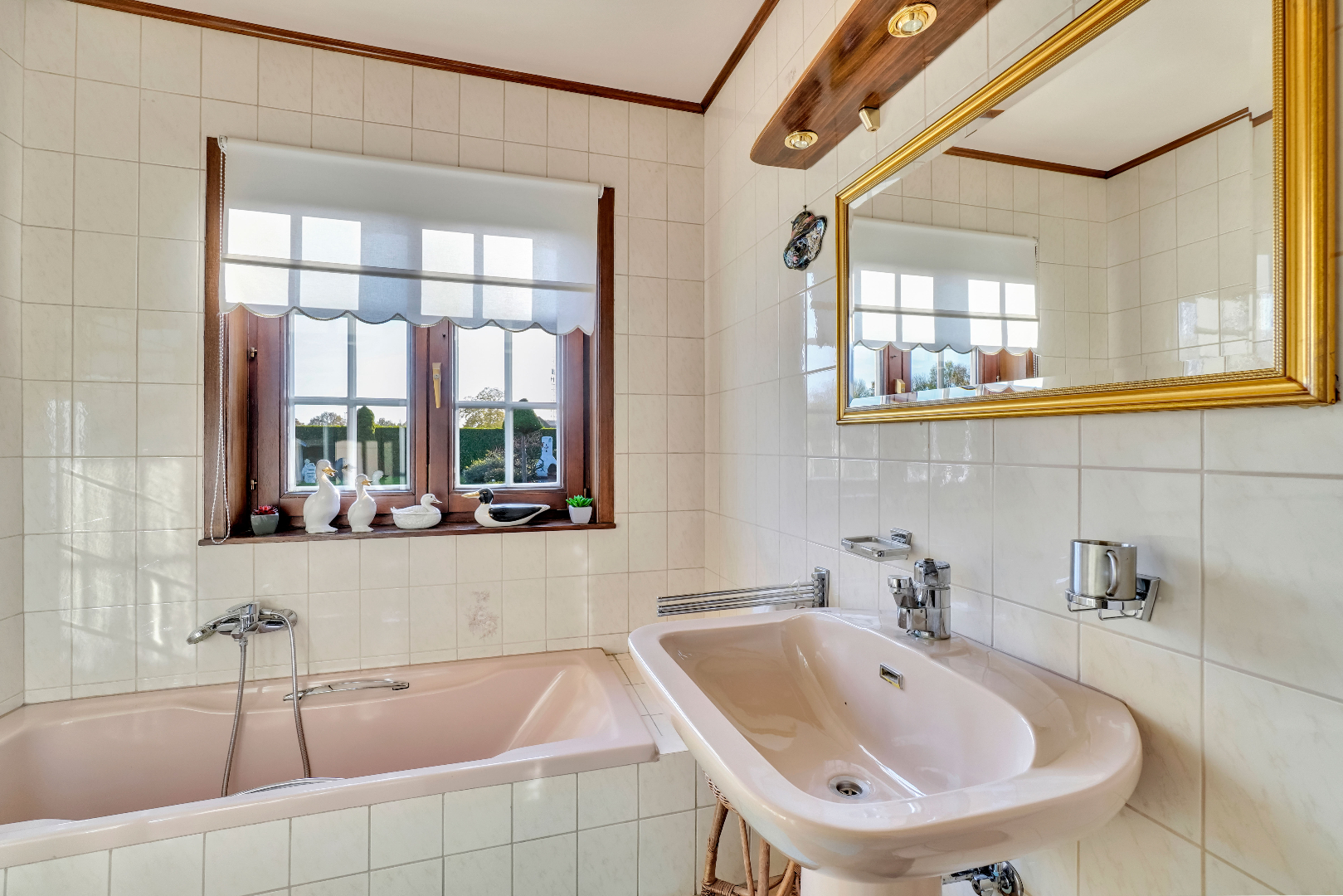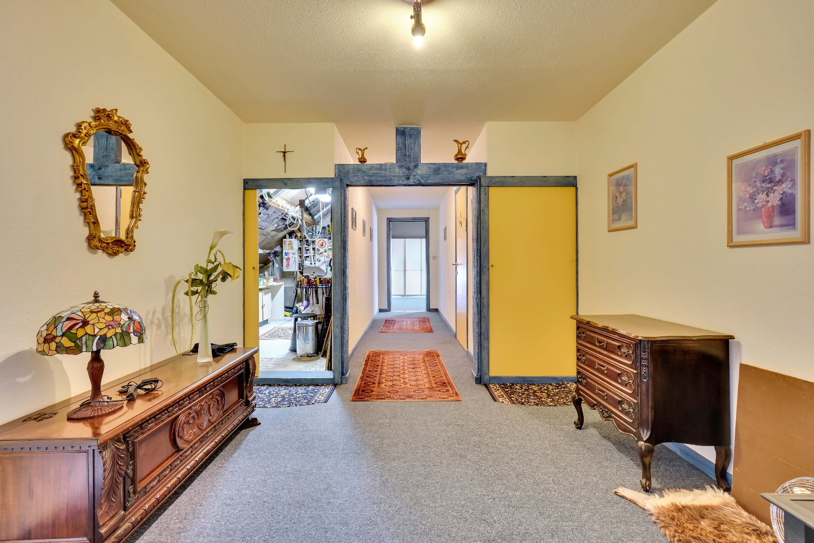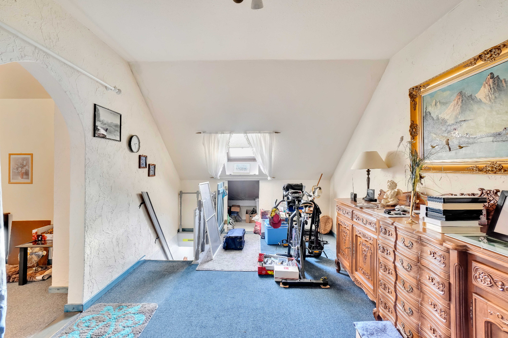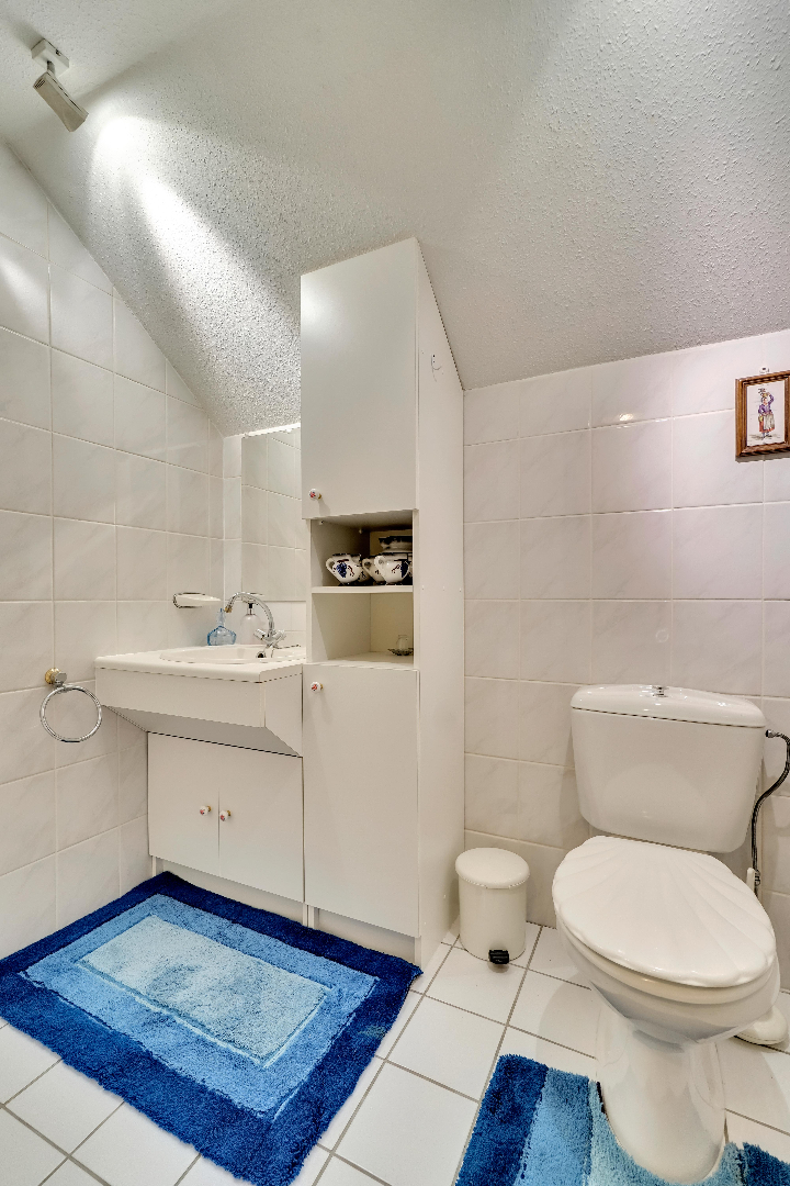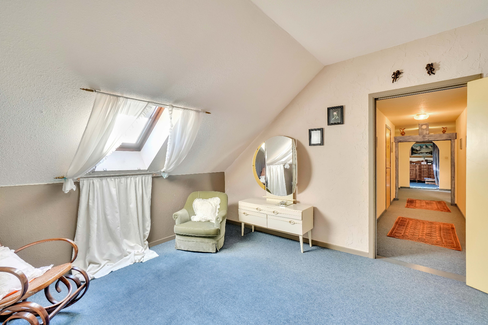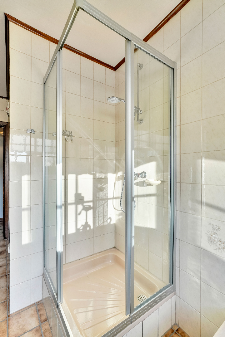 Via de inpandige garage met werkplaats is er een vaste trap voorzien naar de bovenverdieping. Hier zijn een grote overloop/hobbyruimte, 2 slaapkamers, een werkruimte en een kleine badkamer ingericht.