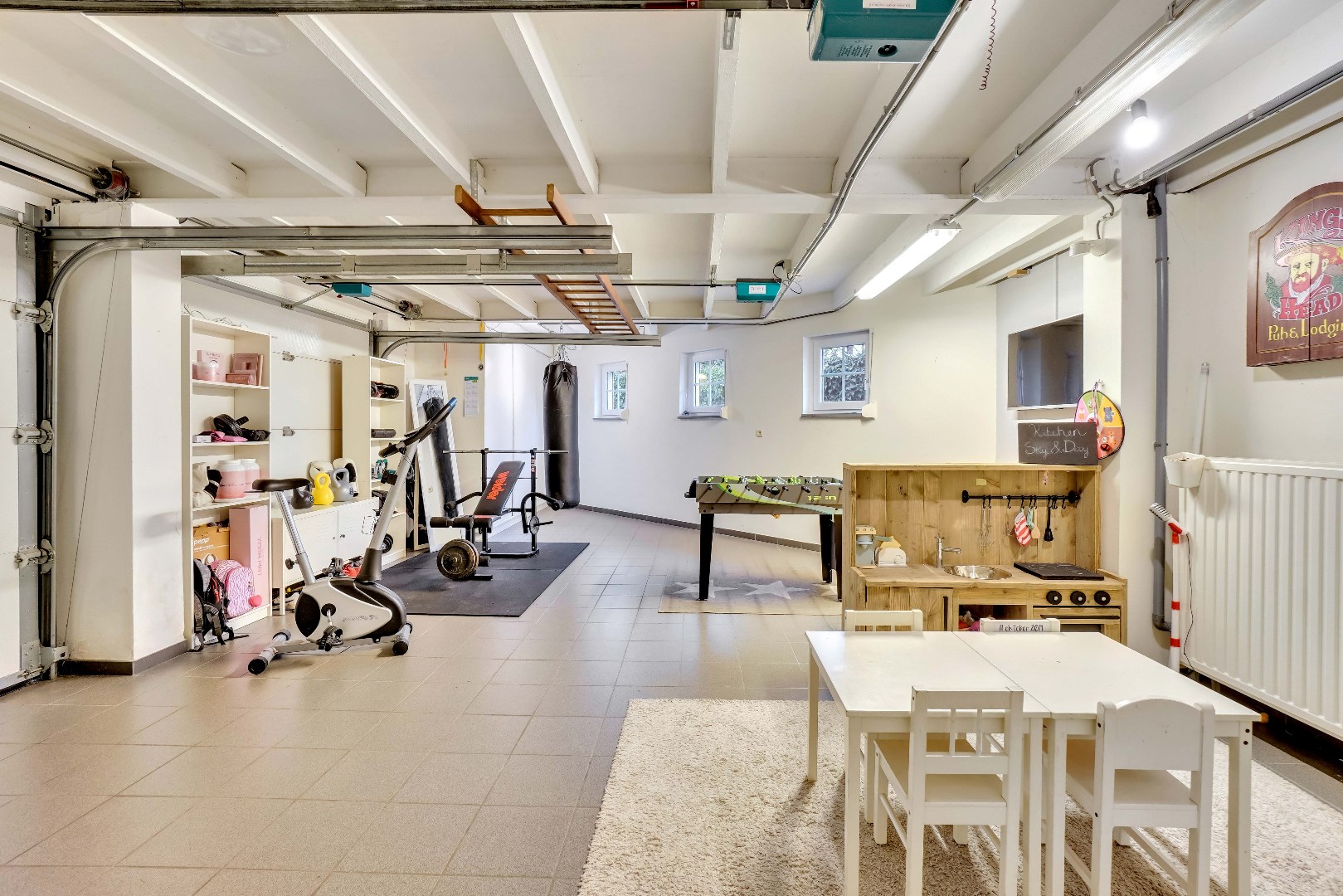Vanuit de keuken is er ook toegang naar de dubbele garage die op dit moment dienst doet als sportruimte/opbergruimte. Aansluitend bevindt zich nog een wasplaats.