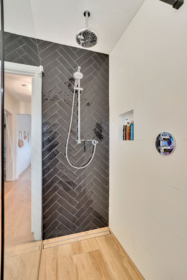 Op de eerste verdieping bevinden zich 3 slaapkamers waarvan één met een ruime dressing (uitgerust met inbouwkasten) en een zeer modern ingerichte badkamer met een lavabo, toilet en een inloopdouche.