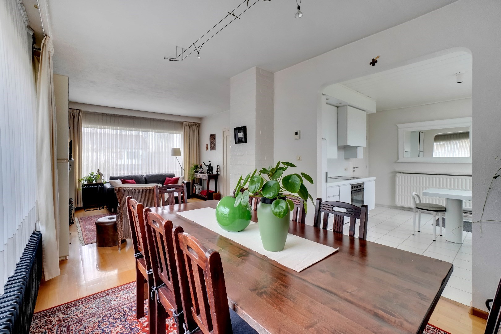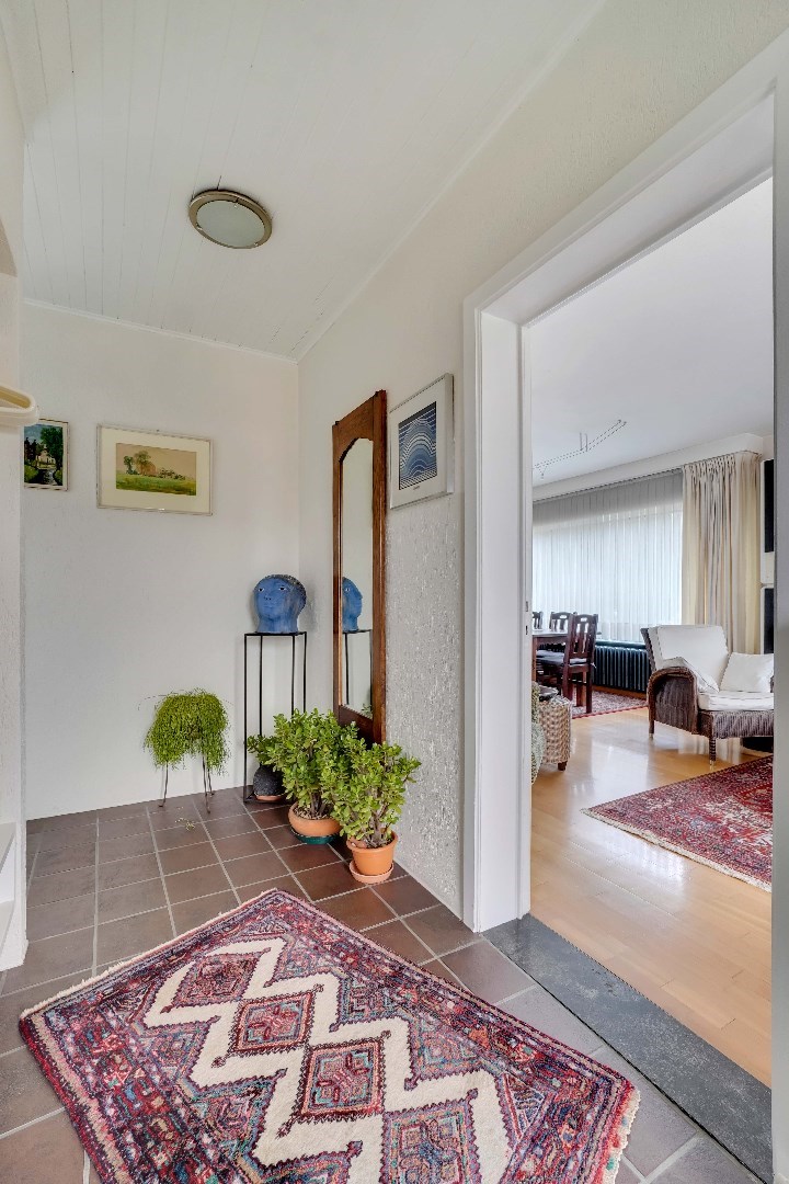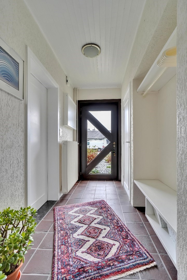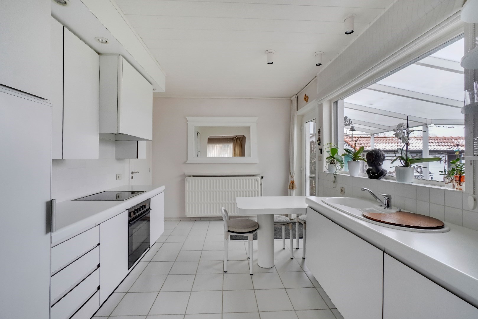Via de inkomhal met gastentoilet heb je toegang via een deur tot de woonkamer en eetplaats. Naastgelegen bevindt zich de volledig uitgeruste keuken. Via de raampartijen heb je vanuit de leefruimte en keuken zicht op het overdekte terras en de tuin.