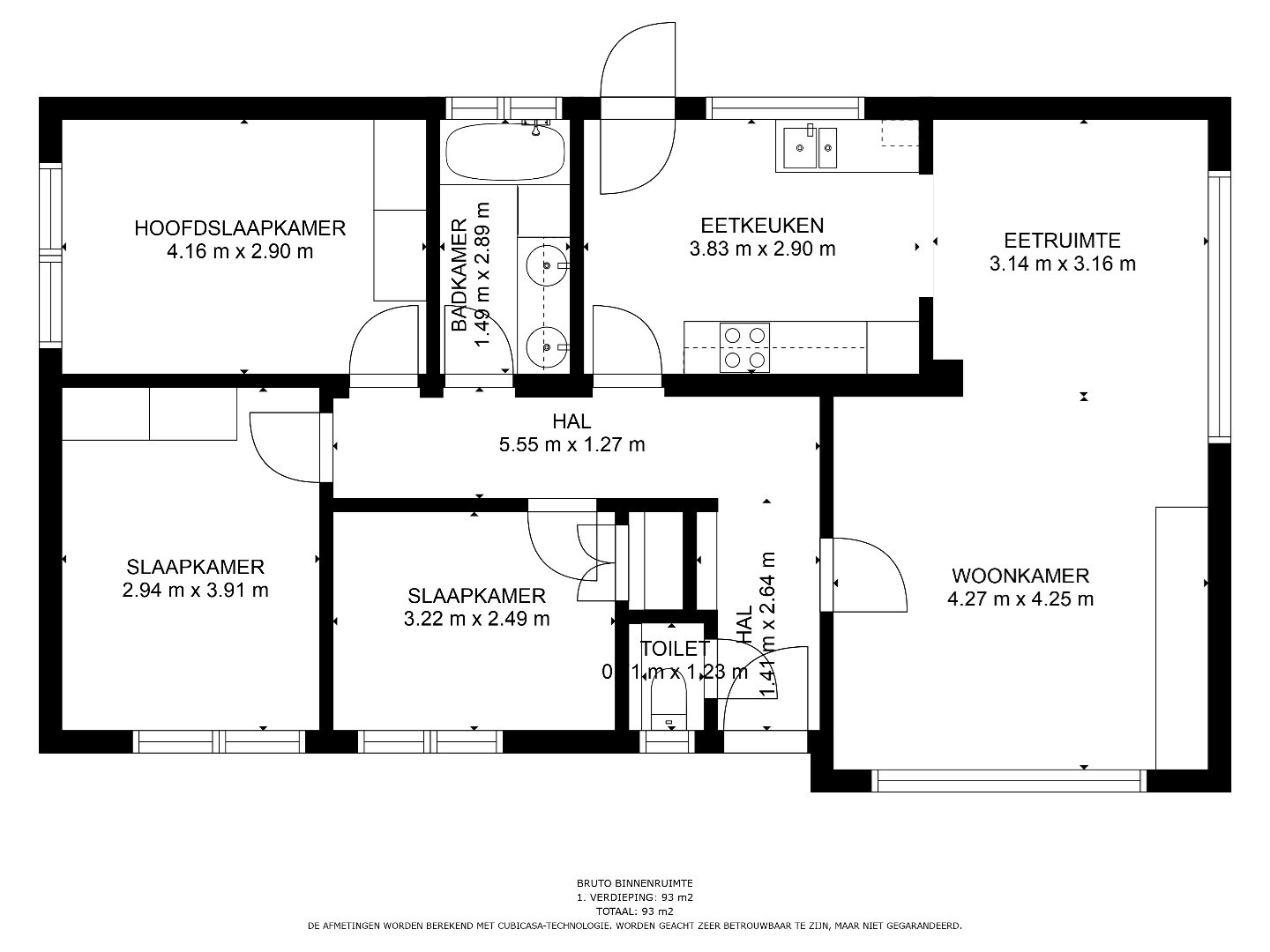 De woning heeft een bewoonbare oppervlakte van 93 m² en is ingedeeld als volgt: