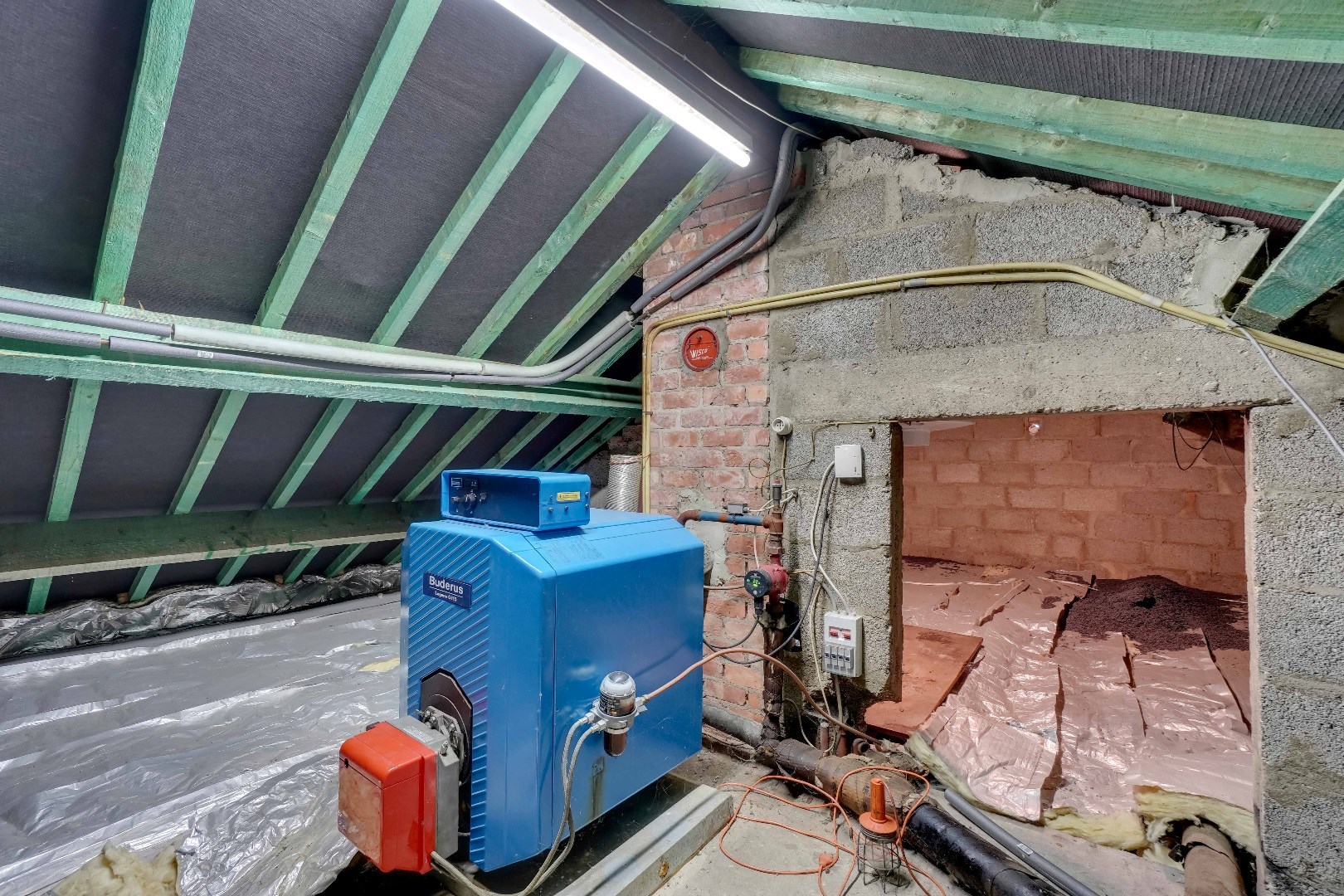 Via een vlizotrap bereiken we de zolderverdieping die momenteel te gebruiken is als opbergruimte. Hier staat de verwarmingsketel.