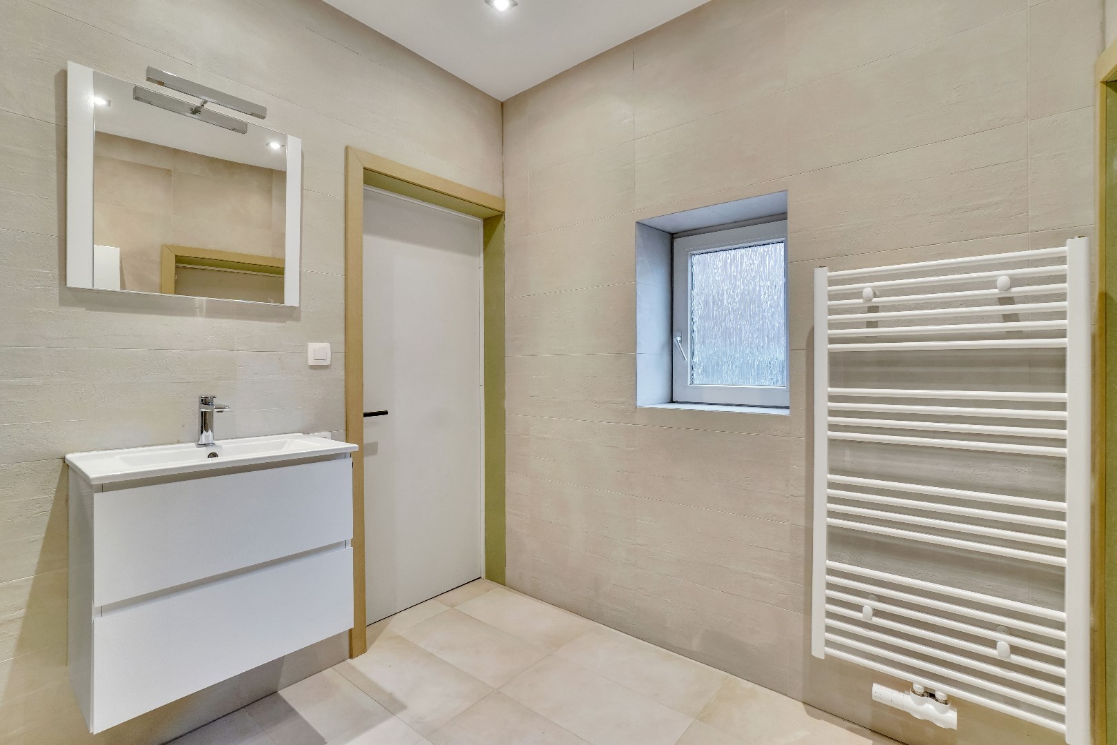 Via de inkomdeur heb je toegang tot een mooie leefruimte aan de voorzijde van de woning. Aansluitend is er een volledig ingerichte keuken die direct toegang geeft tot de volledig vernieuwde badkamer alsook naar een extra bergruimte aan de achterzijde van de woning.