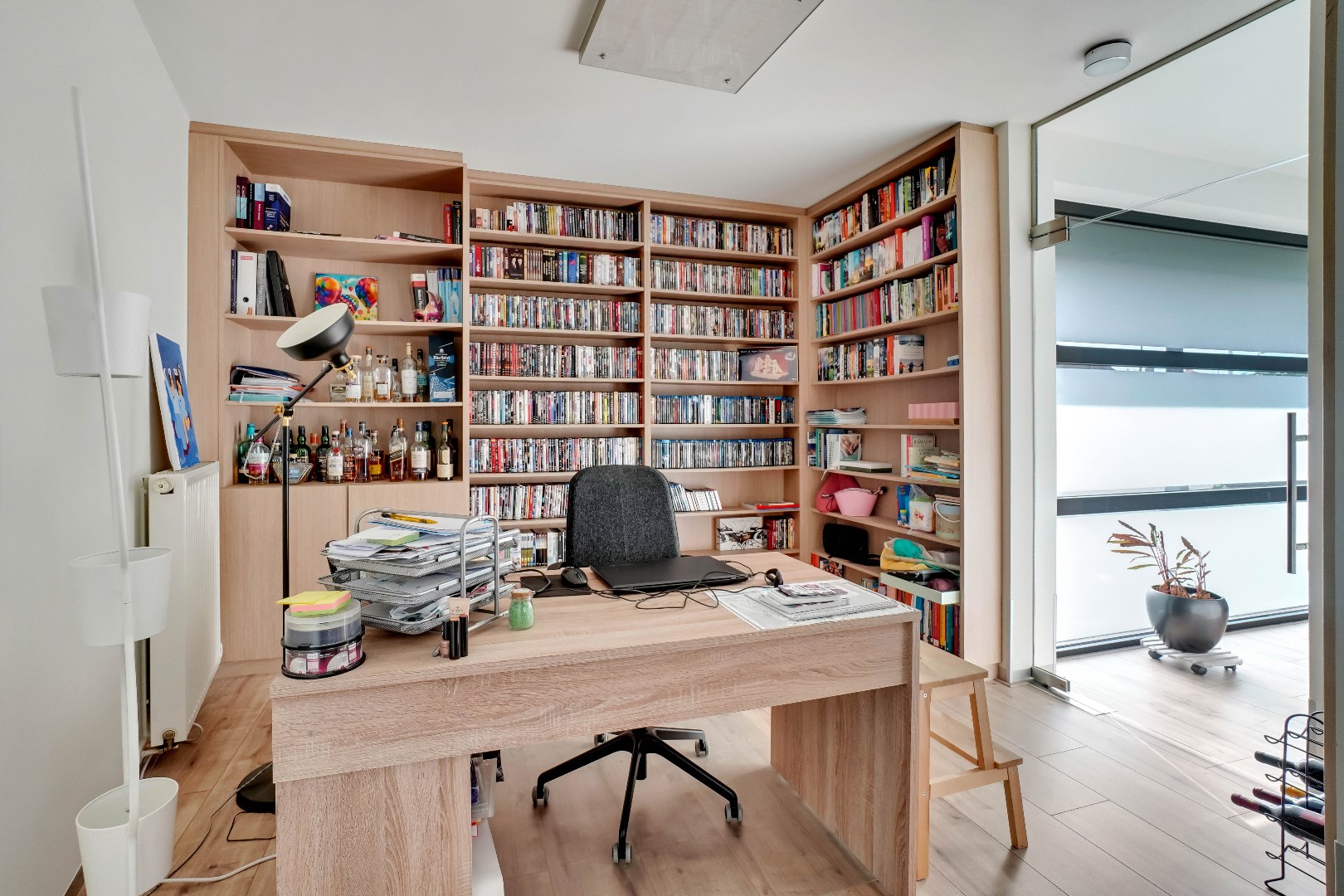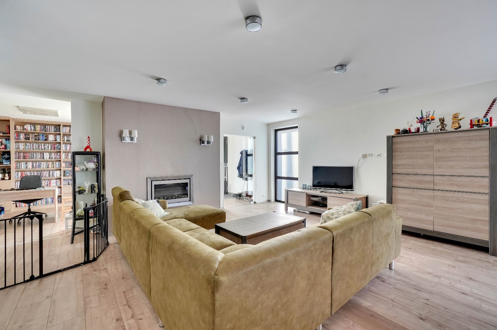 Vanuit de inkomhal begeeft u zich naar de open leefruimte. De gezellige leefruimte is voorzien van een gashaard, waardoor het in de wintermaanden heerlijk vertoeven is. Daarnaast is er ook een ruimte die als bureaukamer voorzien kan worden.