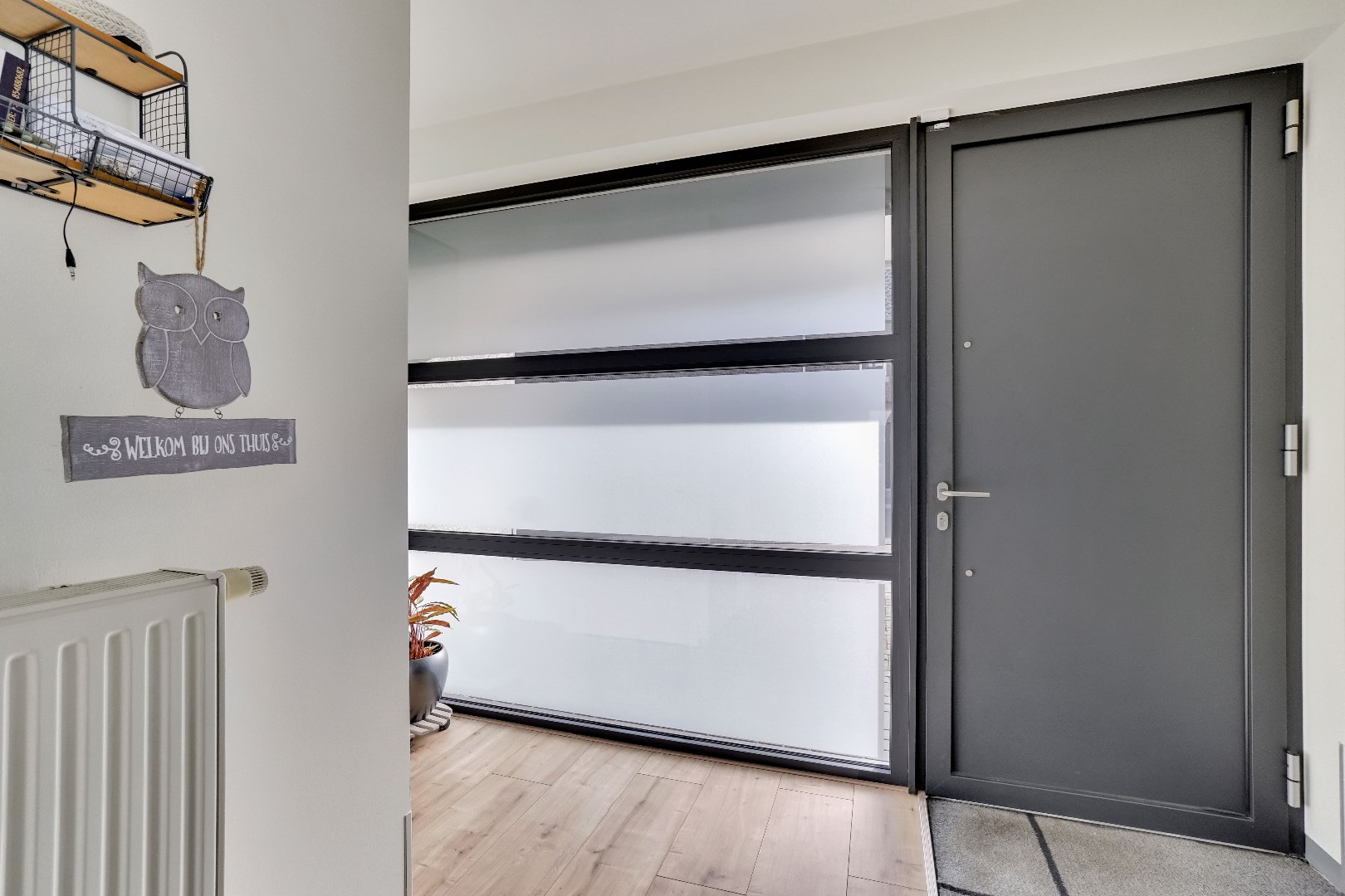 U komt het gelijkvloers binnen in de inkomhal, deze is voorzien van een gastentoilet.