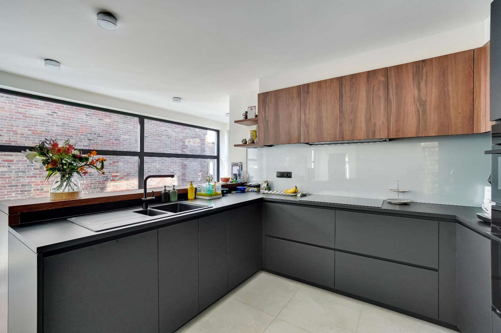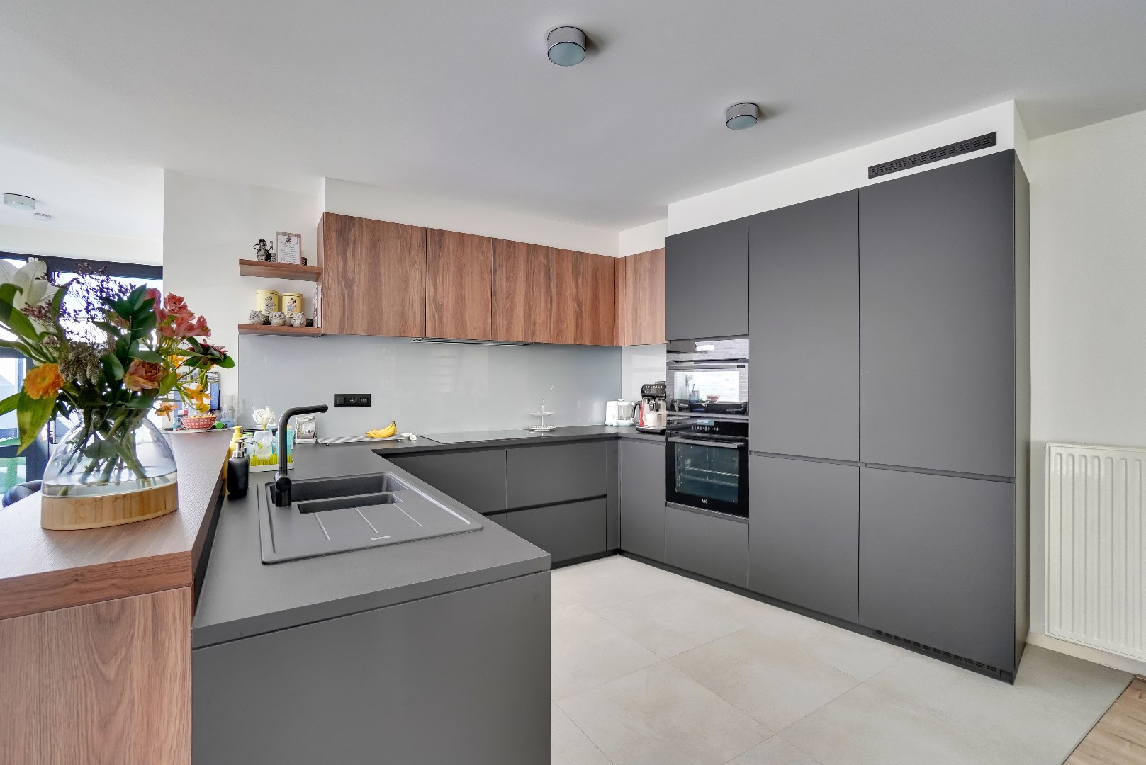 Aansluitend aan de leefruimte bevindt zich de open keuken. De volledig uitgeruste keuken van het merk Dovy werd volledig vernieuwd in 2021 en is voorzien van alle moderne apparatuur, waaronder een inductiekookplaat, ingebouwde koelkast met diepvries, afwasmachine, oven en magnetron.