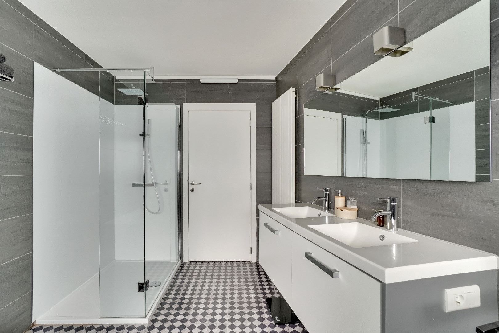 De badkamer is voorzien van een dubbele lavabo, een bad, een douche en een toilet.