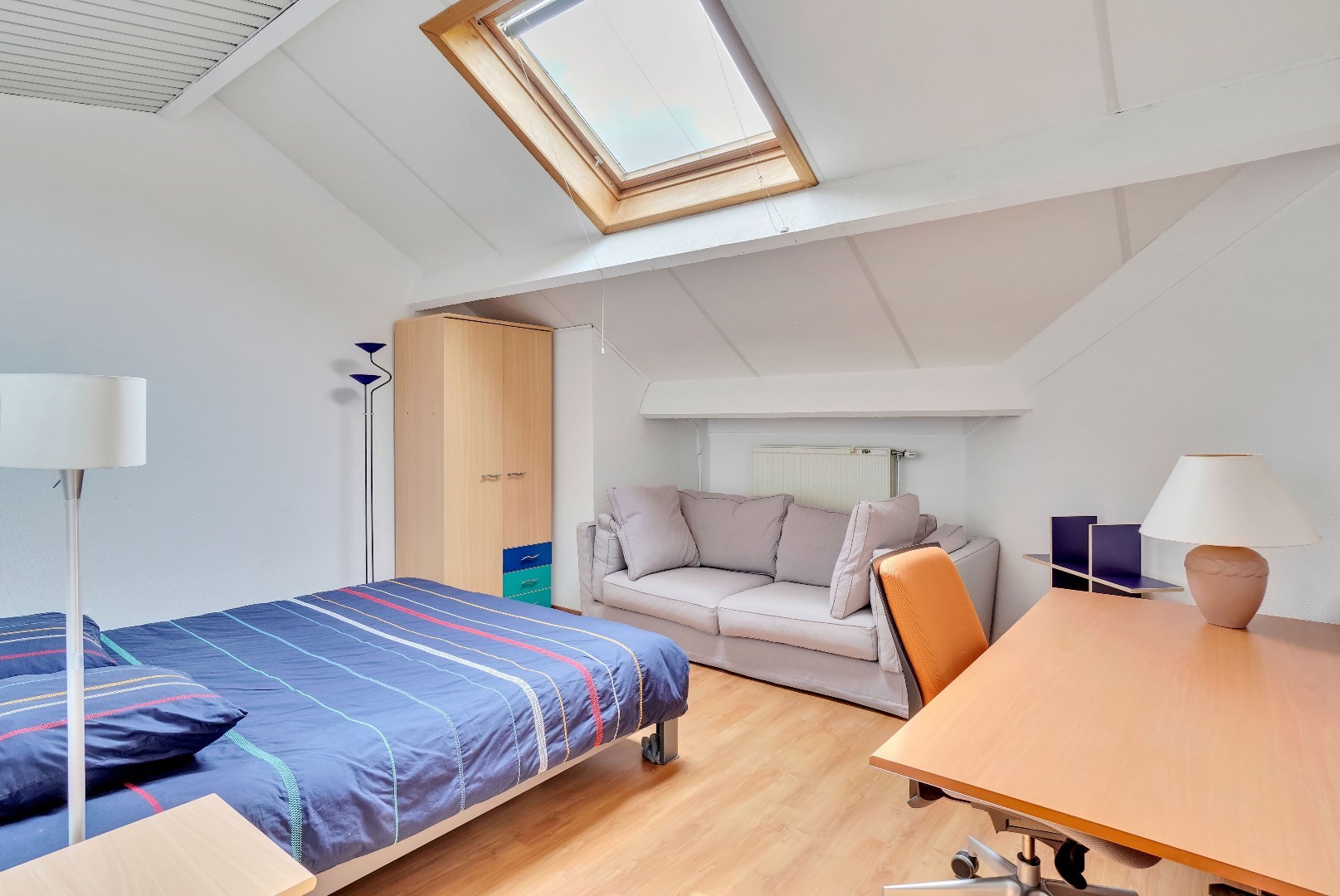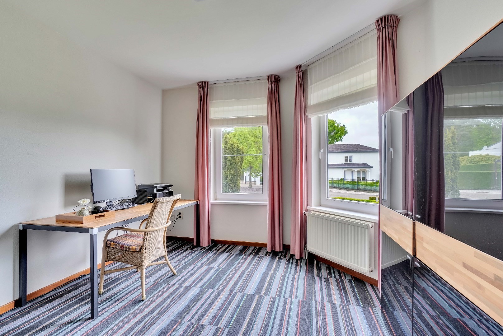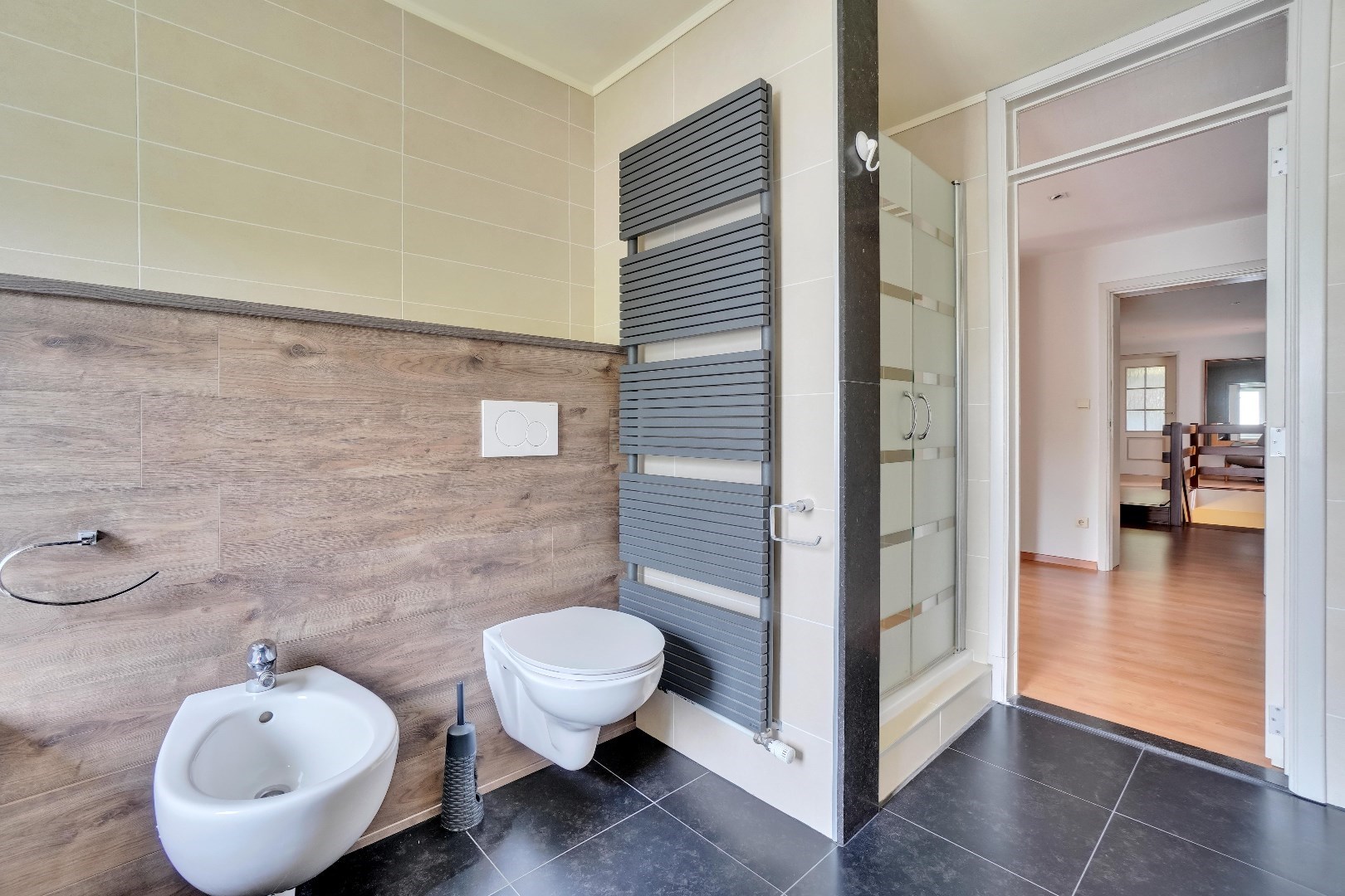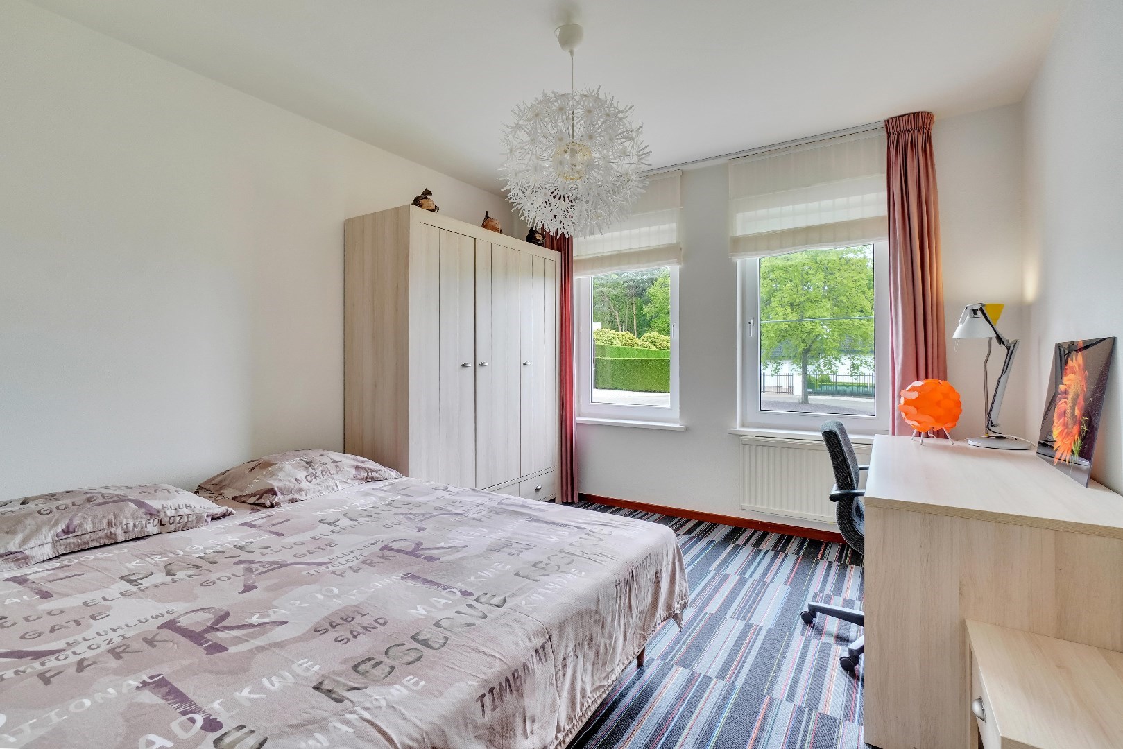 Op het gelijkvloers bevinden zich ook twee slaapkamers. Eén van de slaapkamers is momenteel ingericht als een bureau, wat ideaal is voor wie vanuit huis werkt of een rustige werkruimte nodig heeft.