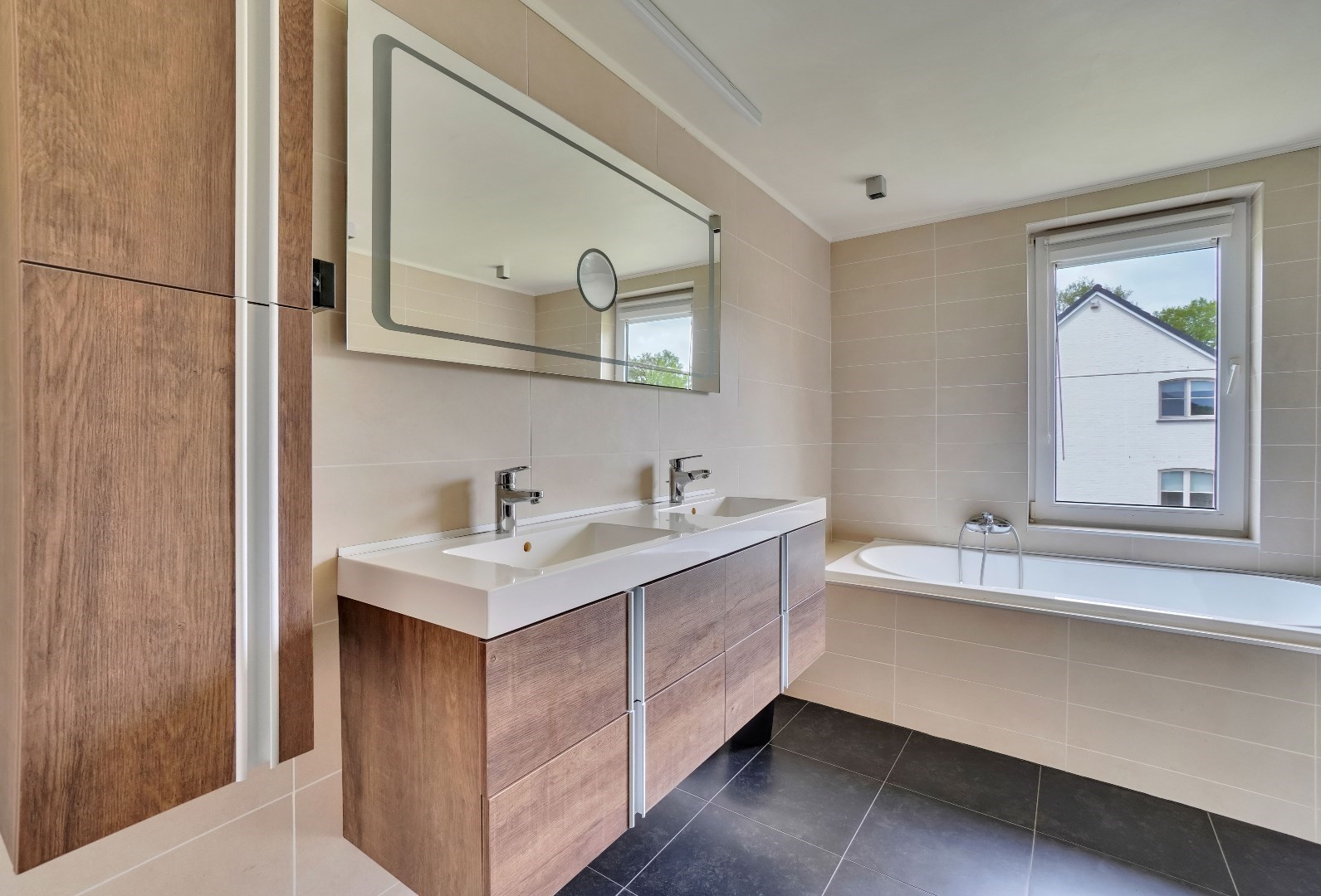 Op de bovenverdieping bevinden zich nog eens drie slaapkamers alsook een grote bergruimte/dressing. De masterbedroom heeft een eigen badkamer, hier is een bad, dubbele wastafel, bidet, douche en een toilet aanwezig.