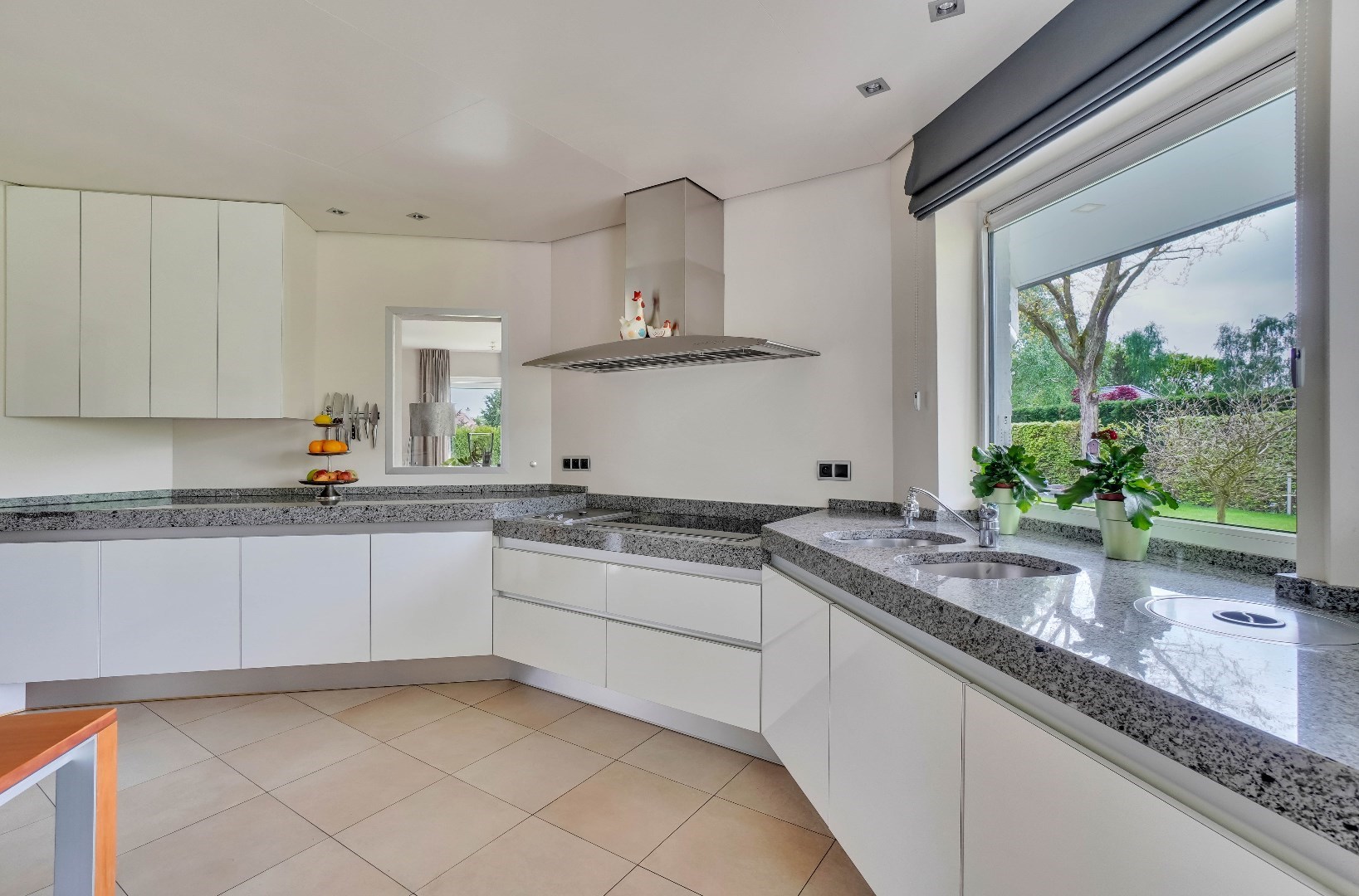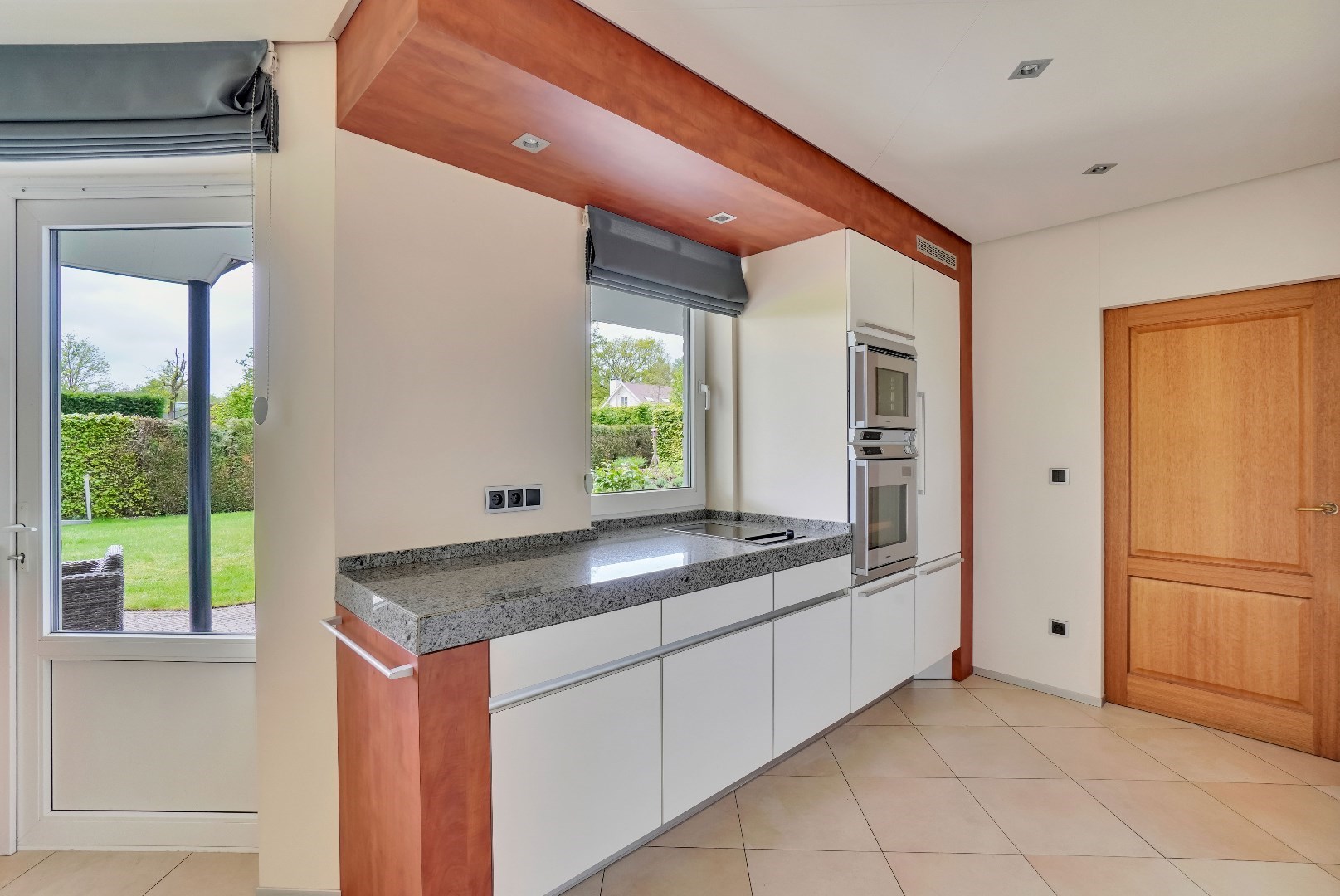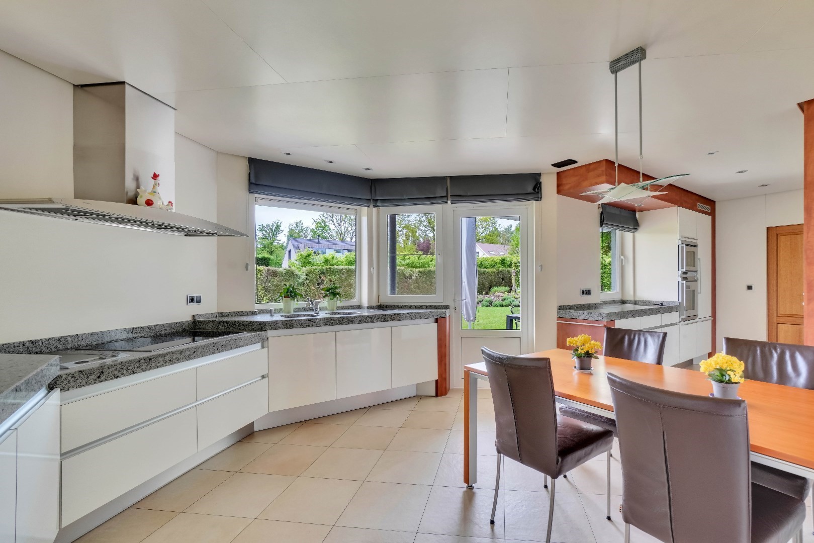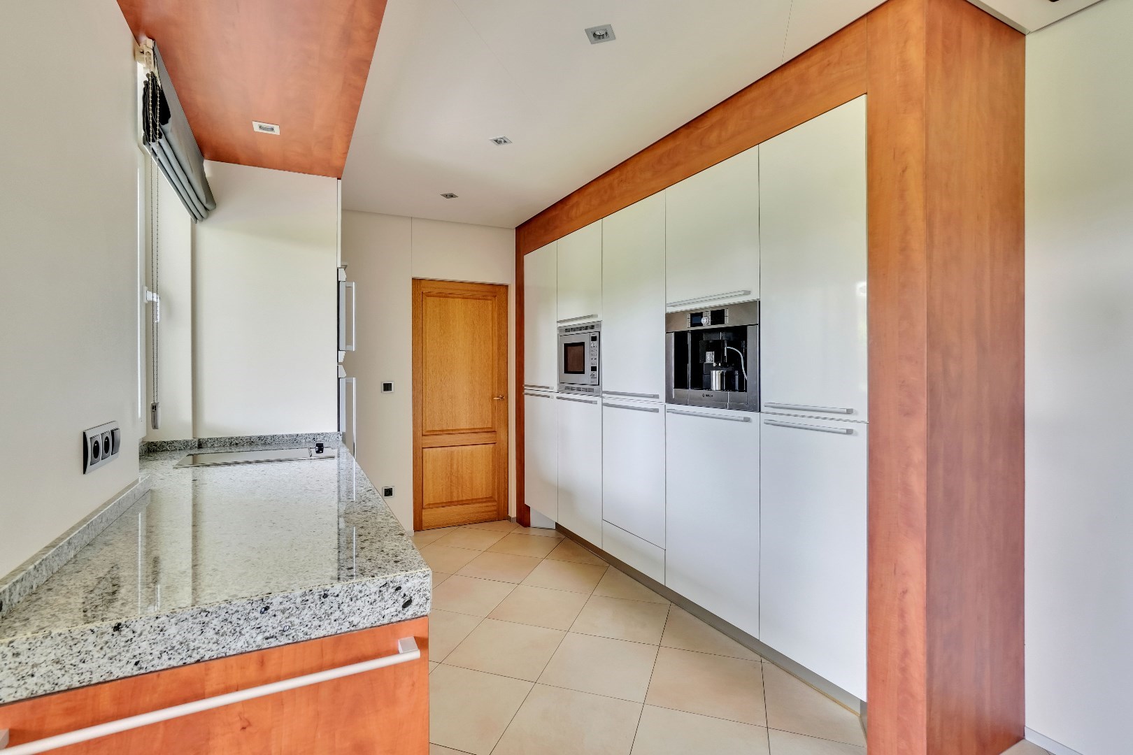 De keuken is voorzien van veel bergruimte en hoogwaardige apparatuur. U vindt er een ingebouwde vaatwasmachine, twee ovens met magnetron, een stoomoven, ingebouwde koffiemachine, ingebouwde friteuse en nog veel meer.
