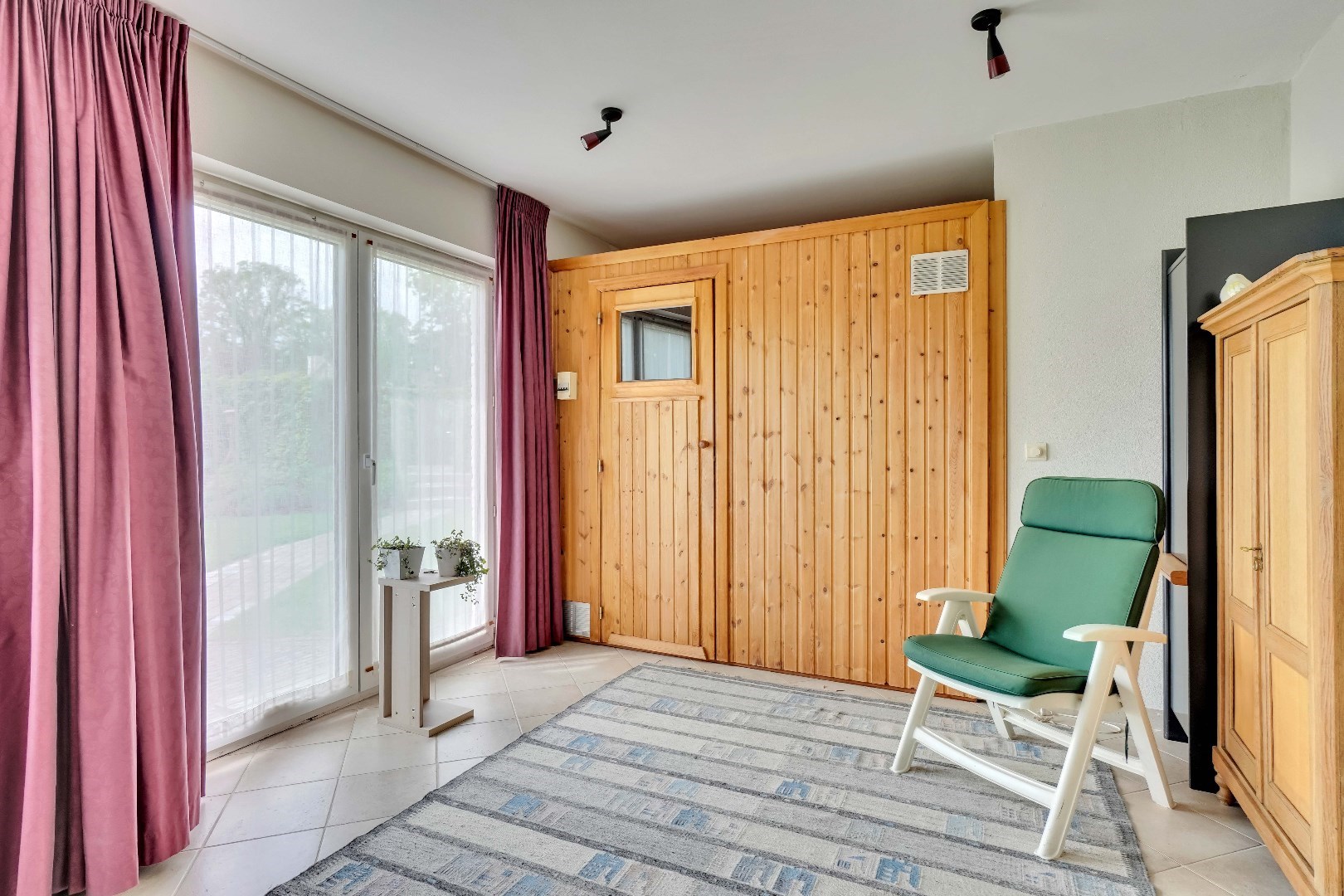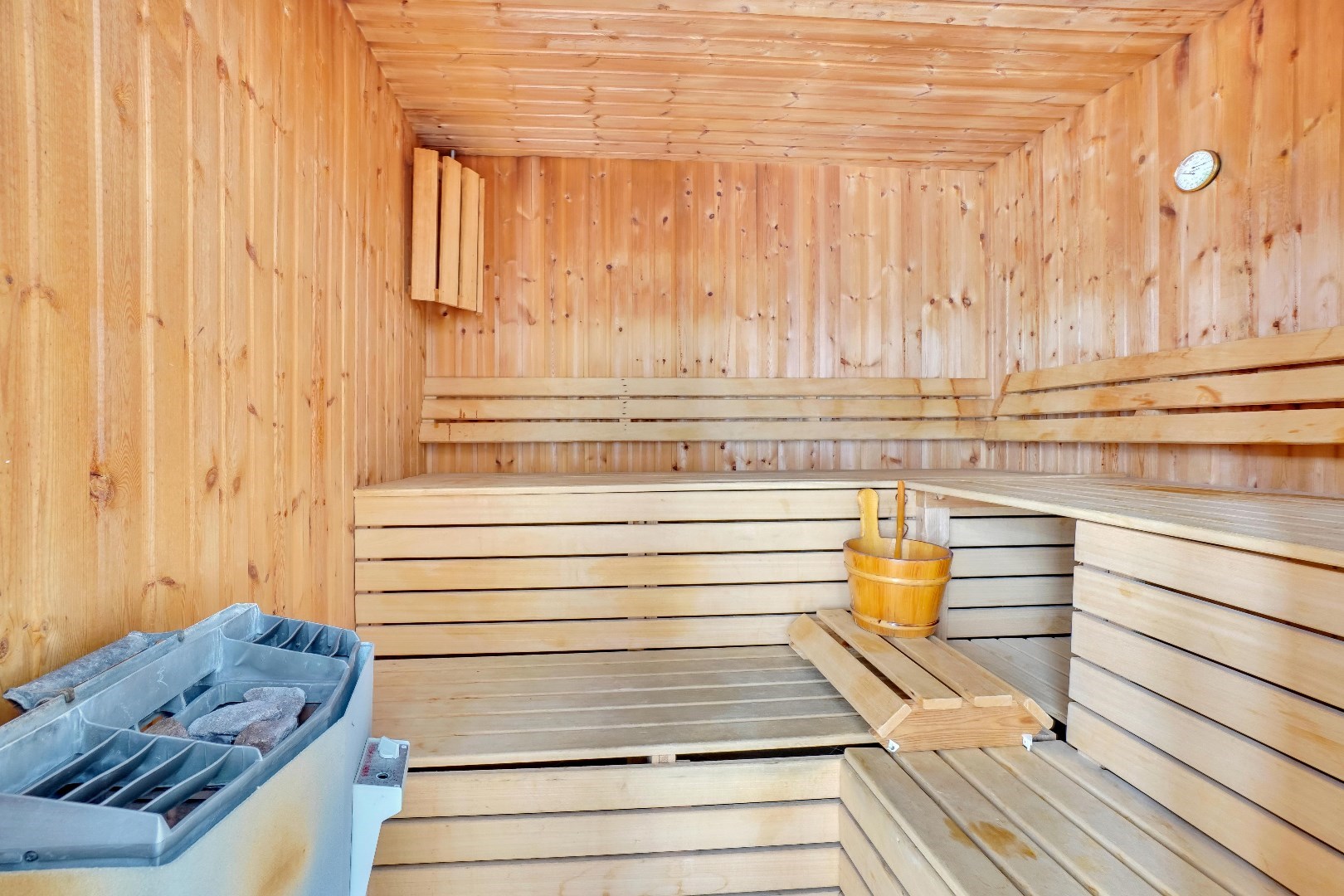 Verder biedt deze verdieping een eigen sauna waardoor u kunt genieten van ontspannende spa-momenten in uw eigen huis. Deze ruimte is ook voorzien van een douche en lavabo.