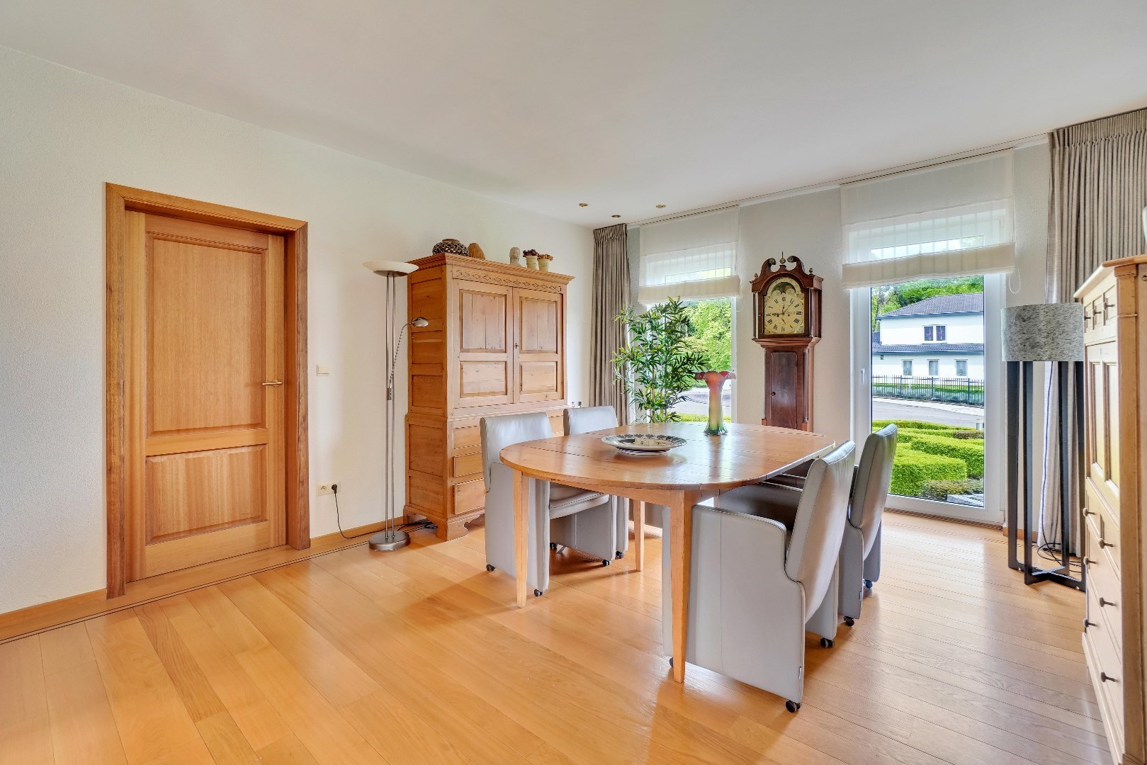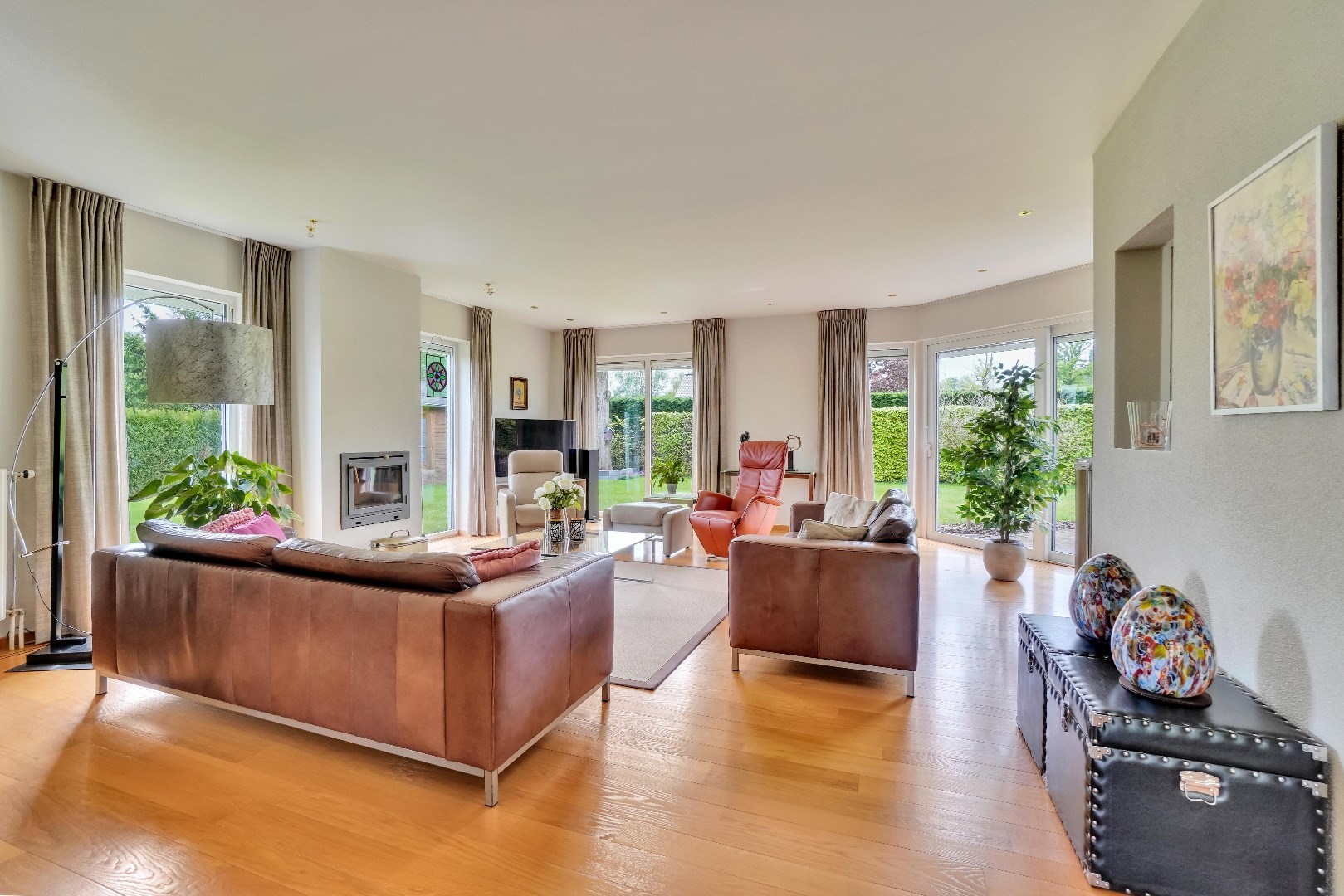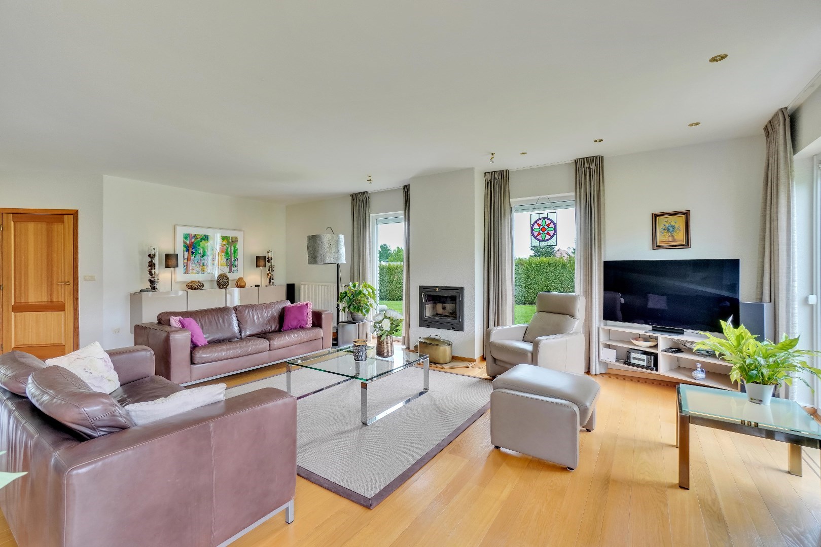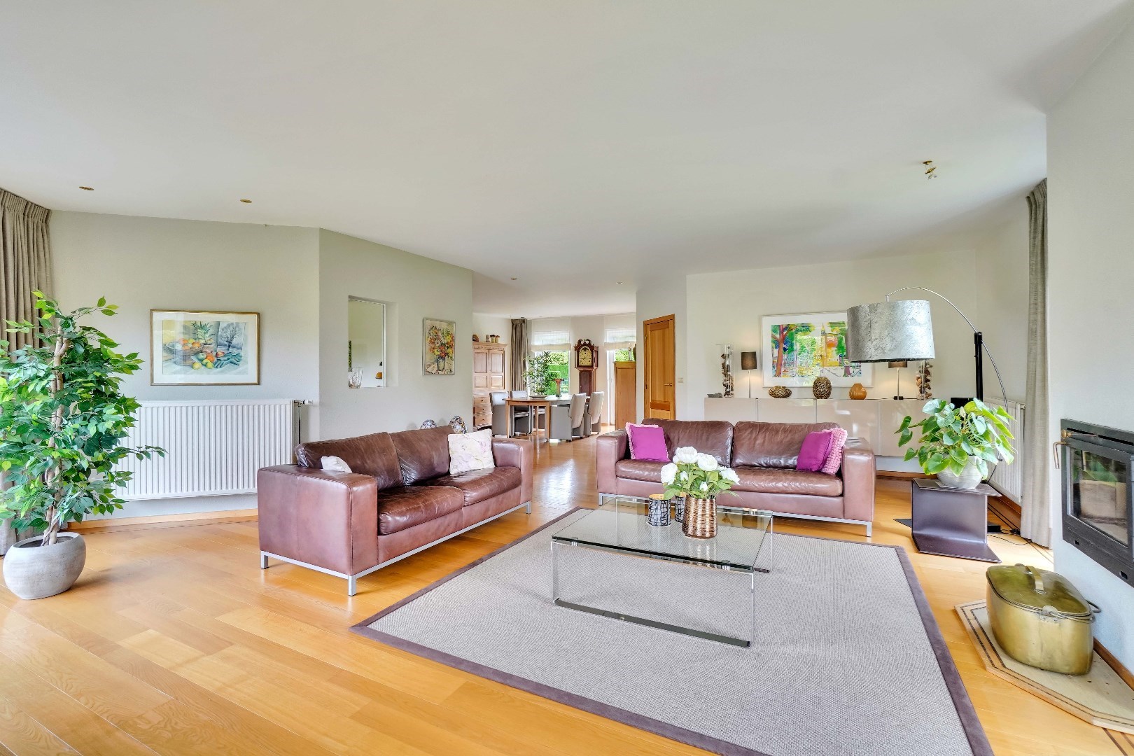 Bij het betreden van de woning, wordt u meteen verwelkomd door een gevoel van elegantie en stijl. Het gelijkvloers van de villa beschikt over een ruime woonkamer met een gezellige houtkachel en een aparte eetruimte, beide verlicht door grote ramen die een overvloed aan natuurlijk licht binnenlaten.