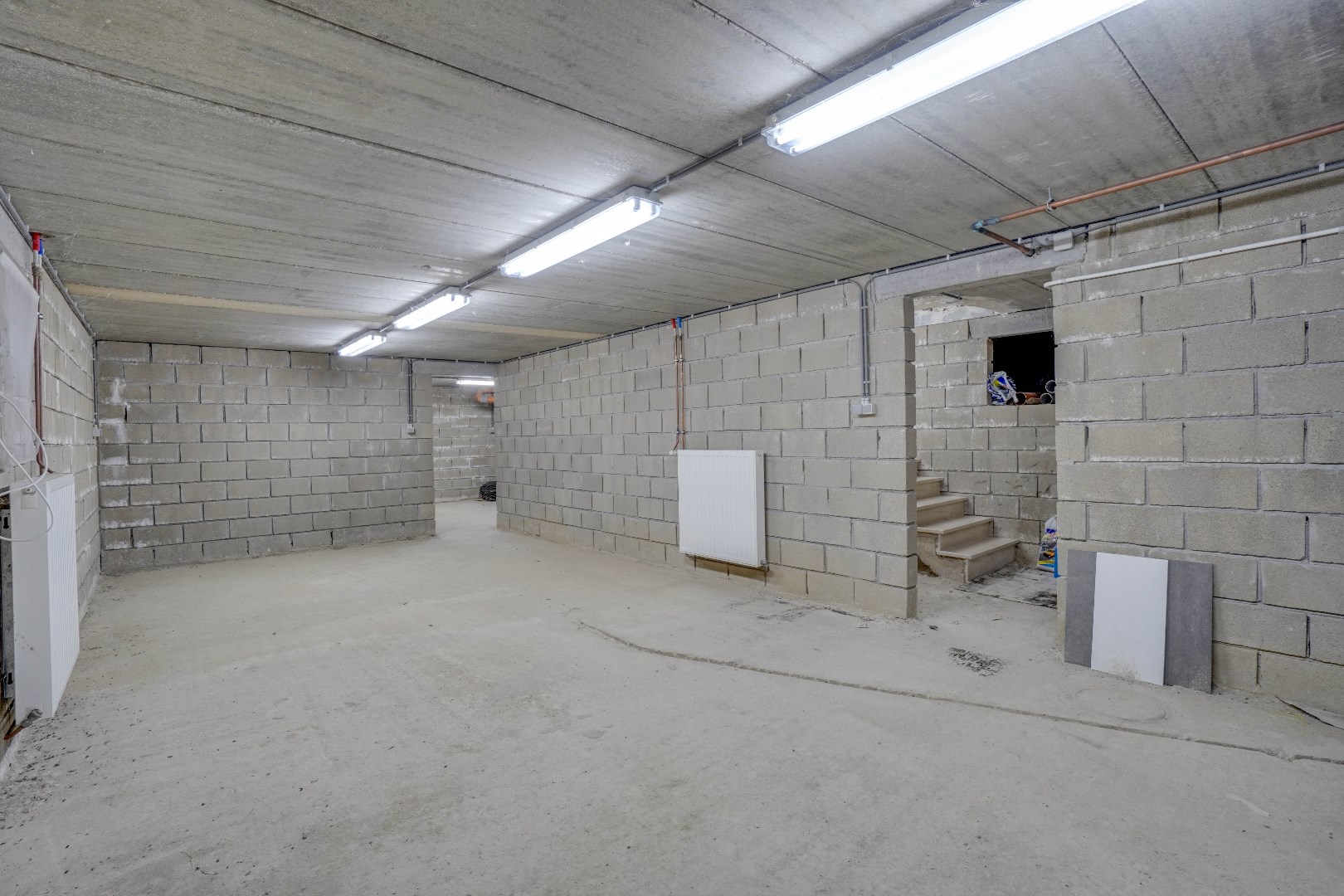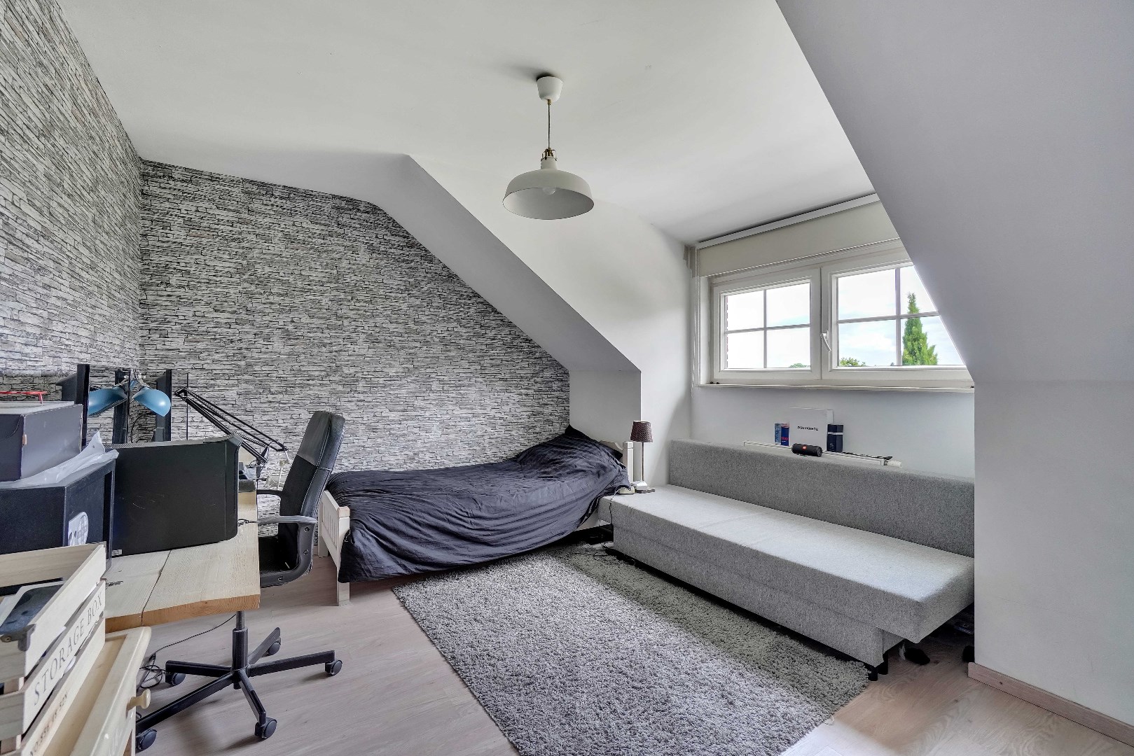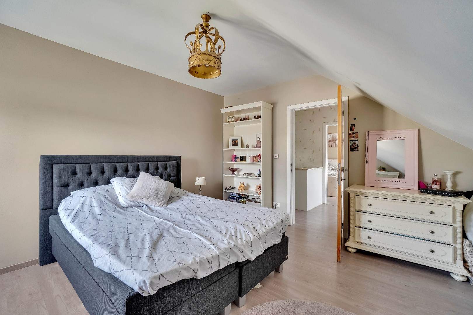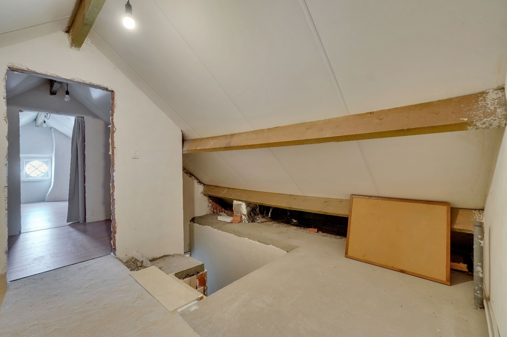 Een vaste trap leidt naar de zolder, dewelke opgedeeld is in 2 ruimtes. Hier zijn reeds aansluitingen voorzien voor een eventuele tweede badkamer.
