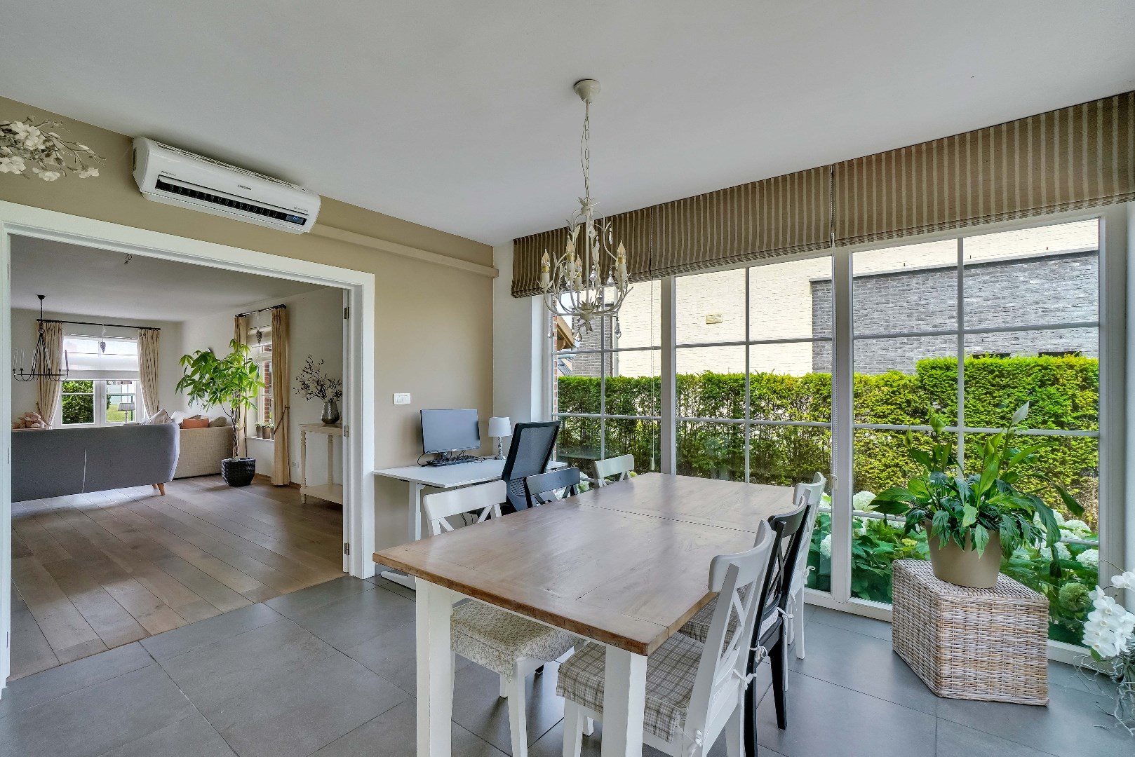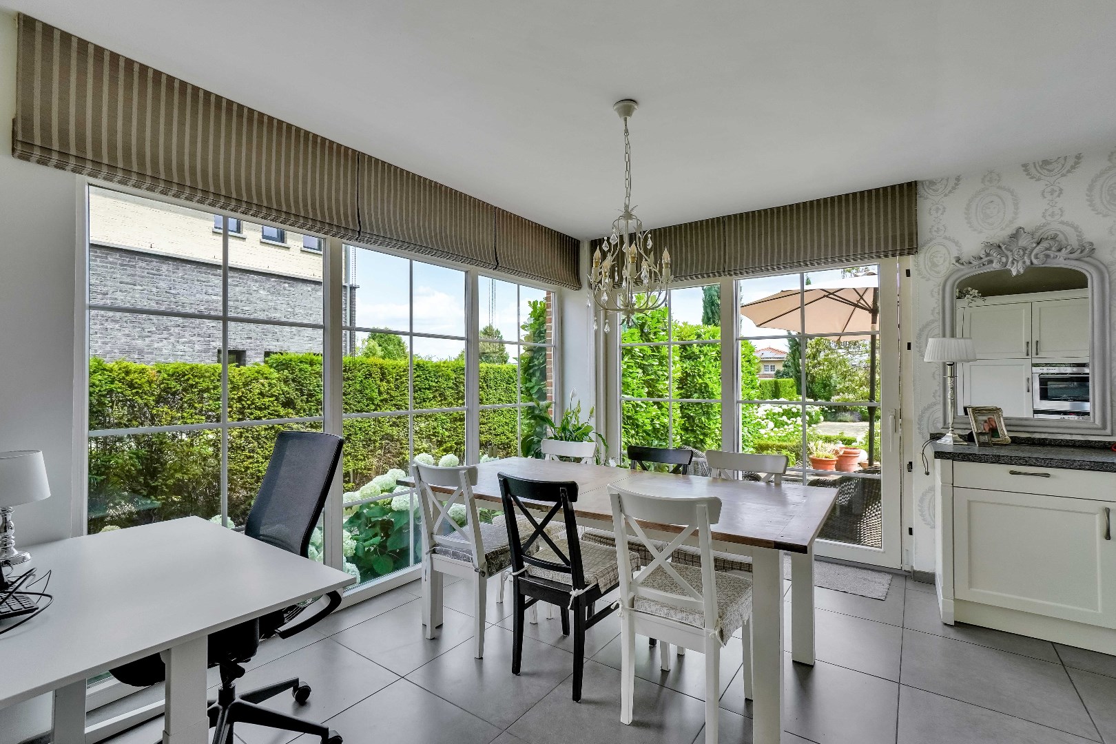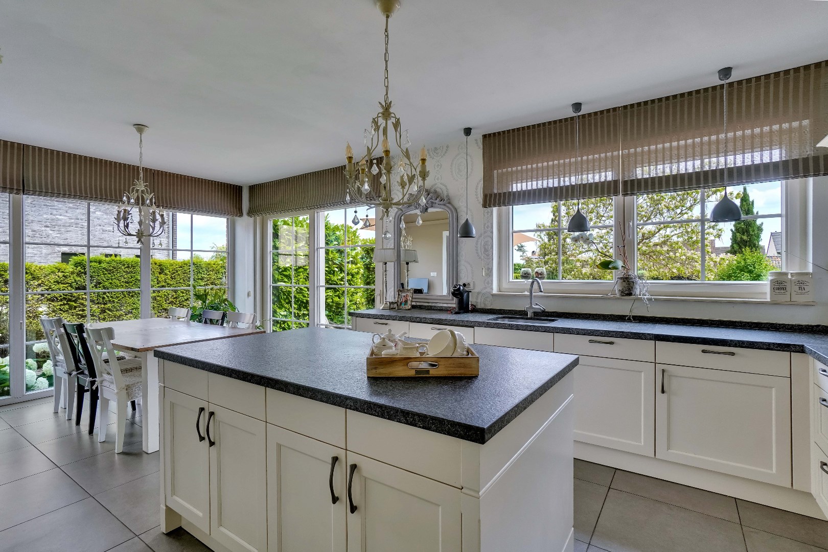 Bij binnenkomst door de hal betreed je de lichte en ruime woonkamer, die directe toegang biedt tot de gezellige eetruimte. Vanuit hier geniet je van het uitzicht op de zuid-oostelijk georiënteerde tuin, waar een prachtige boom in bloei staat. De aangrenzende keuken, opgetrokken uit natuursteen, is voorzien van een inductiekookplaat, ingebouwde koelkast, ingebouwde vaatwasser en oven. Alle apparatuur is van het merk Siemens. Daarnaast is er ook een wasplaats, dewelke van voldoende opbergruimte voorzien is.