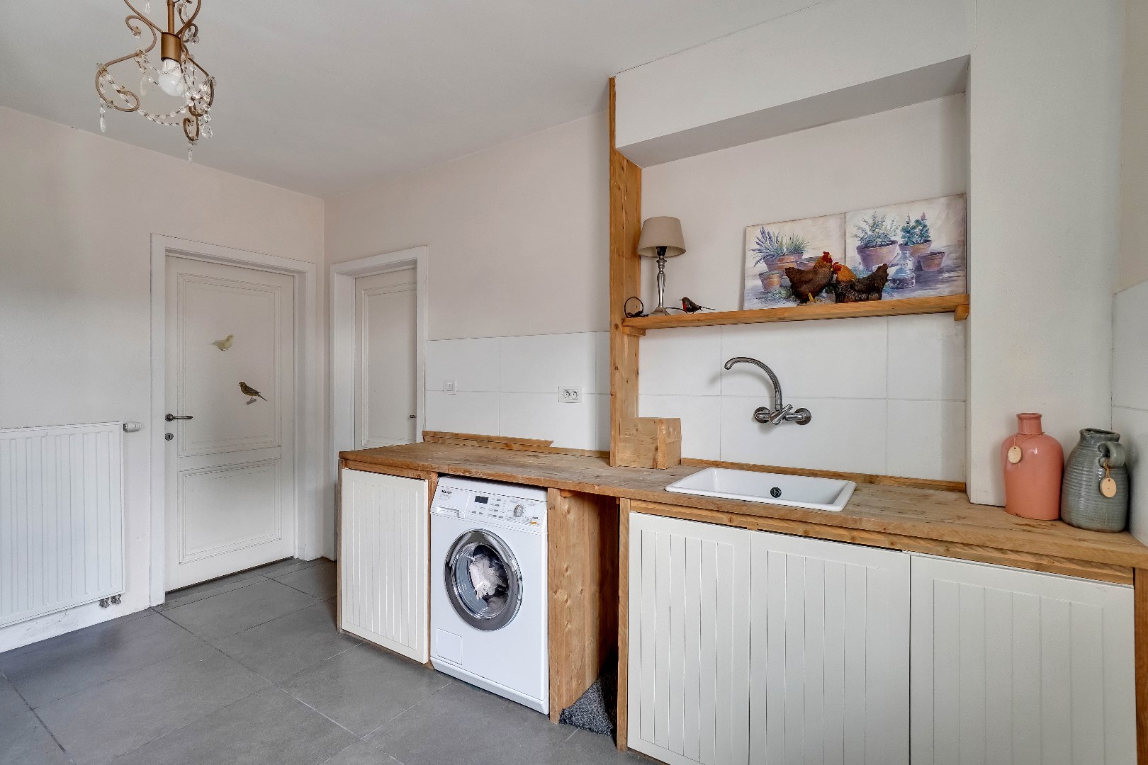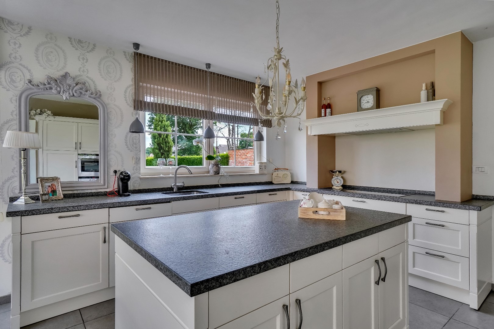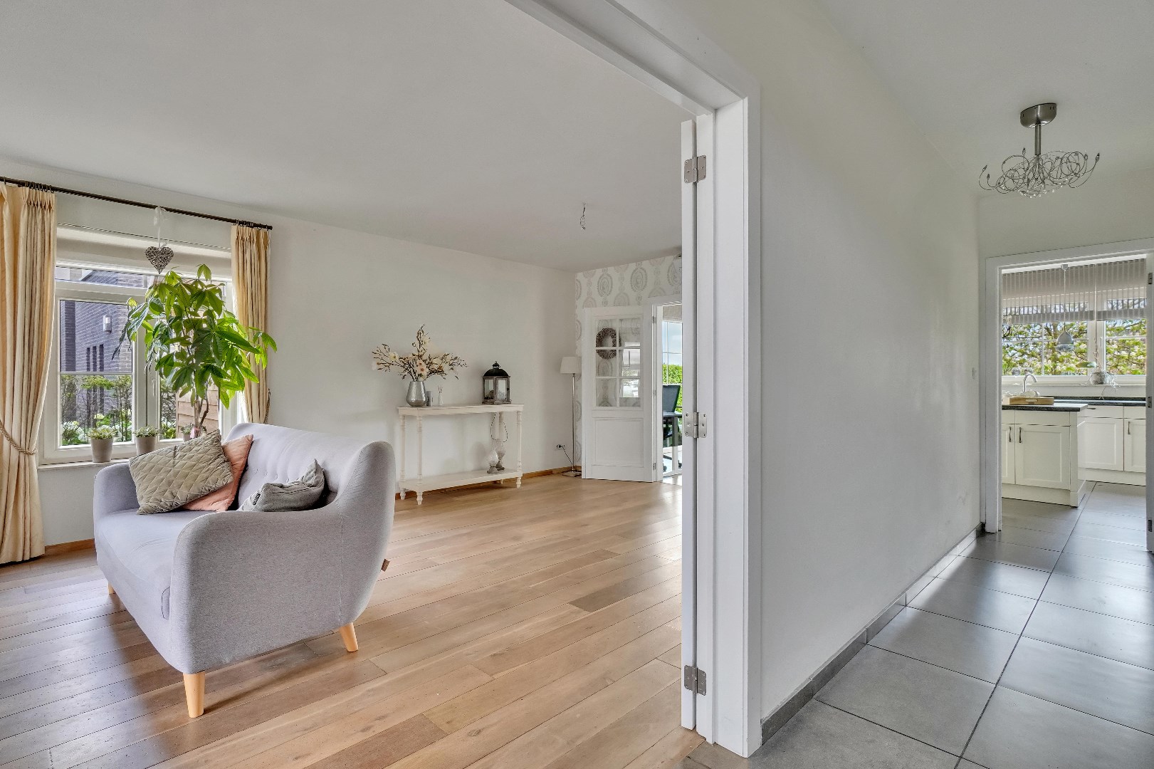 Bij binnenkomst door de hal betreed je de lichte en ruime woonkamer, die directe toegang biedt tot de gezellige eetruimte. Vanuit hier geniet je van het uitzicht op de zuid-oostelijk georiënteerde tuin, waar een prachtige boom in bloei staat. De aangrenzende keuken, opgetrokken uit natuursteen, is voorzien van een inductiekookplaat, ingebouwde koelkast, ingebouwde vaatwasser en oven. Alle apparatuur is van het merk Siemens. Daarnaast is er ook een wasplaats, dewelke van voldoende opbergruimte voorzien is.