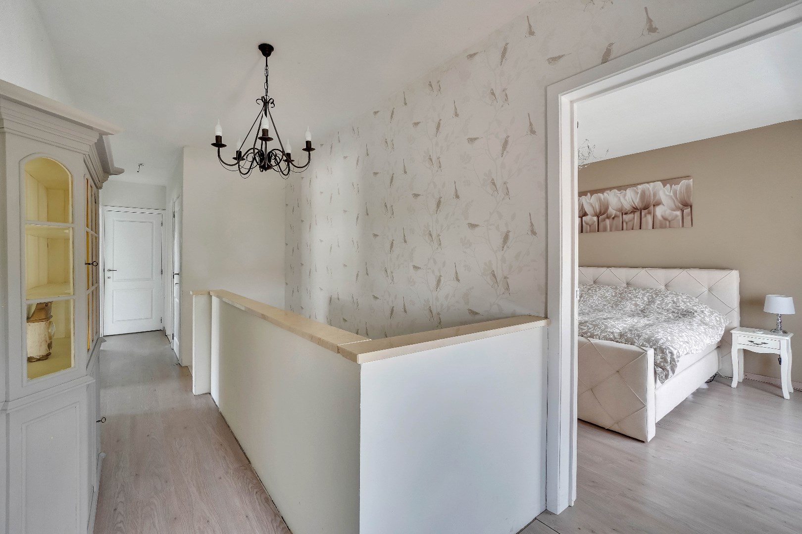 Op de eerste verdieping bevinden zich 4 ruime slaapkamers en een badkamer. De masterbedroom is voorzien van een handige inloopkast. De badkamer is uitgerust met een dubbele lavabo en een bad met jacuzzi-functie. Het toilet bevindt zich in een aparte ruimte.