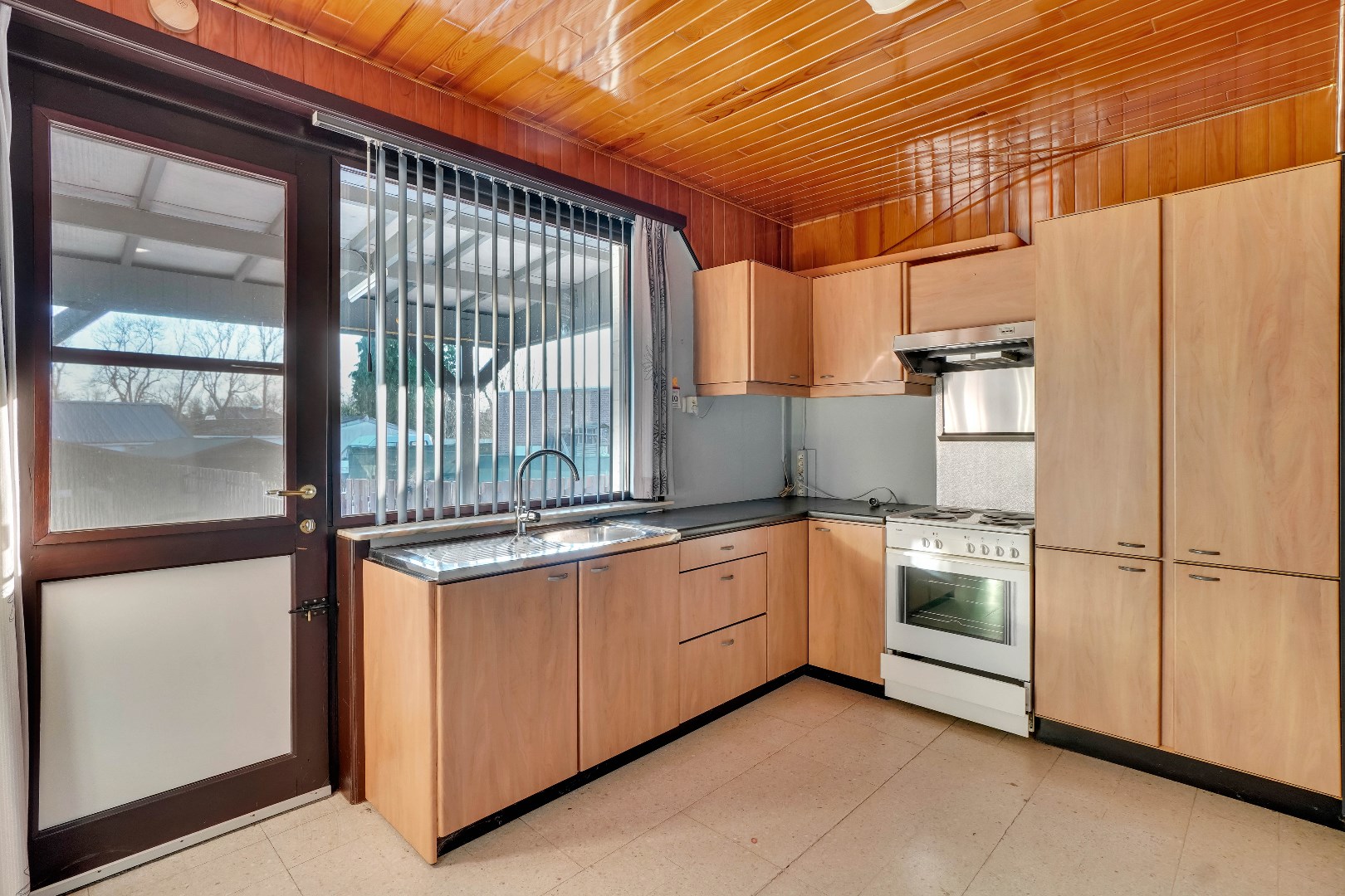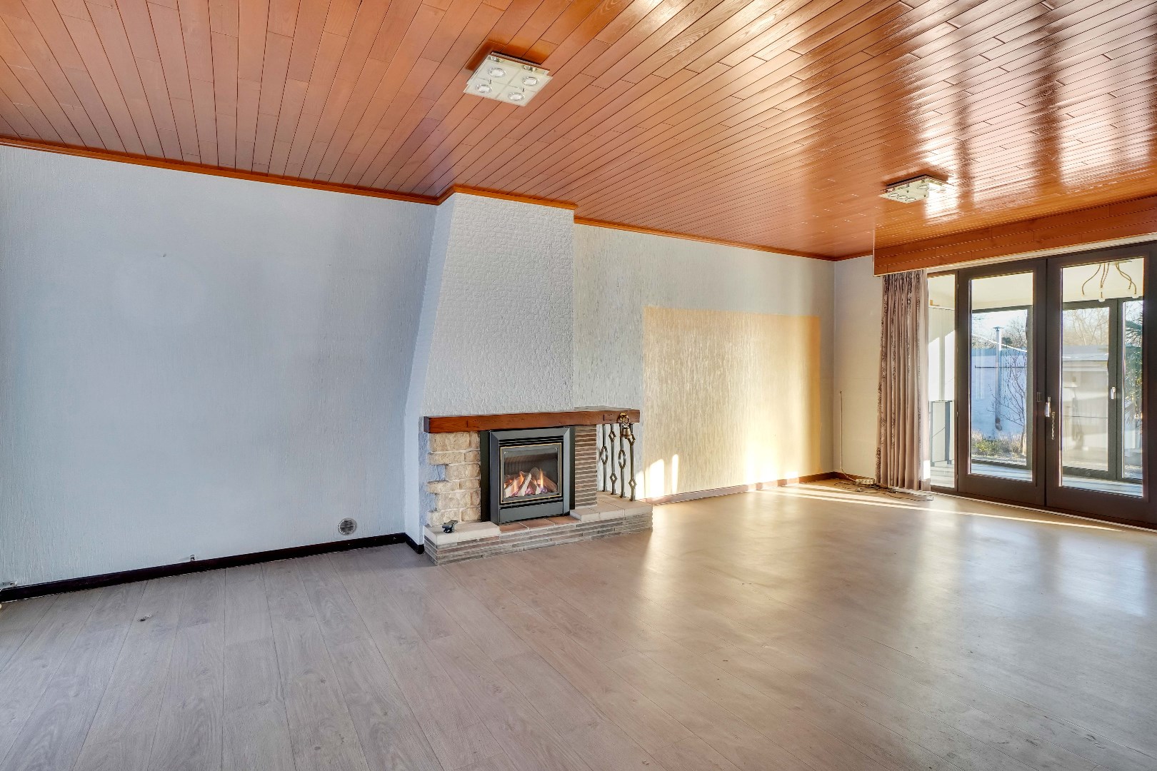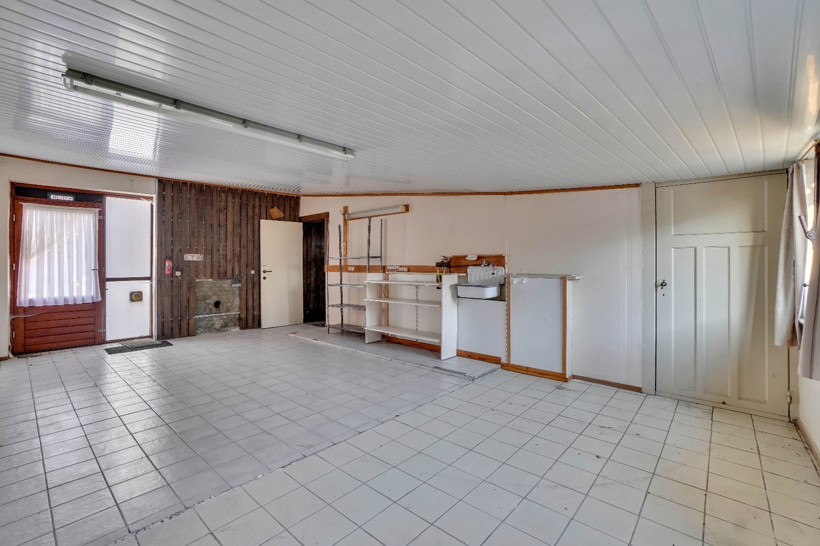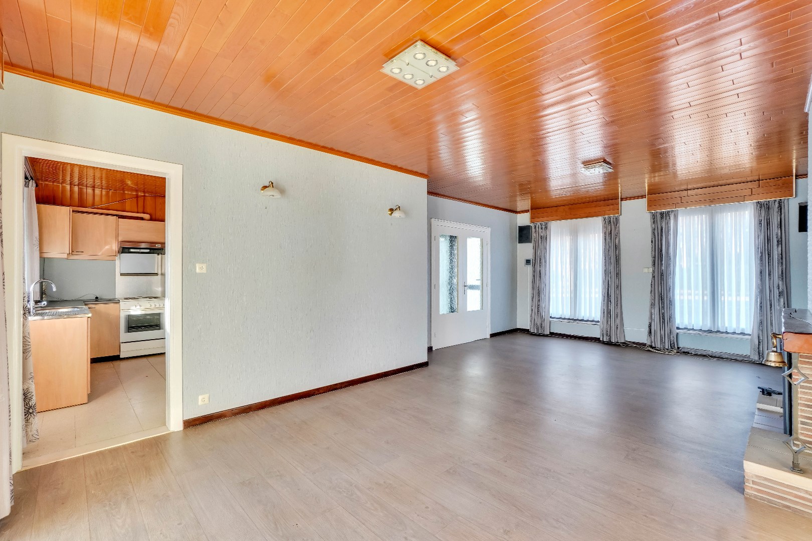 Bij het betreden van de woning word je verwelkomd door de leefruimte, gekenmerkt door een sfeervolle gashaard. Deze ruimte is voldoende groot om een woon- en eetkamer in te richten. Aan de leefruimte is er een aangrenzende veranda, omgeven door ramen, dewelke een naadloze overgang creëert tussen binnen en buiten. De keuken is strategisch geplaatst langs de leefruimte en biedt directe toegang tot de tuin.
