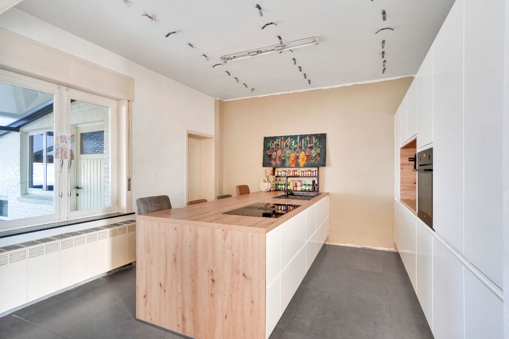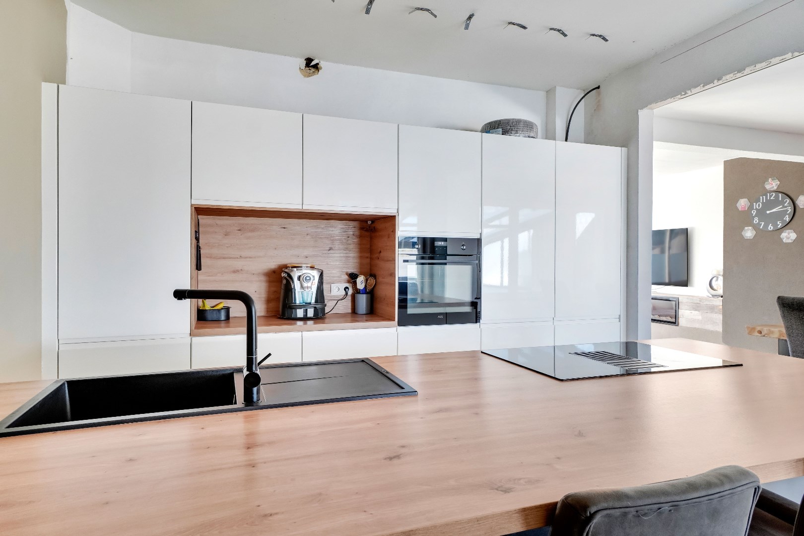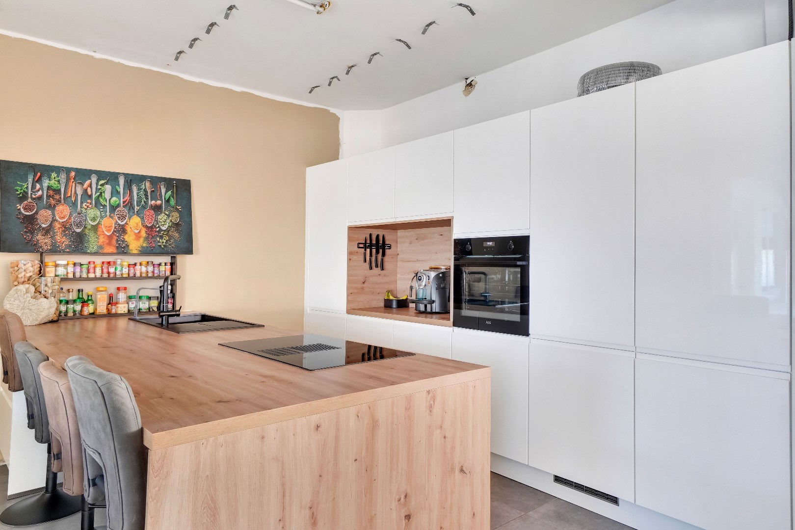 De naadloze overgang leidt naar de gloednieuwe keuken, compleet met een keukeneiland en voorzien van hoogwaardige AEG-apparatuur, waaronder een inductie kookplaat, ingebouwde koelkast, afwasmachine en oven.