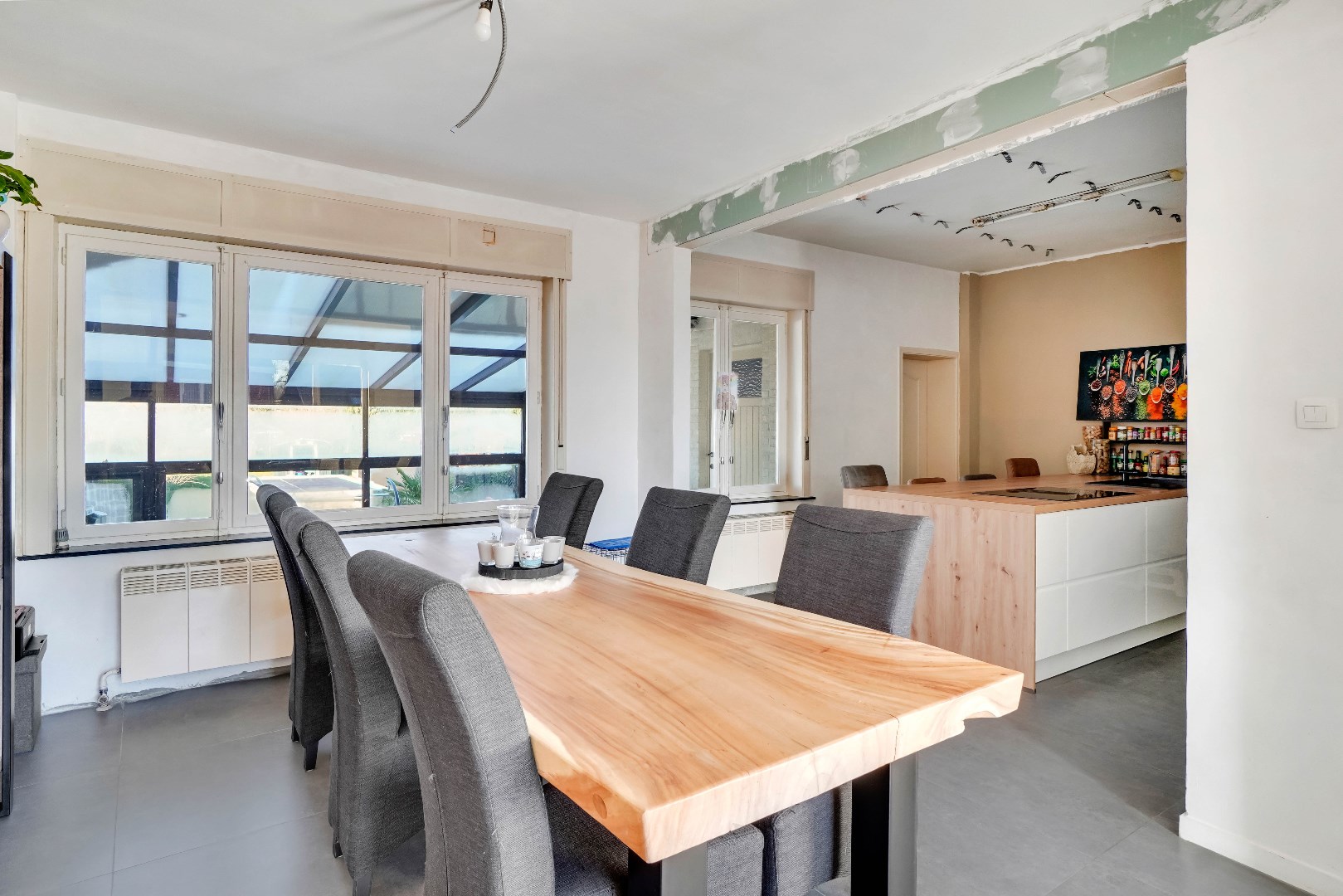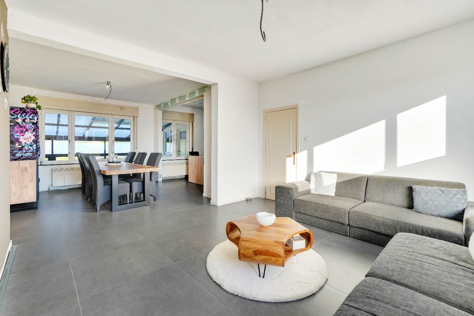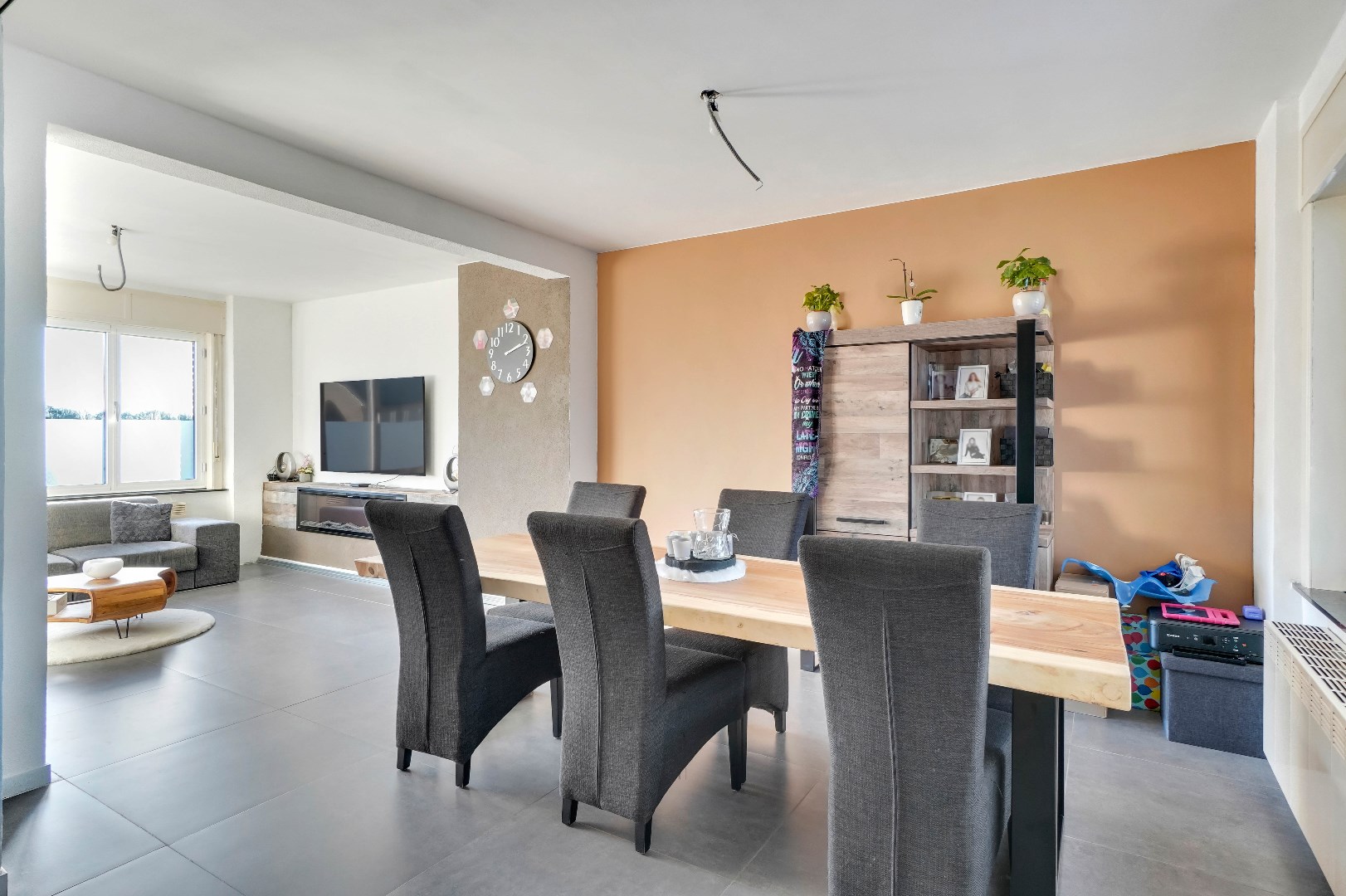 Bij het betreden van de woning wordt u verwelkomd in de vernieuwde woonkamer met aangrenzende eetkamer.