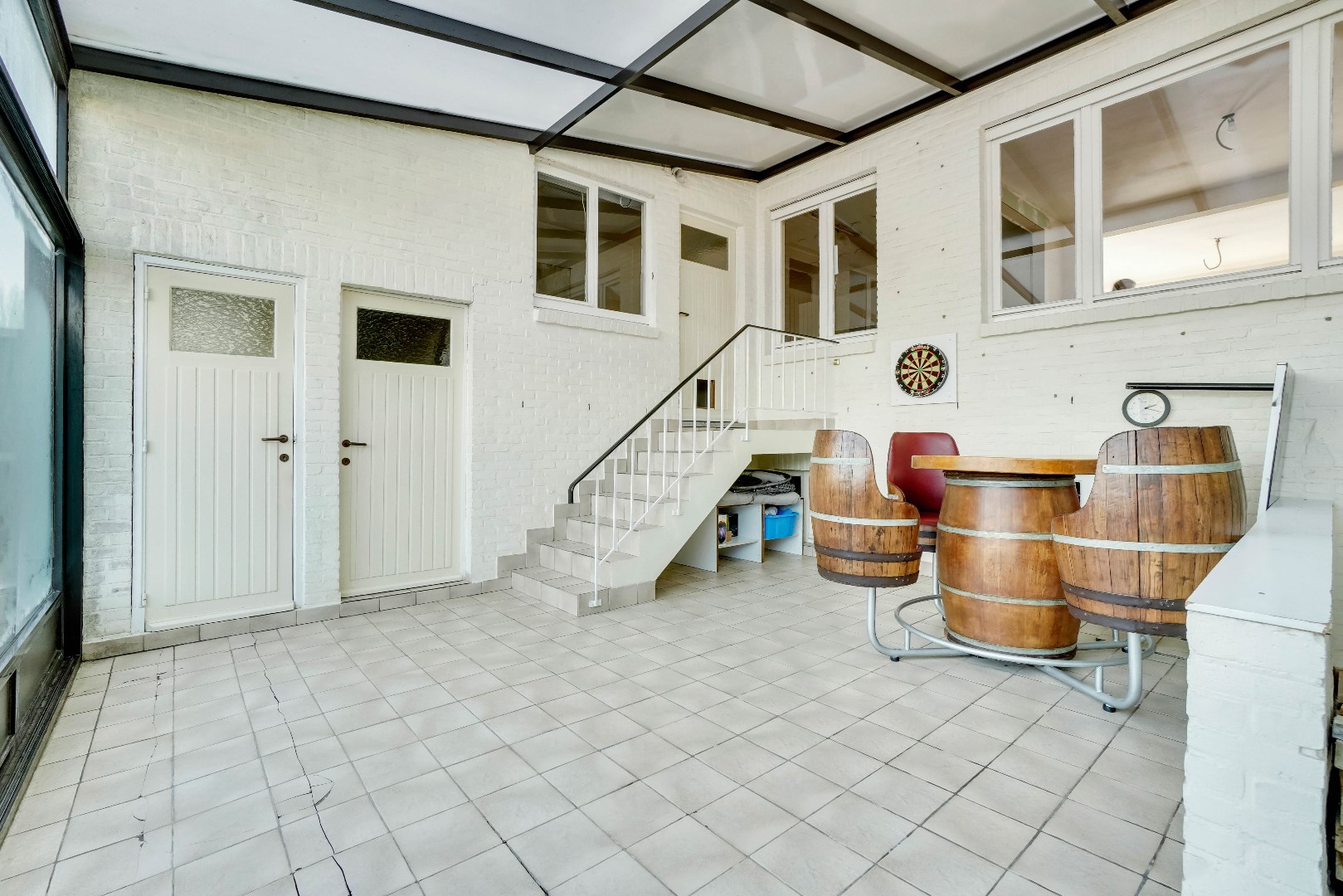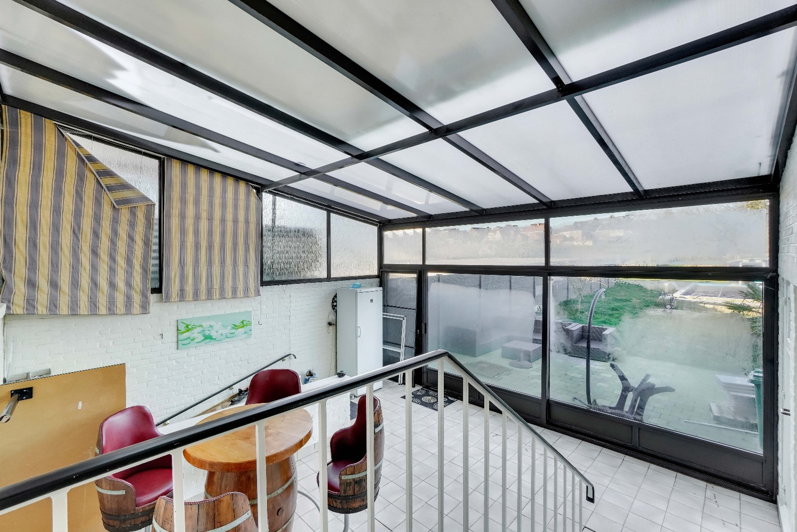De woning biedt extra ruimte met een veranda, waarvan de functie volledig naar uw behoeftes kan worden ingevuld. Hier bevindt zich tevens een handige bergruimte en toegang tot de inpandige garage. Vanuit de veranda stapt u de riante tuin in, dewelke noord-westelijk is georiënteerd en beschikt over een terras, een verwarmd zwembad en een groot grasveld met volwassen bomen en een serre.
