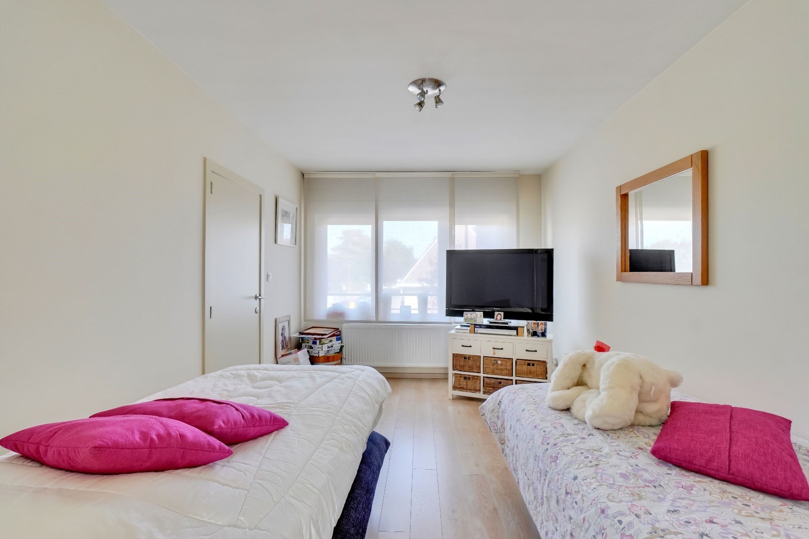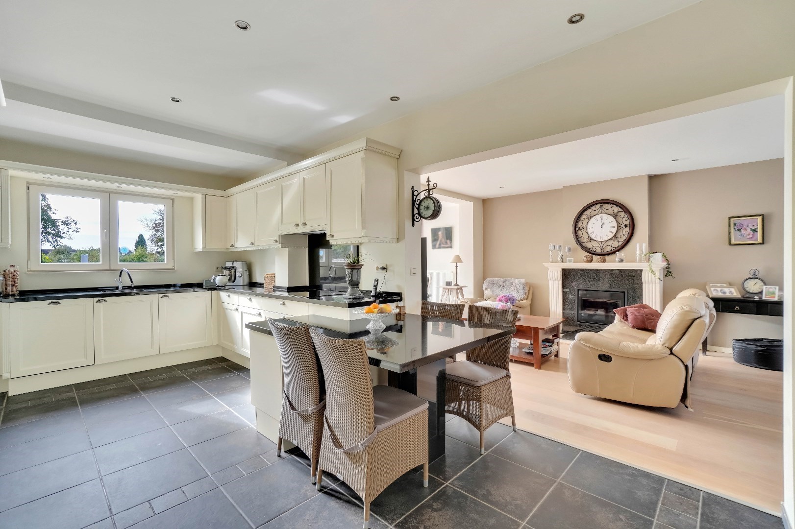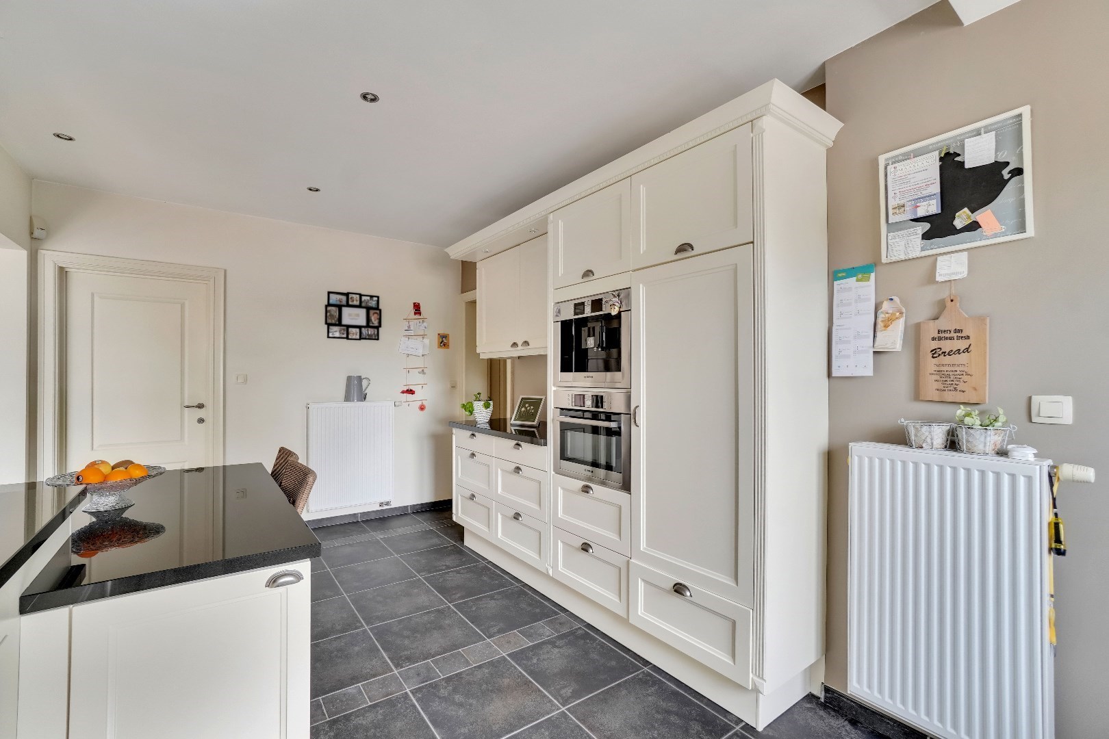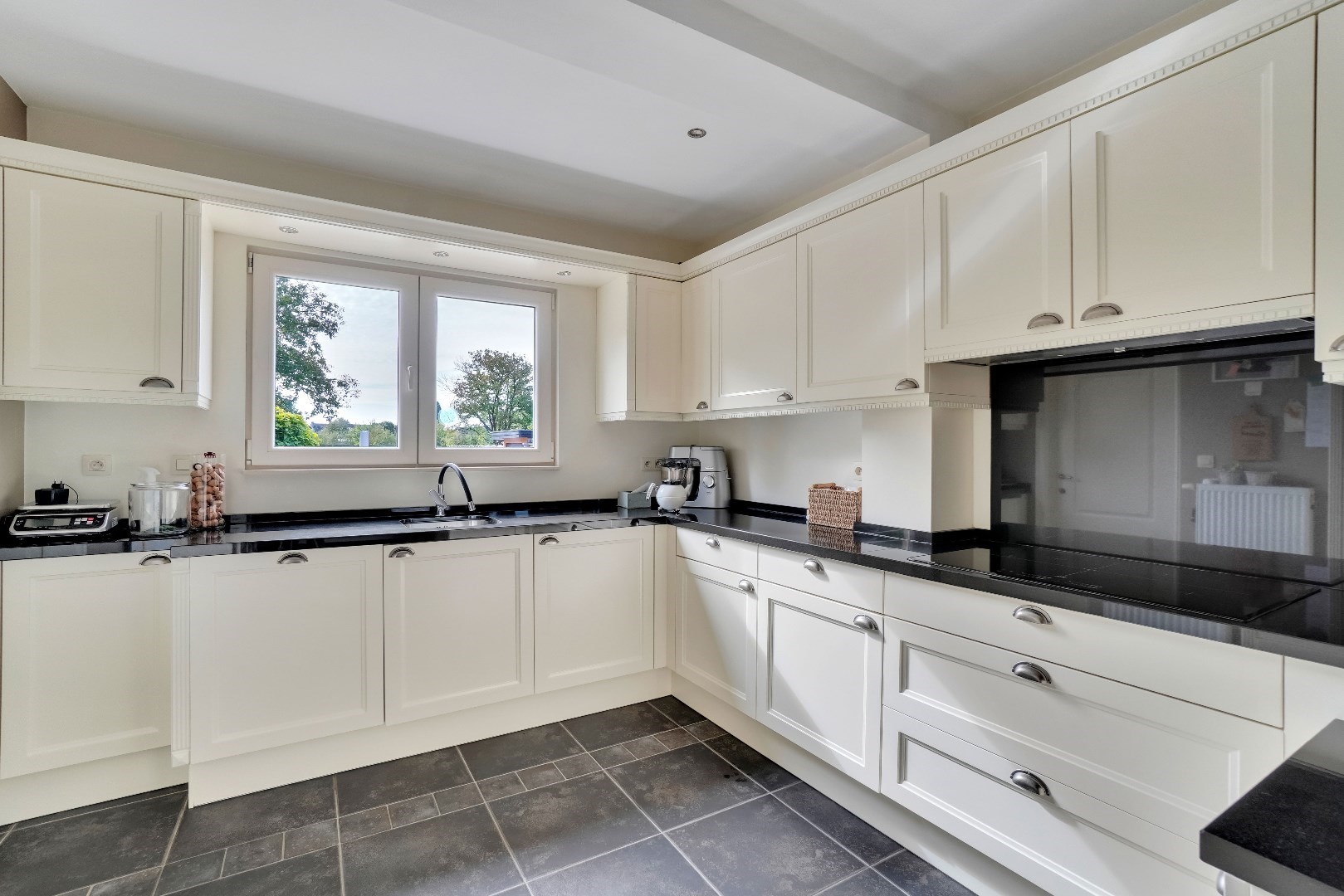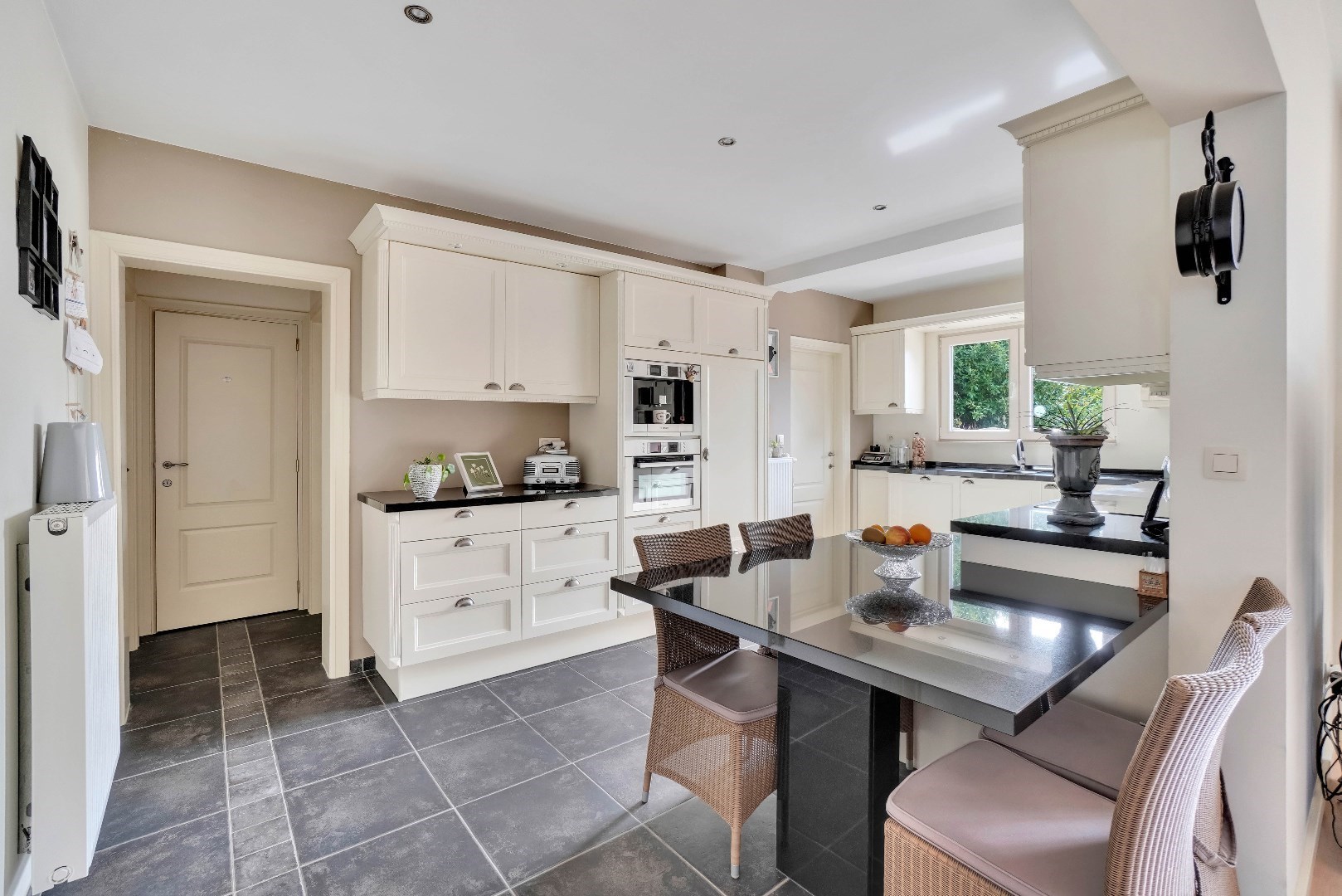 Grenzend aan de woonkamer bevindt zich de U-vormige keuken, dewelke uitgerust is met moderne voorzieningen zoals een inductiekookplaat, ingebouwde koelkast, vaatwasser, oven, magnetron en ingebouwd koffieapparaat. Daarnaast biedt de keuken ook voldoende ruimte voor een ontbijthoek.