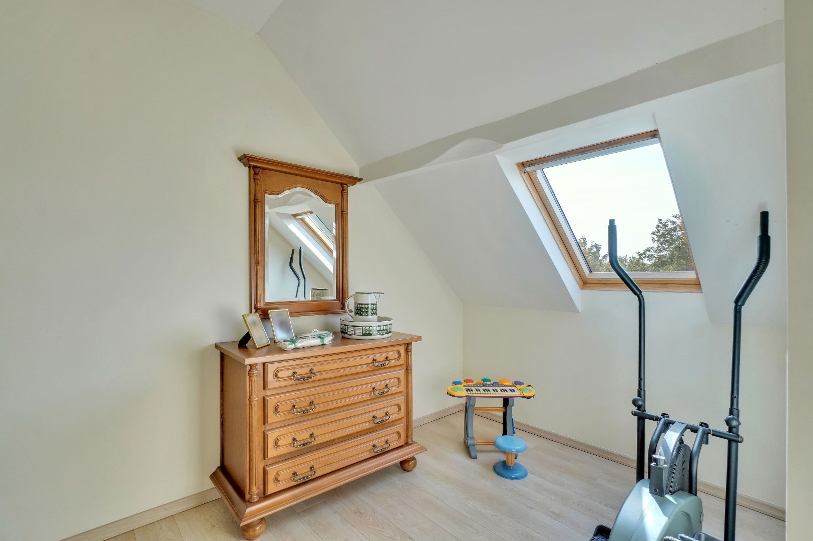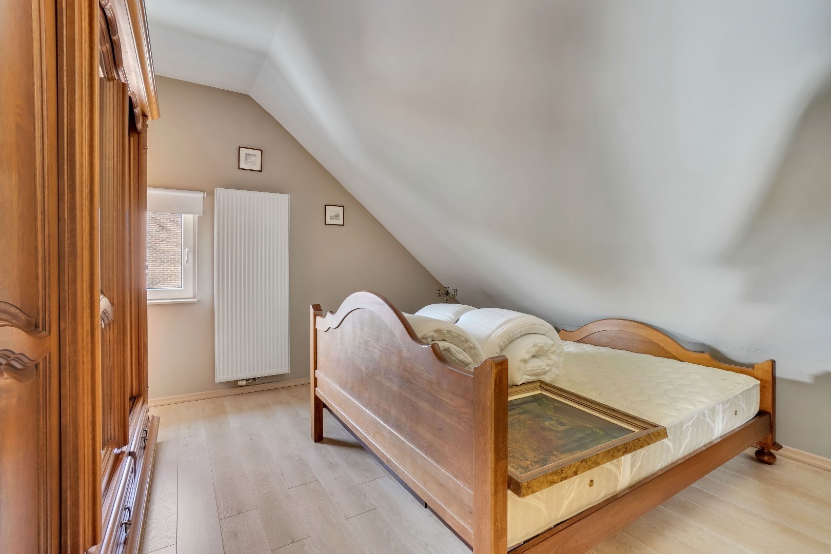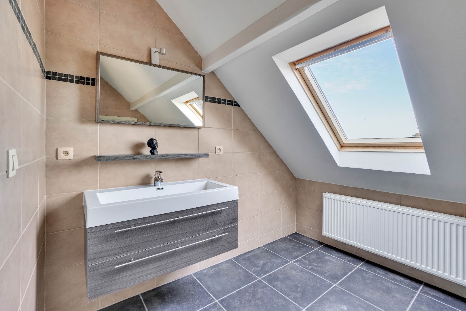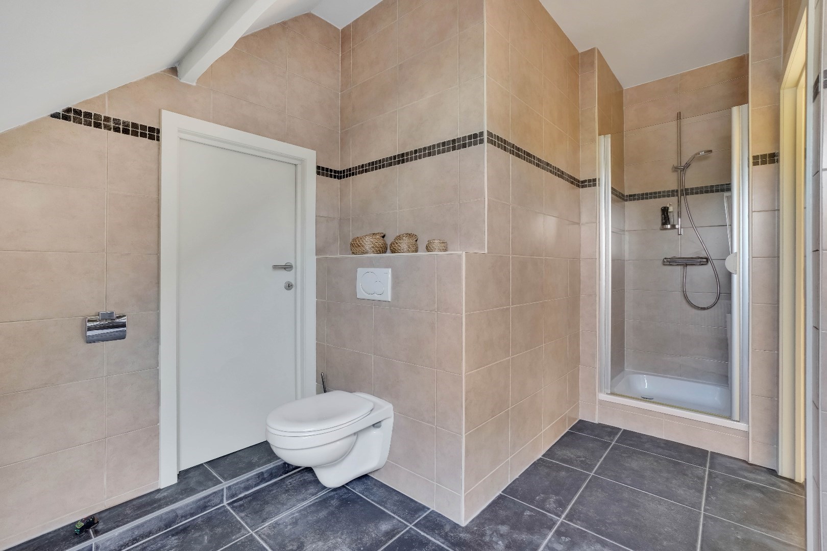 De zolderverdieping voorziet 2 slaapkamers en een badkamer met een wastafel, douche en toilet.