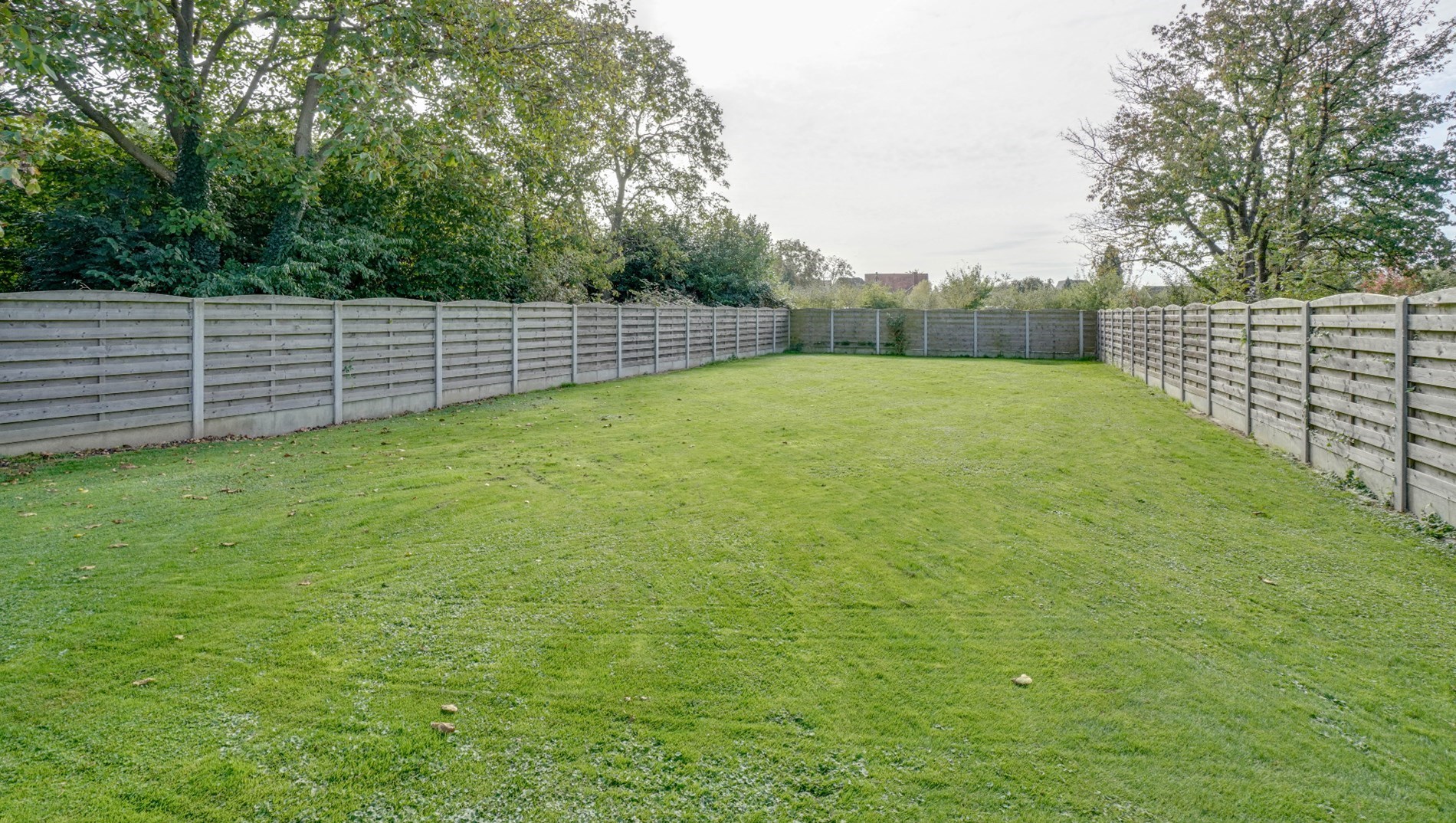 De zuidelijk georiënteerde tuin bestaat uit een terras en een riant grasveld met verwarmd zwembad en overdekte lounge.