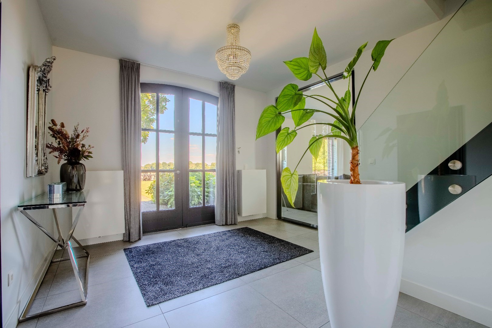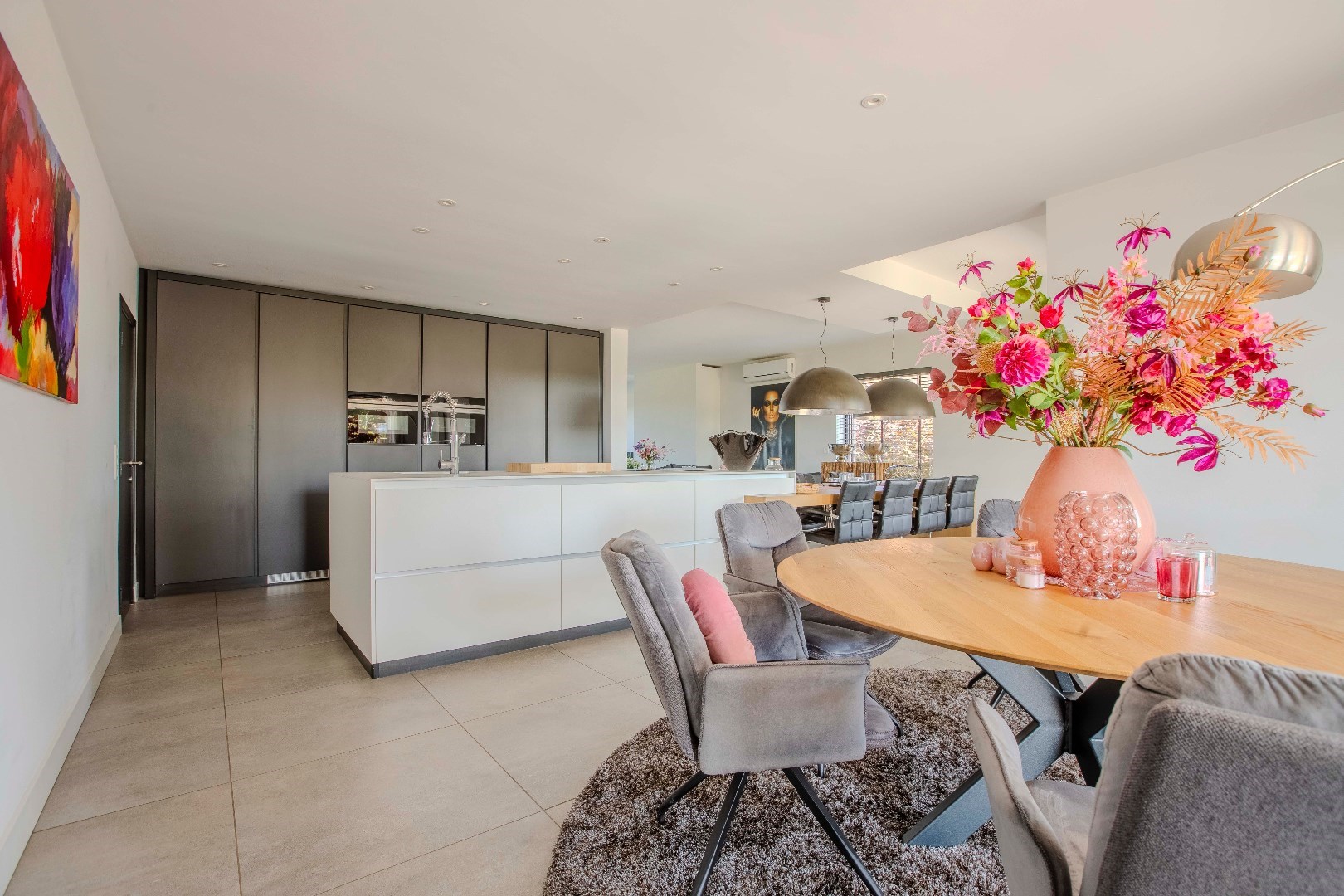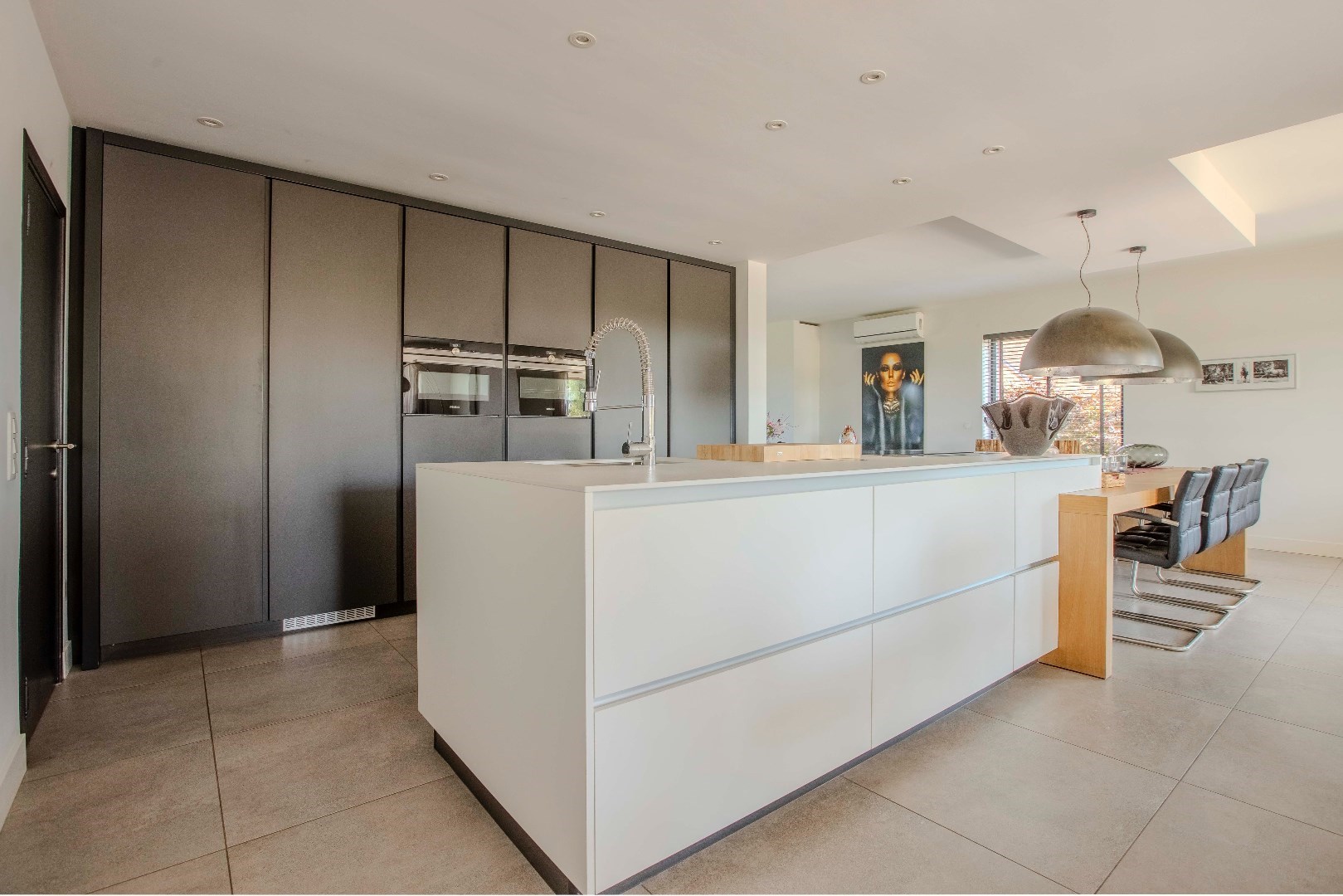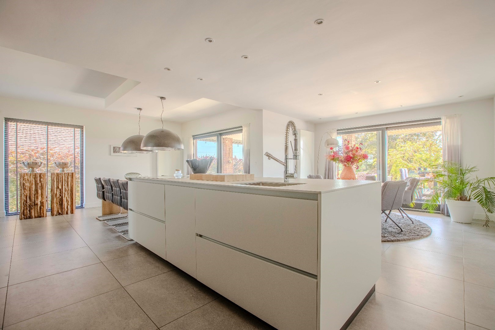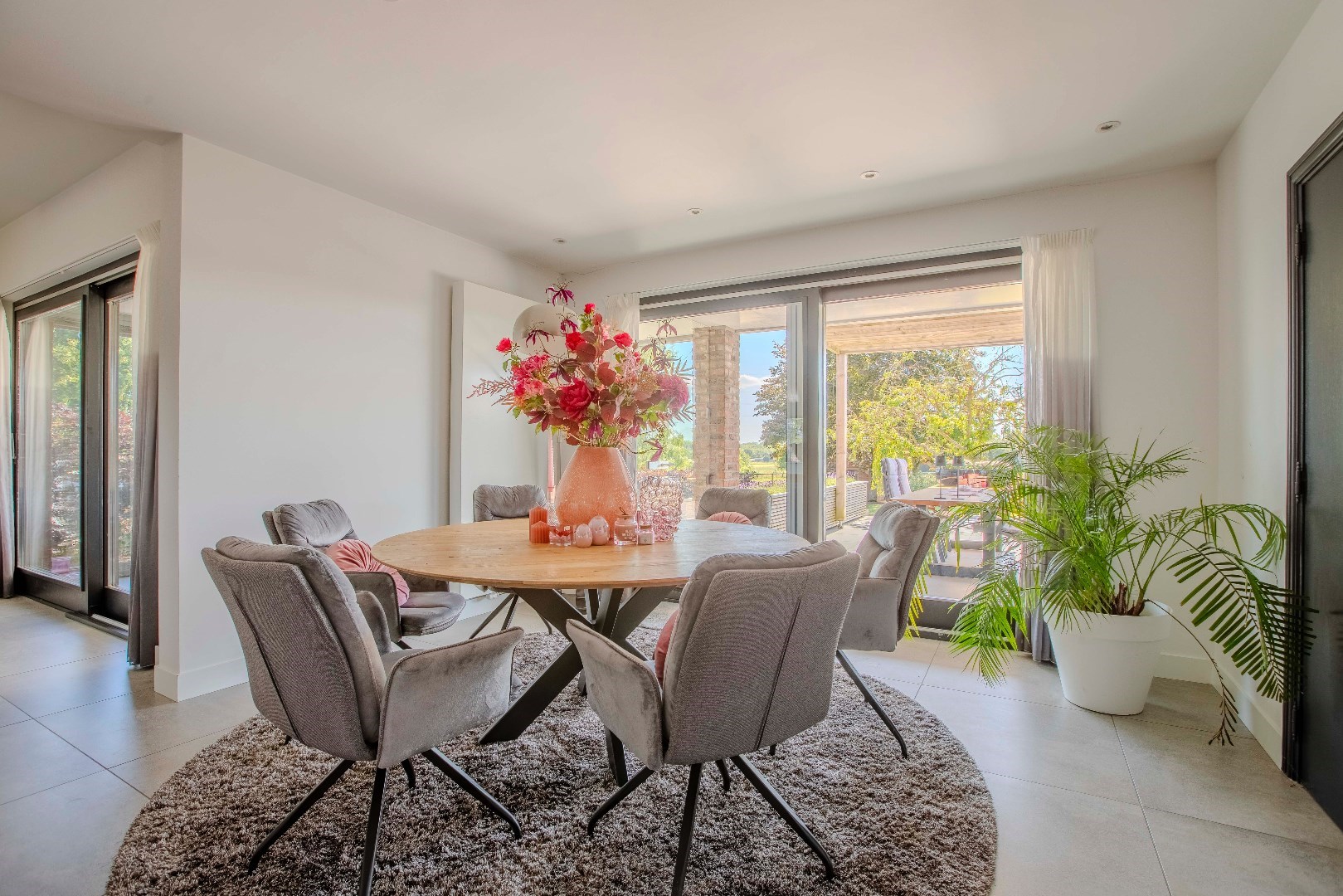 De woonkamer is naadloos verbonden met de eetkamer en keuken. Dit zorgt voor een ruimtelijk gevoel, mede dankzij de grote raampartijen dewelke zicht bieden op de uitgestrekte weilanden. De keuken is voorzien van alle moderne gemakken, waaronder een inductie kookplaat, ingebouwde koelkast, ingebouwd afwasmachine en combi-oven, allemaal van het merk Siemens.