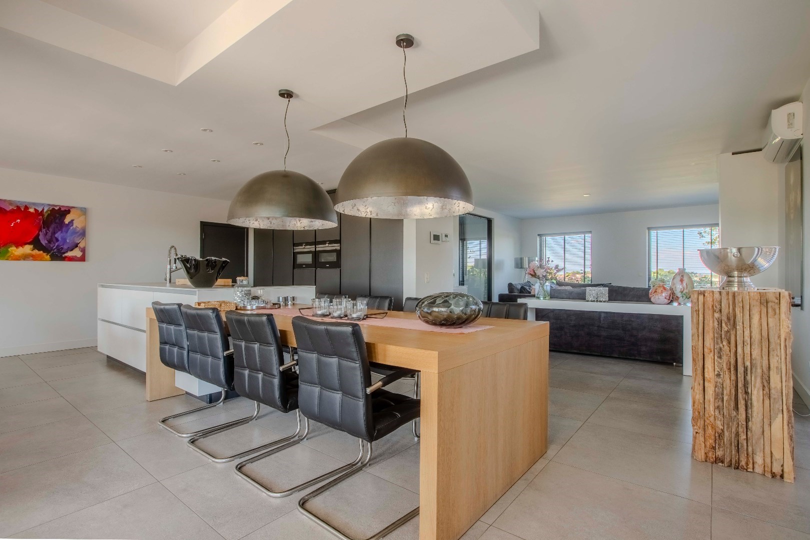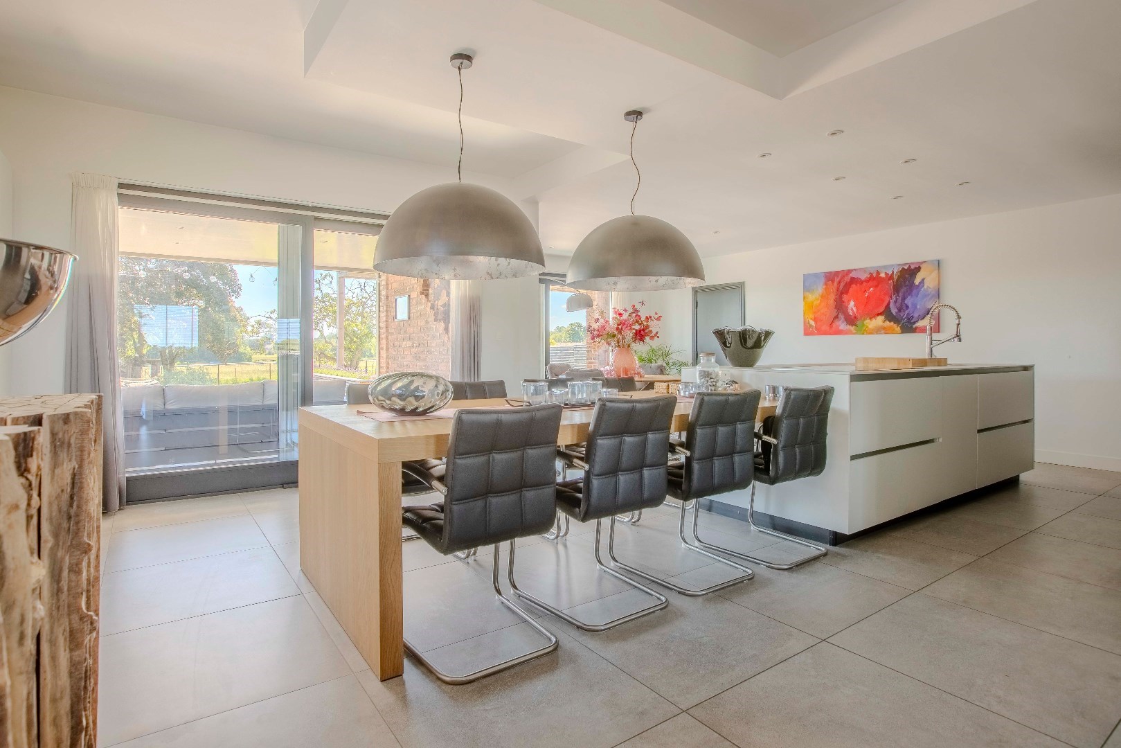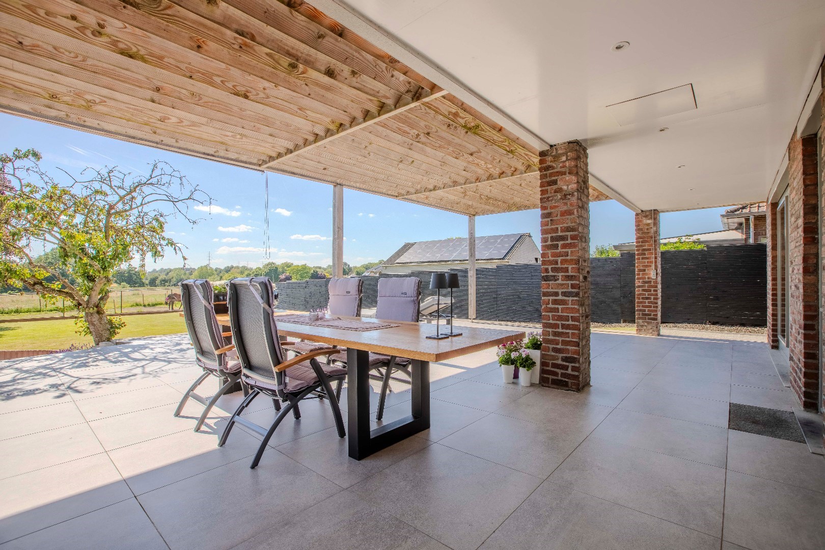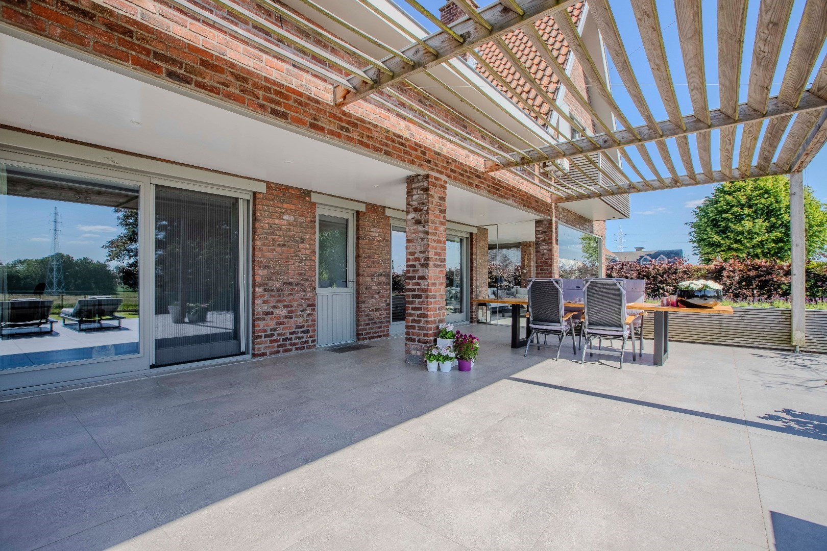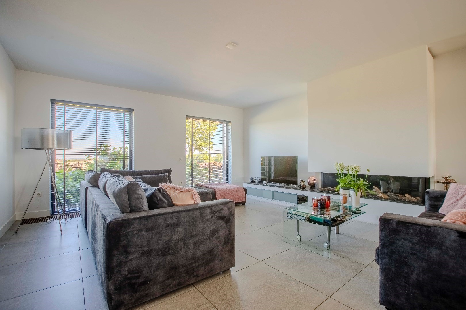 De woonkamer is naadloos verbonden met de eetkamer en keuken. Dit zorgt voor een ruimtelijk gevoel, mede dankzij de grote raampartijen dewelke zicht bieden op de uitgestrekte weilanden. De keuken is voorzien van alle moderne gemakken, waaronder een inductie kookplaat, ingebouwde koelkast, ingebouwd afwasmachine en combi-oven, allemaal van het merk Siemens.