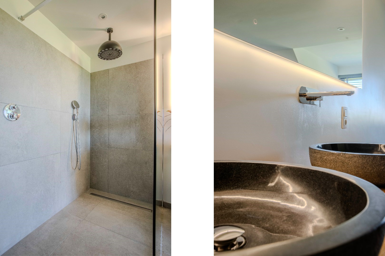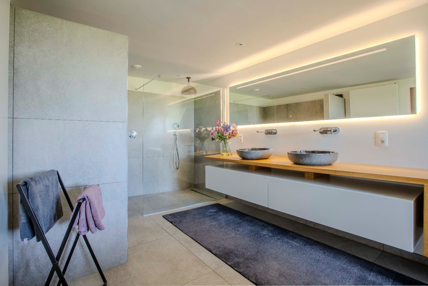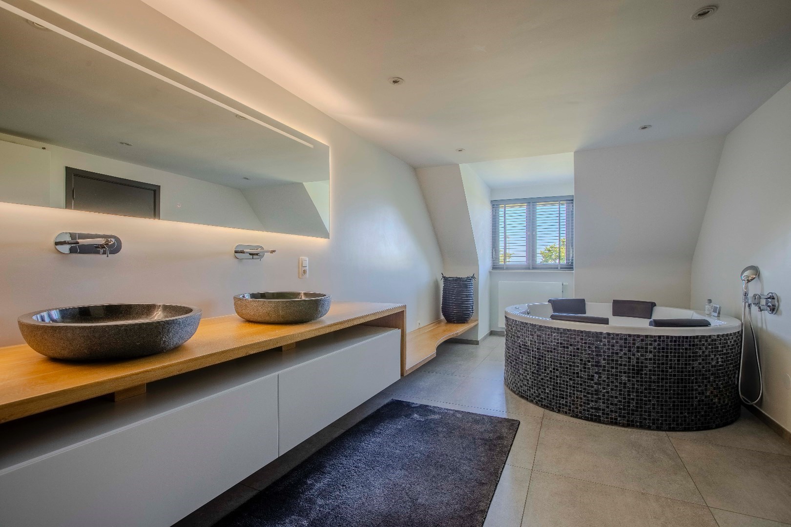 De badkamer is van alle gemakken voorzien, er is namelijk een dubbele lavabo, inloopdouche met infrarood en jacuzzi-bad aanwezig. Het toilet bevindt zich in een aparte ruimte.