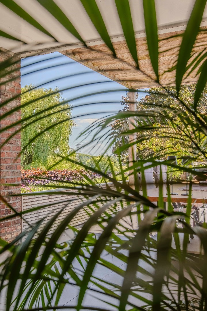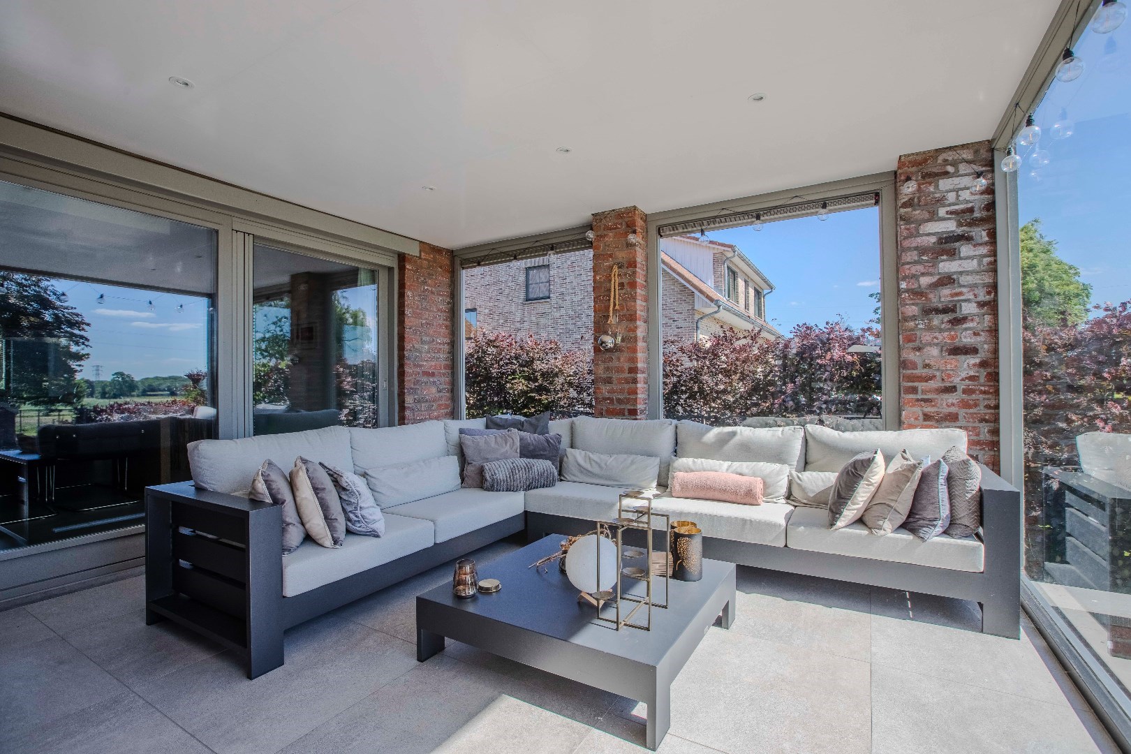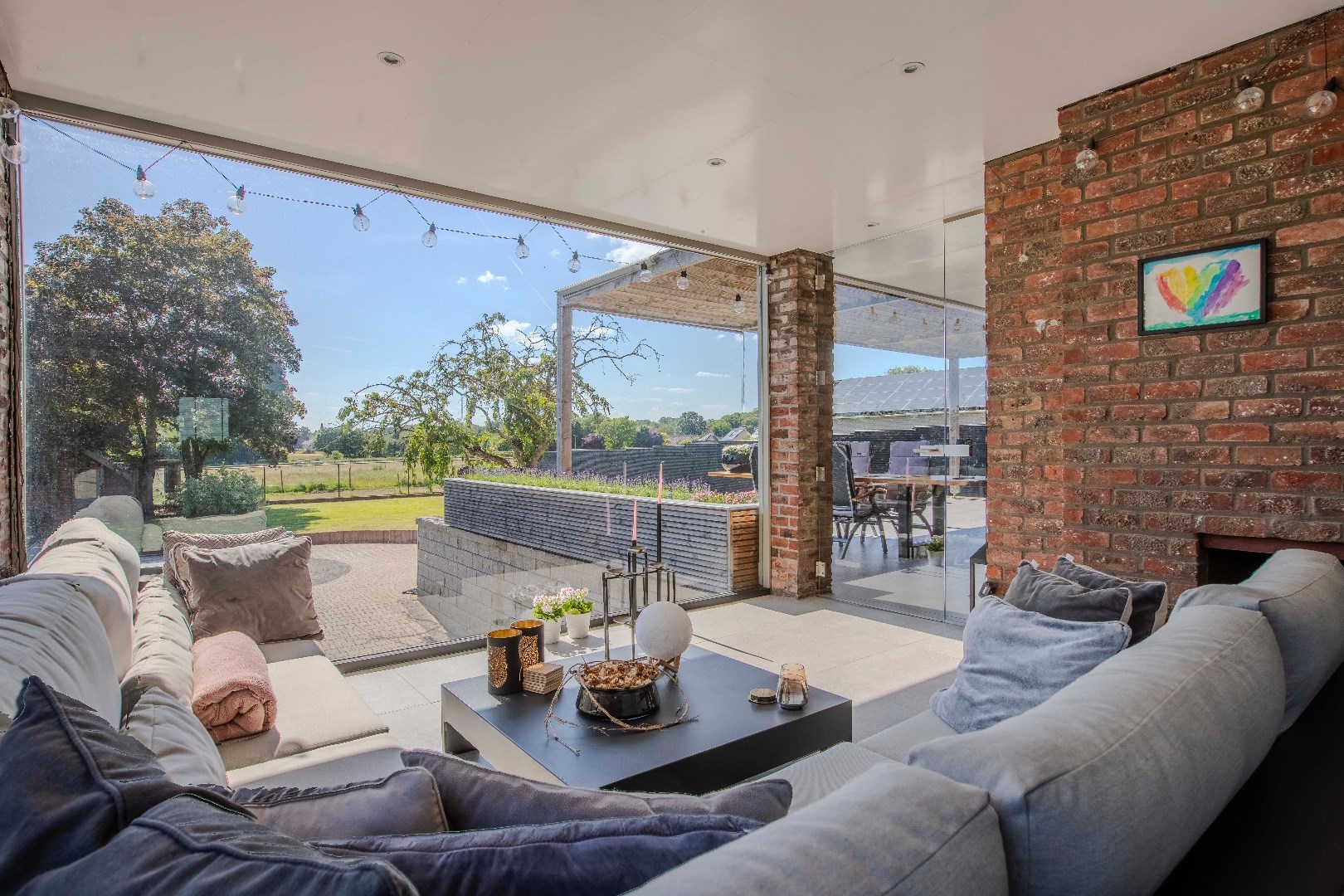 De veranda is ingericht met een gezellige gashaard, waardoor het heel het jaar heerlijk vertoeven is met zicht op groen.